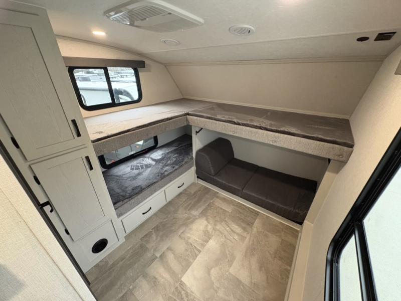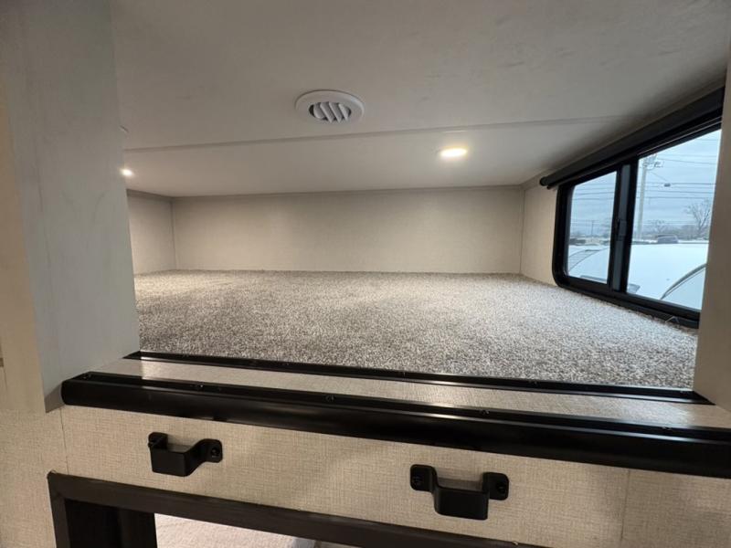 A front bunkhouse model with a private full bath, how nice! The children will love bringing along their friends with this spacious Chaparral fifth wheel. It even has a loft for added space or storage. The front bunk room features a cube sofa with a 30" x 62" bunk overhead, and 30" x 74" bunks off to the side. The full bath is located within the bunkhouse space and features a tub/shower, toilet and sink. There is also wardrobe space for clothing. Down on the main level, the combined kitchen and living area features one large slide including a theater seat and free spanning table for four. A nice center island features a sink so you can visit while prepping dinner or doing the dishes. There is also a tri-fold sofa in this space for seating and added sleeping. The rear features a master bedroom and second full bath including a king bed slide out! The full rear bath includes a vanity with two sinks, a toilet and a large shower with seat. The loft is above the rear master bedroom area and could sleep one more, or be used for added storage!