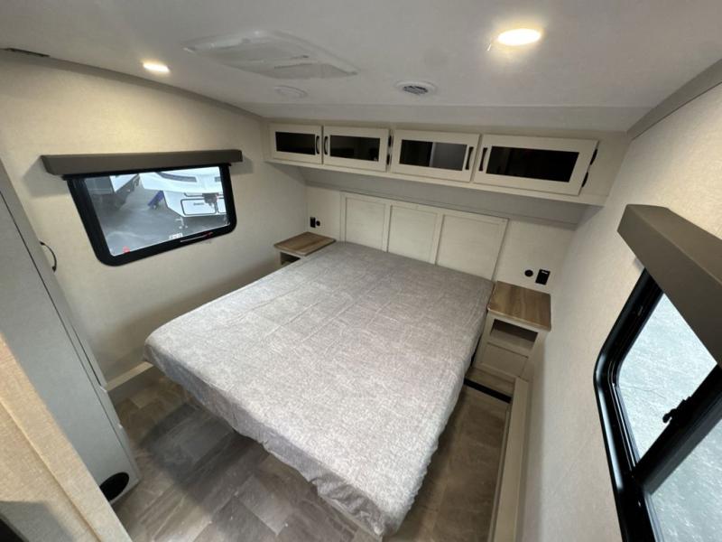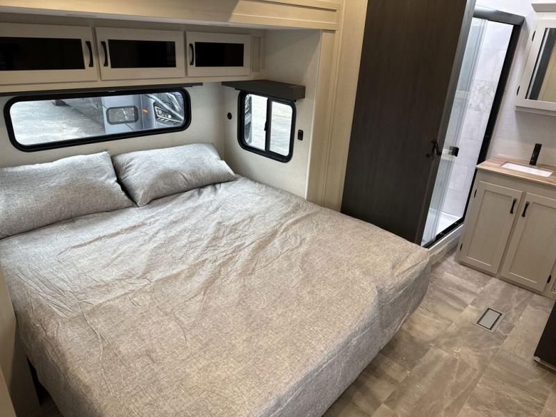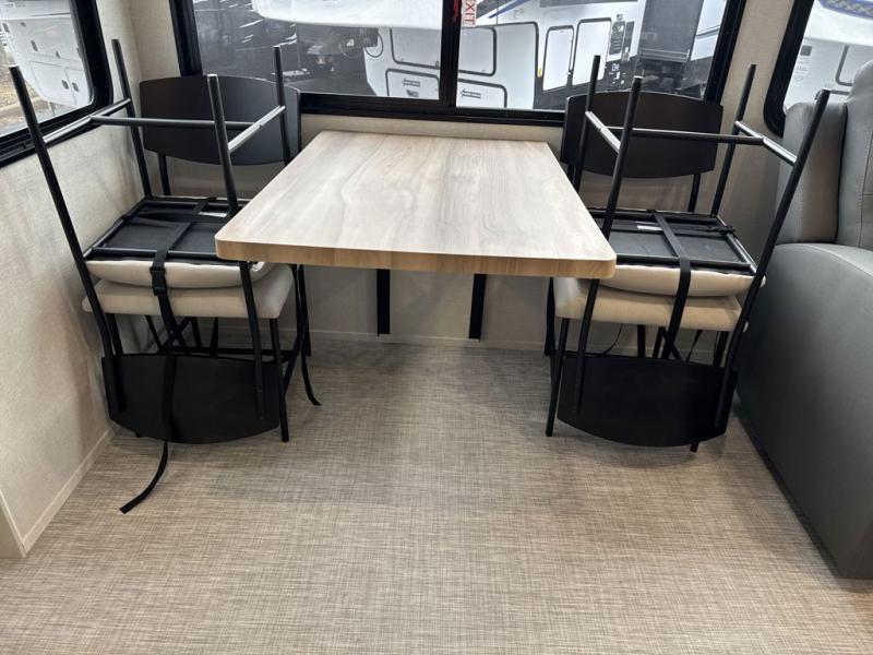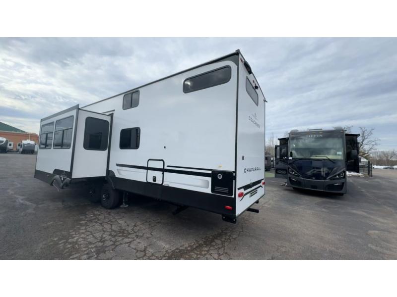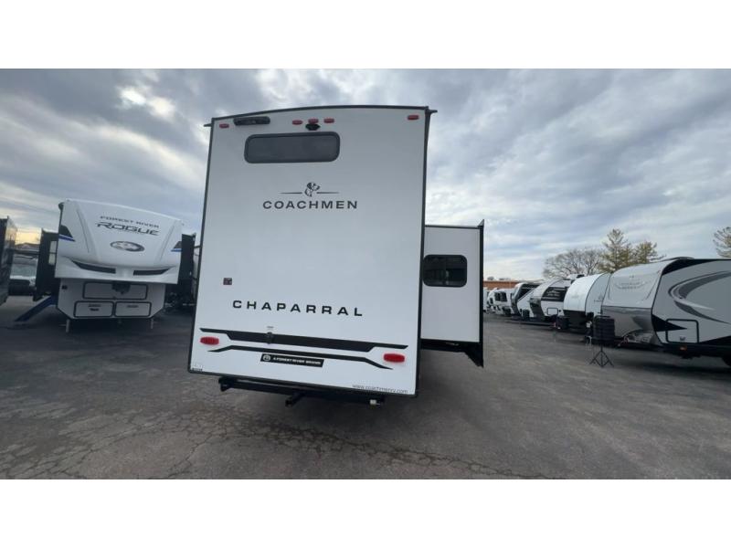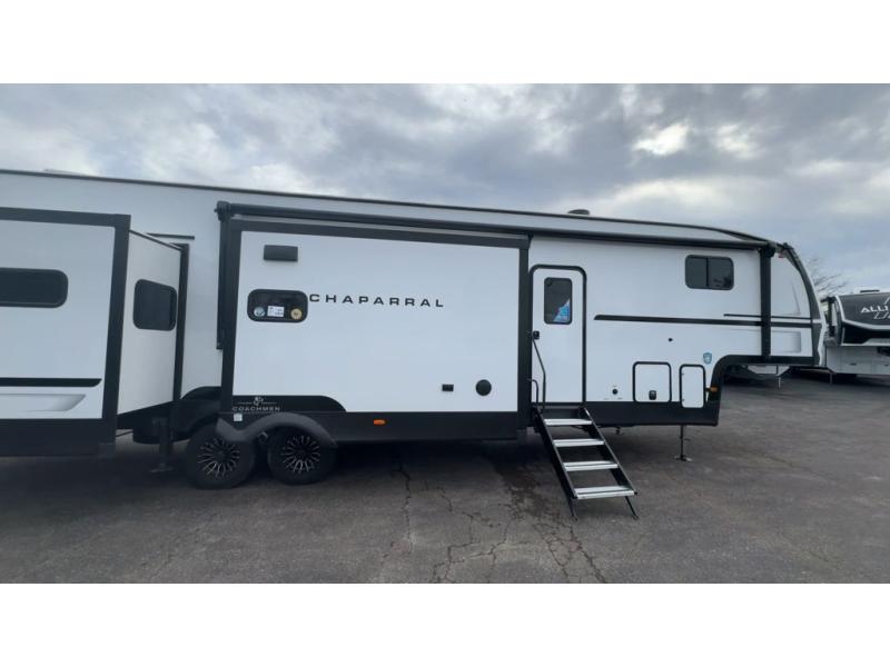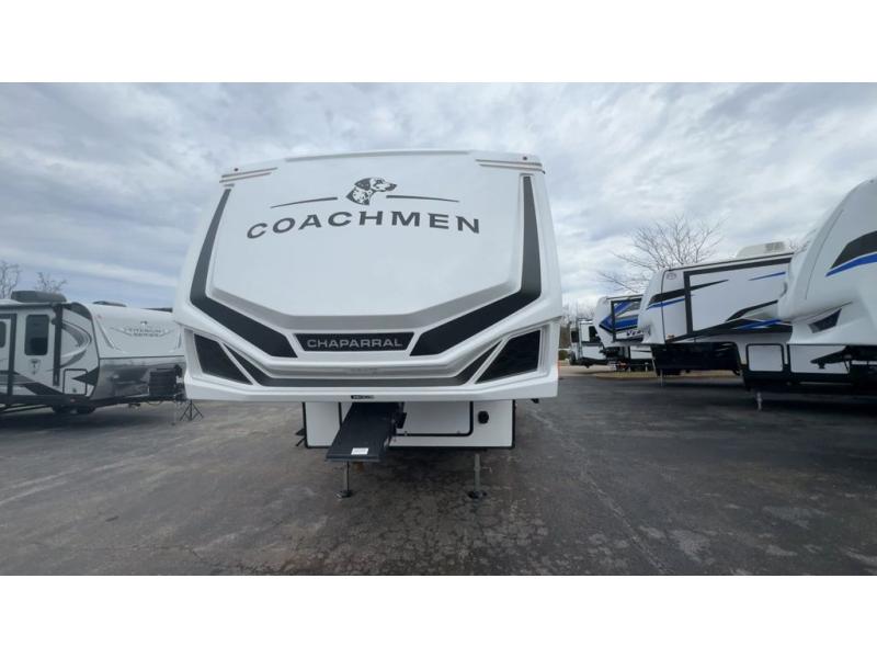 Each Chaparral mid-profile fifth wheel by Coachmen is designed with residential features, loads of storage space, and roomy bedroom suites to make you feel right at home. The durable construction means you can enjoy your RV for years to come. There's 6X double Azdel aluminum cage sidewall system, Weather Shield+ technology, and Tri-Tex powder coated frame technology that will help extend your camping season. Each model includes a Winegard Air 360+ HDTV/radio dome antenna to help keep you connected as you camp, slow rise blackout roller night shades, a new 16 cu. ft. side-by-side stainless glass 12V refrigerator, and a modern electric fireplace to make your space cozy. There is also a large transom window in the kitchen, a modern high-rise faucet, LED motion sensor lights in the bathroom, plus a full-size shower with glass doors and a seat. Now that's what I call luxury! Choose a Chaparral fifth wheel today!