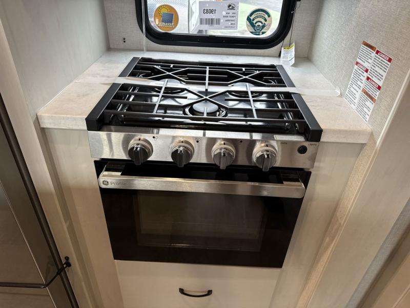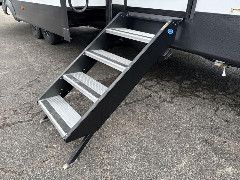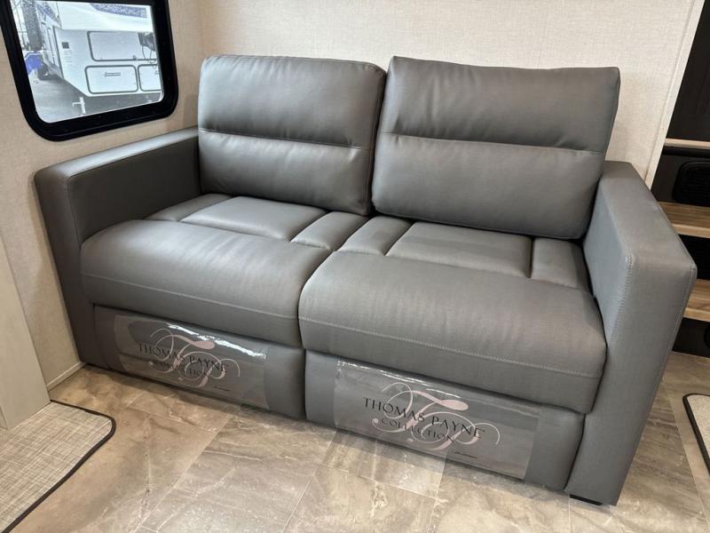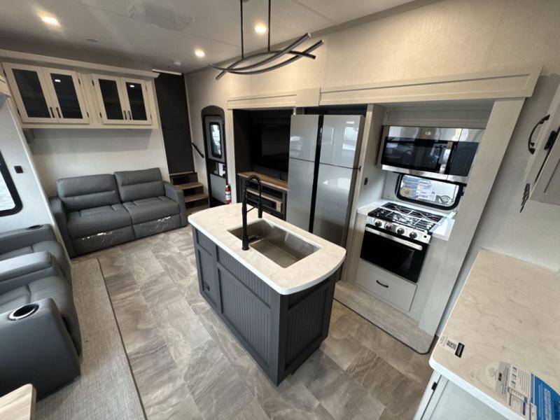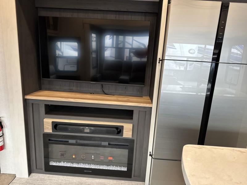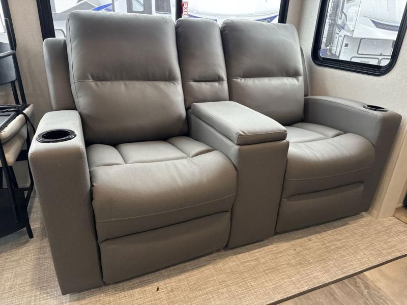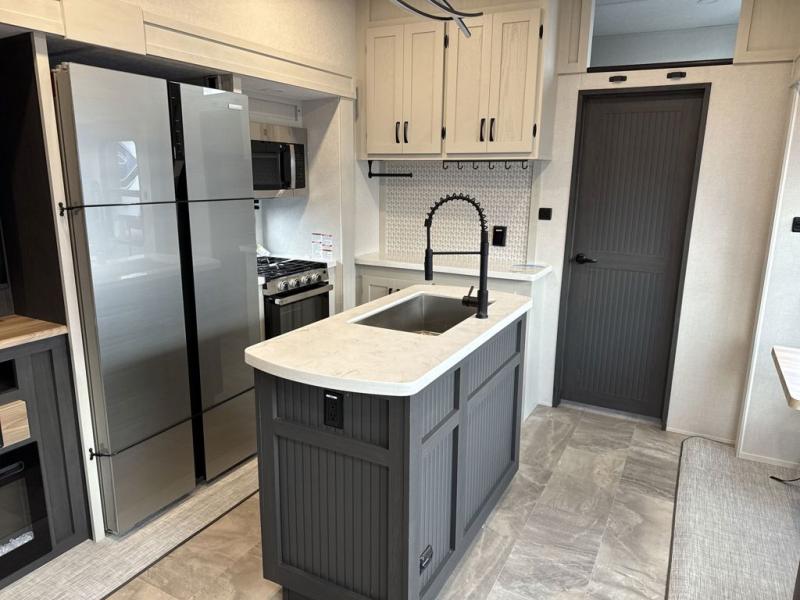 One look at this fifth wheel and you'll be sold! There are an impressive two master suites; one up front with a queen bed and full bath, and one towards the back with a king bed slide and second full bath! There are even dual bath sinks in the rear bath for added convenience! The middle living area includes dual opposing slides, a tri-fold sofa, plus theater seating and a free-spanning table for ample seating, dining, and sleeping space. There is also an entertainment center with a 50" 4K Smart LED TV to wash away those rainy day blues. The chef of your crew will have a GE Profile 21" stainless steel oven with a residential cooktop and a GE Profile stainless residential microwave to cook meals each day, a kitchen island for more counter space, and a 16 cu. ft. side-by-side 12V refrigerator for food storage.