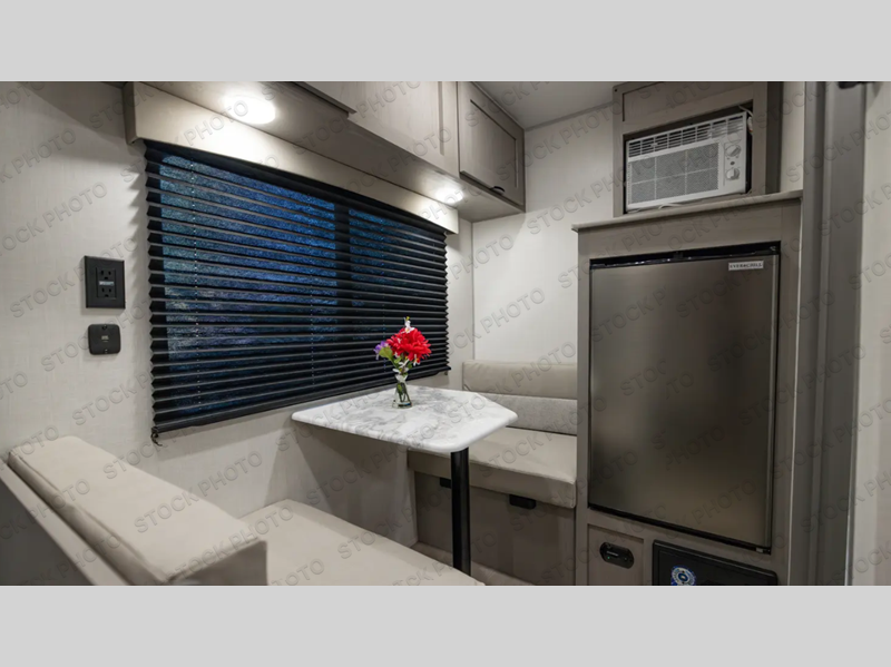 Lightweight camping with at-home comforts is possible with this travel trailer in tow! Once you arrive at the campground, you can unload the exterior storage, put out the awning, then head inside to make lunch on the two-burner cooktop. There is a refrigerator to keep your items fresh, plus a sink with a cup rinse for added convenience. The booth dinette provides a place to dine together, play a board game in the evenings, and let a guest or two little ones sleep on. You'll have the front 54" x 74" RV queen bed to yourselves, along with an overhead shelf and bedroom storage for your things. And don't overlook the private bath with a toilet and 24" x 32" shower!