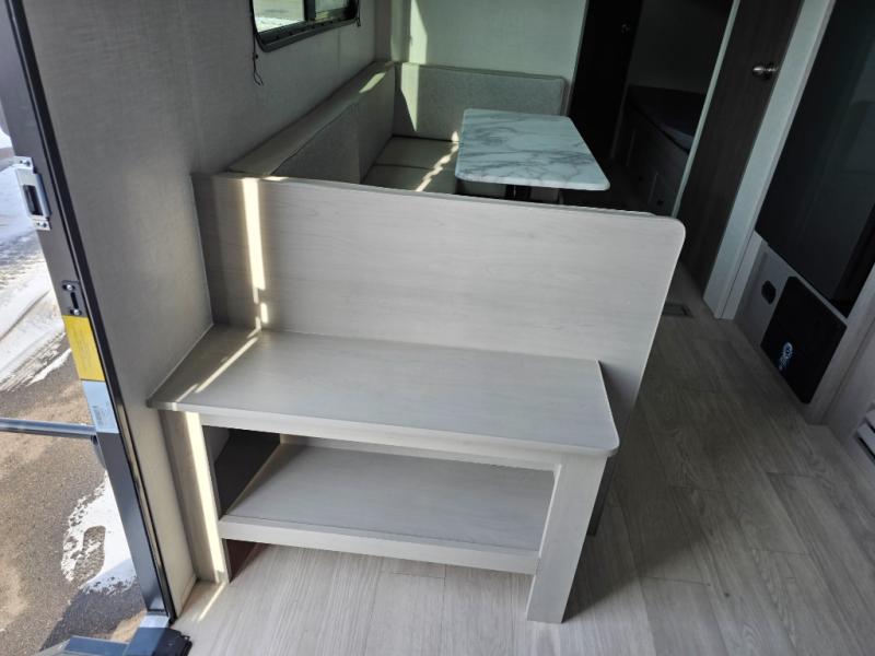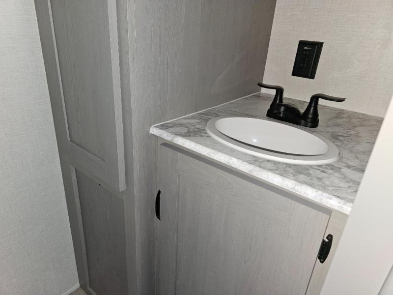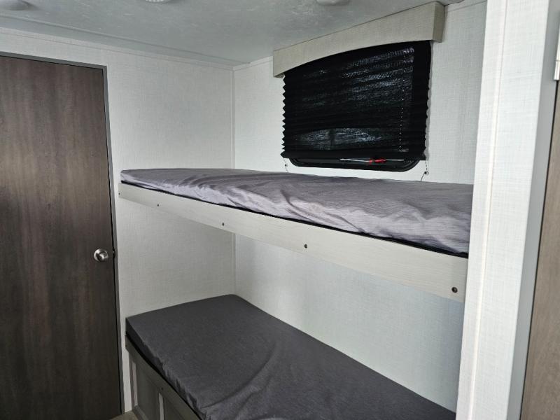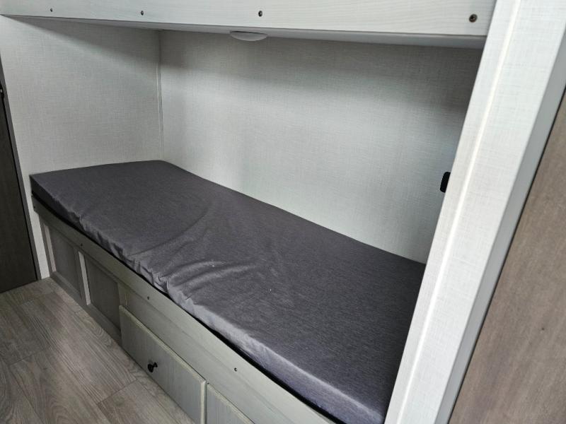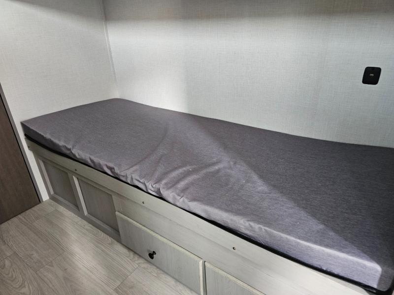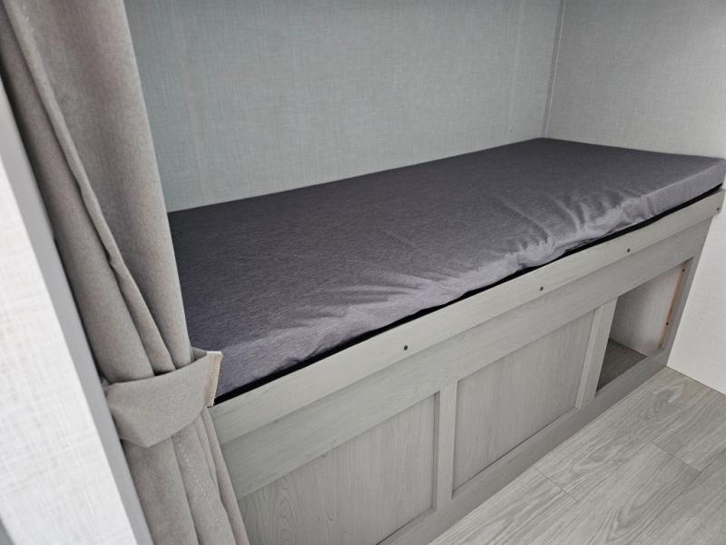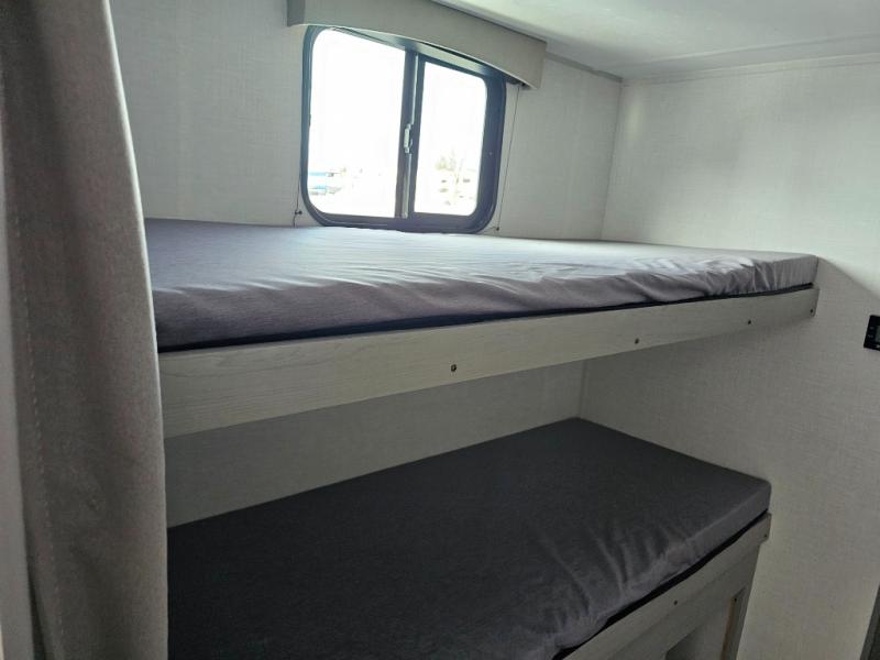 This travel trailer is perfect for a big crowd! Relax to the fullest on the queen bed located in the front bedroom, which also has plenty of space due to its over head cabinet, dual wardrobes and private shelves besides the bed. The quad bunk beds are ideal for kids to take a nap, also the U-shaped dinette is another option to use it as a makeshift bed. Take a long bath on the large rear bathroom, special to pamper yourself in the most comfortable way. This model also includes a 12V refrigerator to keep your food fresh, a 2-burner cooktop and a washer/dryer prep; all the comfort of home on the road!