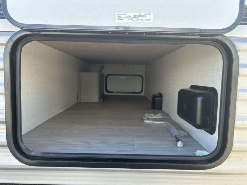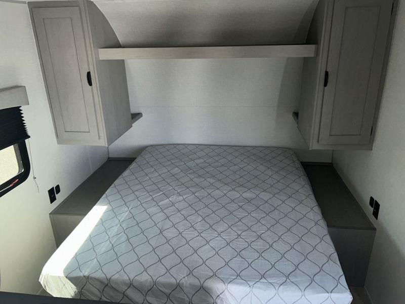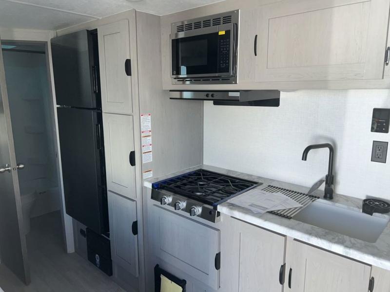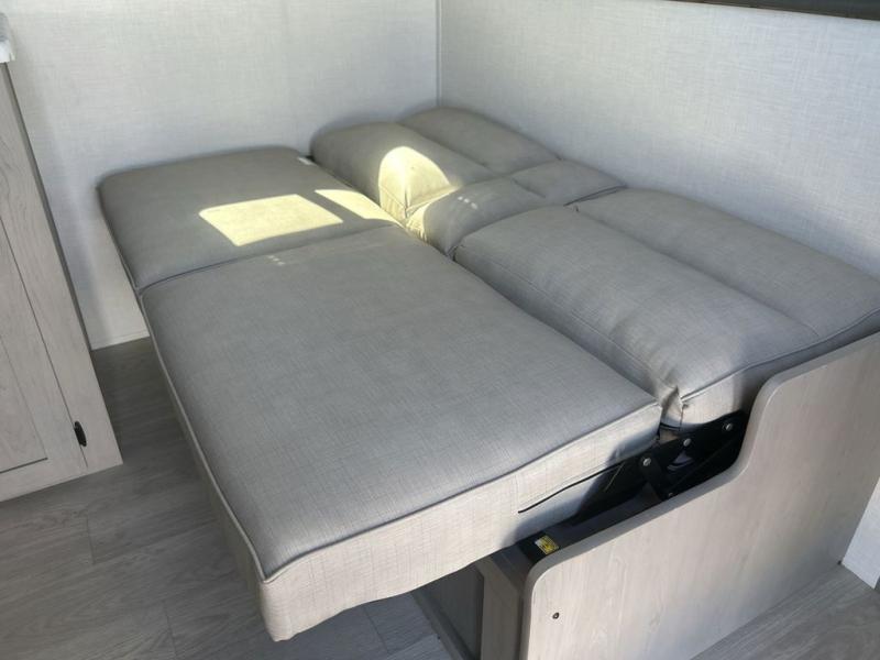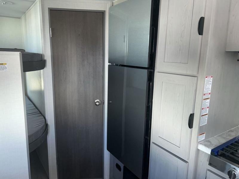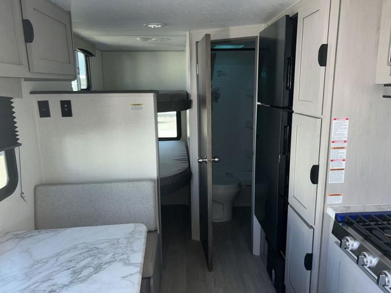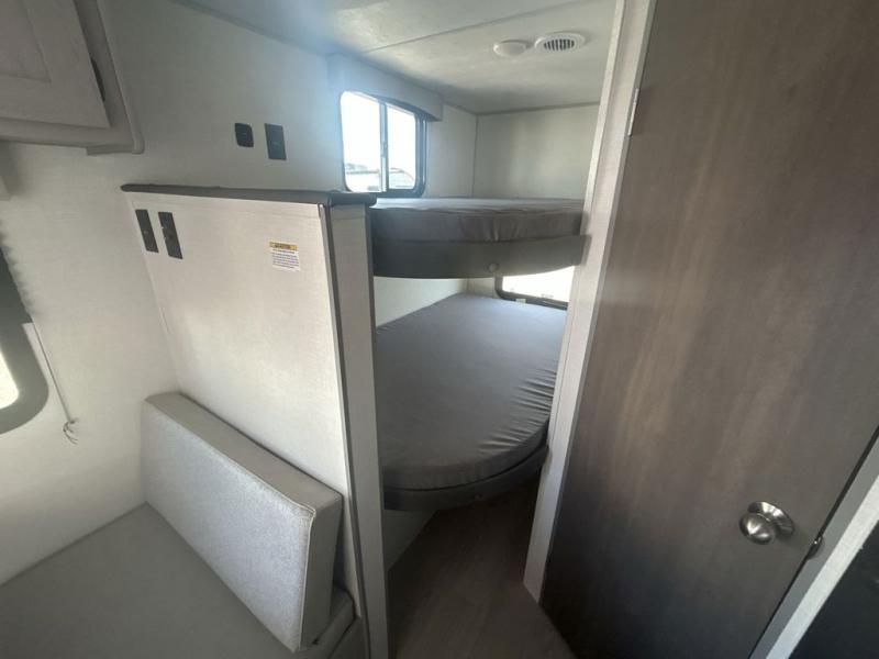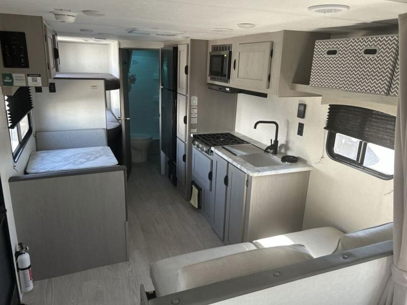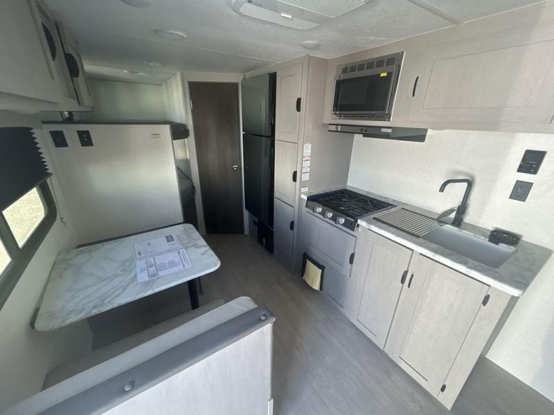 Bring the whole family with you in this travel trailer! The kiddos can sleep on the rear corner set of double-size bunks. The opposite rear corner features a full bath including a 24" x 36" shower, linen cabinet, toilet, and vanity. In the main living space you will find plenty of seating with a booth dinette and jackknife sofa which can also transform into an extra sleeping space if needed. Everyone's bellies will stay full with the three burner cooktop, 12-volt refrigerator, and microwave which you can use to pop a bag of popcorn for movie night. You will enjoy the front bedroom for a bit of privacy including a queen bed and large overhead cabinet for your things. On the outside, a large front pass-through for lawn chairs and camp gear. There is more storage beneath the double bed bunks in back and a nice 15' awning to provide protection from the elements when outdoors.