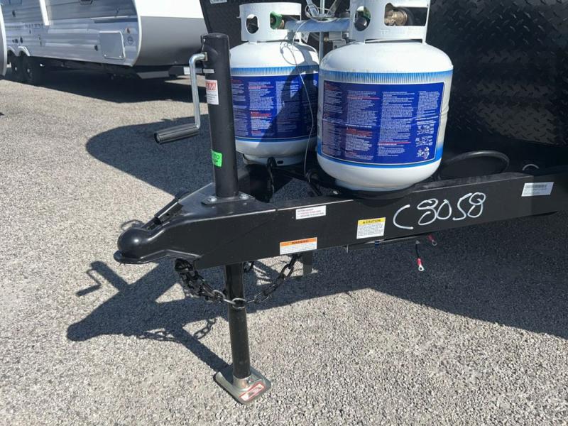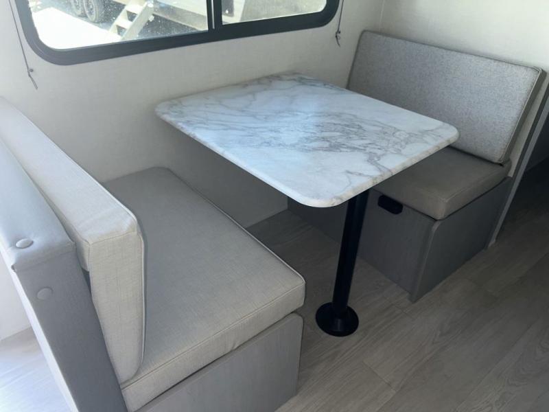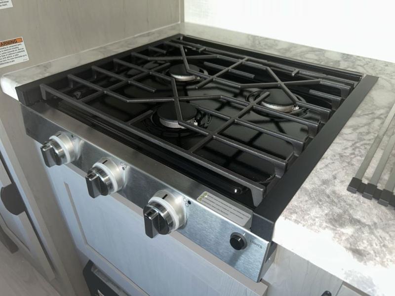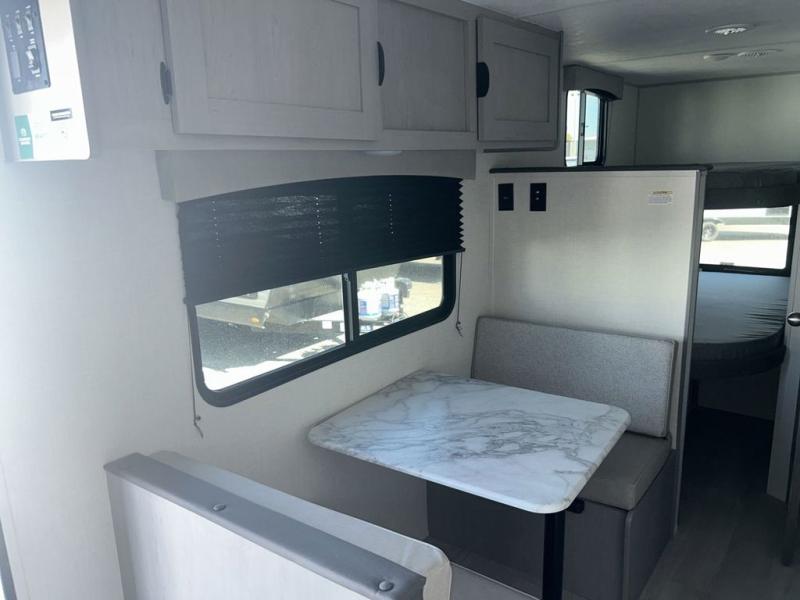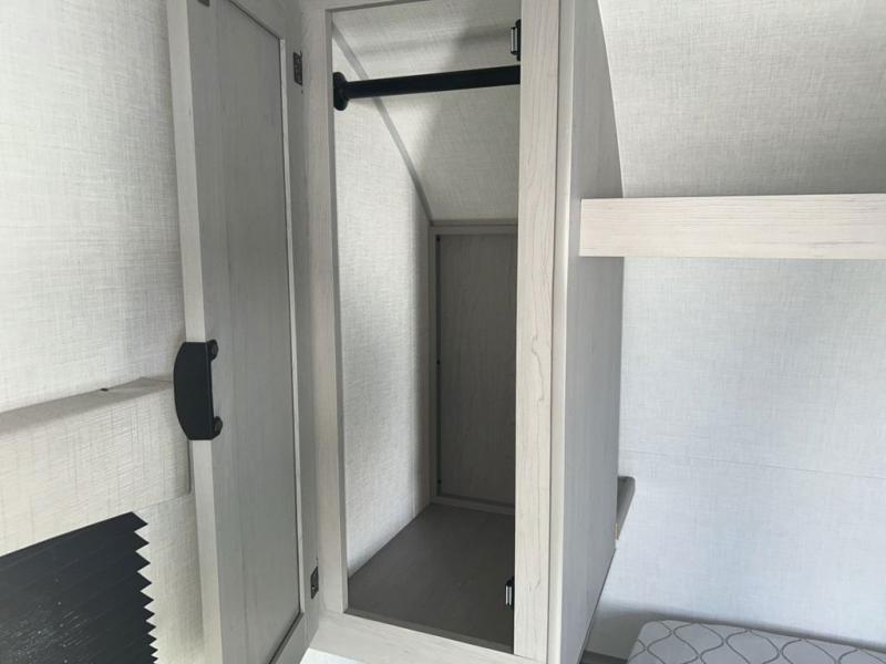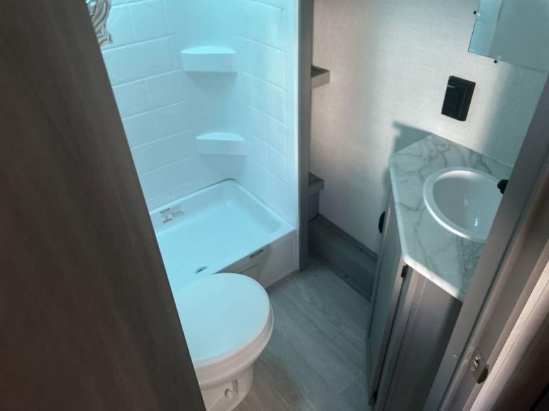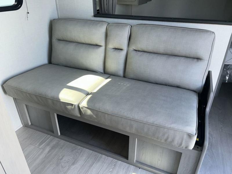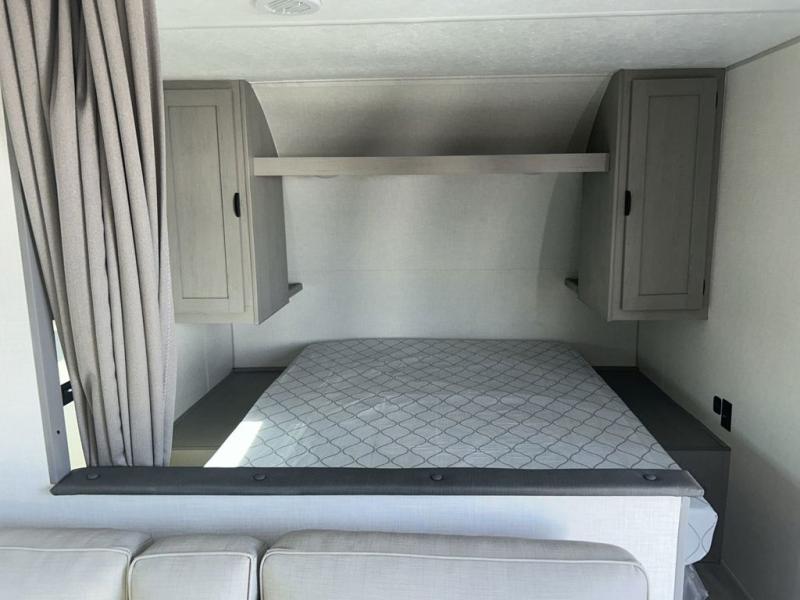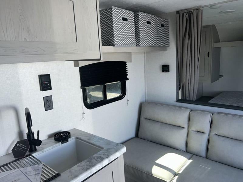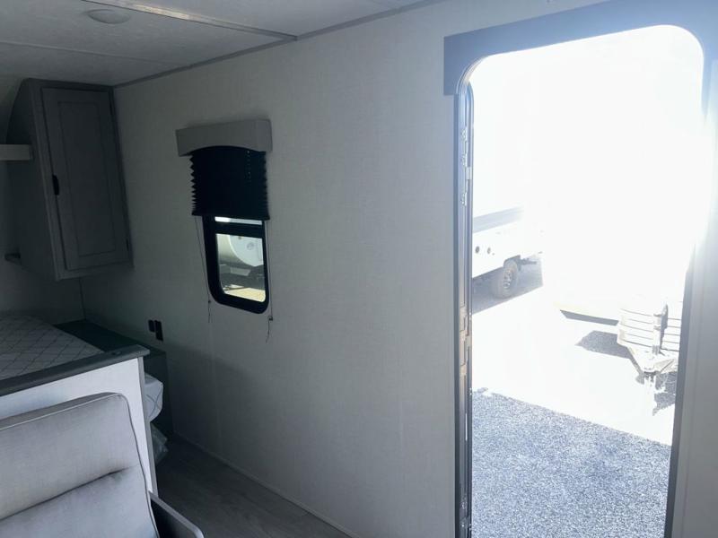 Bring the whole family with you in this travel trailer! The kiddos can sleep on the rear corner set of double-size bunks. The opposite rear corner features a full bath including a 24" x 36" shower, linen cabinet, toilet, and vanity. In the main living space you will find plenty of seating with a booth dinette and jackknife sofa which can also transform into an extra sleeping space if needed. Everyone's bellies will stay full with the three burner cooktop, 12-volt refrigerator, and microwave which you can use to pop a bag of popcorn for movie night. You will enjoy the front bedroom for a bit of privacy including a queen bed and large overhead cabinet for your things. On the outside, a large front pass-through for lawn chairs and camp gear. There is more storage beneath the double bed bunks in back and a nice 15' awning to provide protection from the elements when outdoors.
