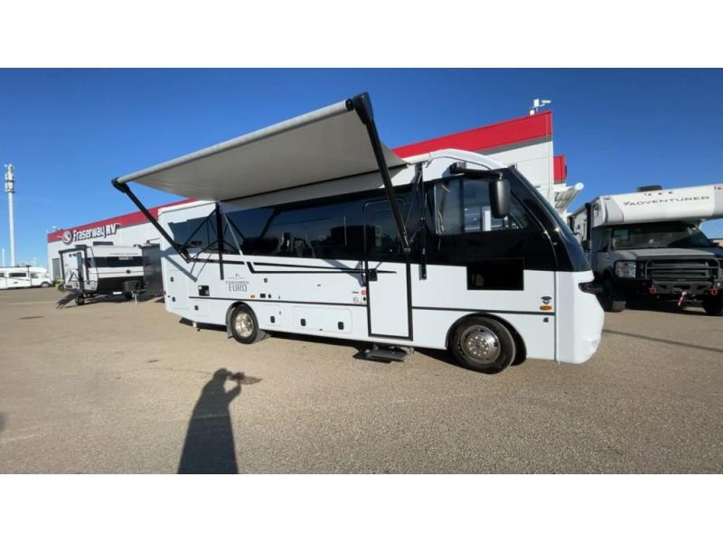 Enjoy the compact and stylish look of a European coach with the Euro Class A gas motorhome by Coachmen RV! There is a fiberglass front cap and a Ford F53 7.3L V8 chassis that will add to the life of your RV. The driver will love having a back up monitor with side view cameras, and the passenger can use the computer workstation to work remotely if needed. There is also traction control, cruise control, plus a tilt and telescoping steering wheel that will make the drive that much easier. An exterior propane hook-up also comes standard, along with radius trunk doors for your gear, and exterior storage for your outdoor gear. Head inside to find modern features, like the stainless steel appliances, square windows with day/night shades, and the list goes on!