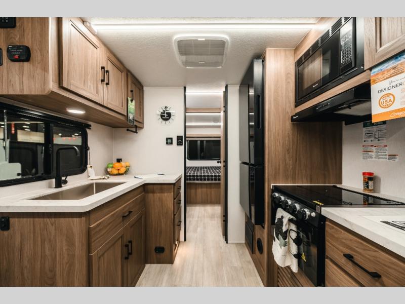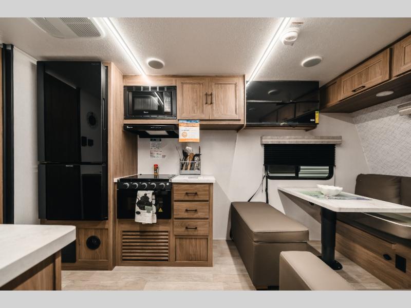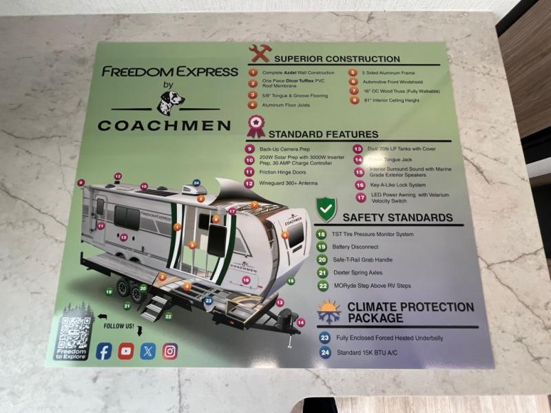 With any Freedom Express Select travel trailer by Coachmen you will find an alumicage construction and two-step vacuum bonded and pinch rolled sidewalls with Azdel interior and exterior for a trailer made to last. These Select value models come standard with a Bluetooth interior speaker, night shades, and wear-resistant vinyl flooring throughout. You will appreciate the power tongue jack, as well as the Dicor Tufflex PVC roof and heated and enclosed underbelly to help with protection and climate control. A GE 15K BTU roof A/C will keep you comfortable, and the suburban tankless water heater will provide endless hot showers!