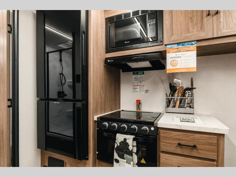Step inside this travel trailer and be welcomed by a spacious front living area featuring a full-width sofa, complemented by a cozy dinette, ottoman, and an entertainment center—perfect for relaxing, dining, or planning your day. The central kitchen is fully equipped for the chef, boasting a 10 cubic ft refrigerator, Magic Chef gas cooktop, microwave, and ample overhead storage. Moving forward, a convenient pass-through full bathroom offers practicality on the go. At the rear, the bedroom features a comfortable 60" x 80" queen bed, flanked by wardrobes on each side and additional overhead storage to keep all your essentials neatly organized.