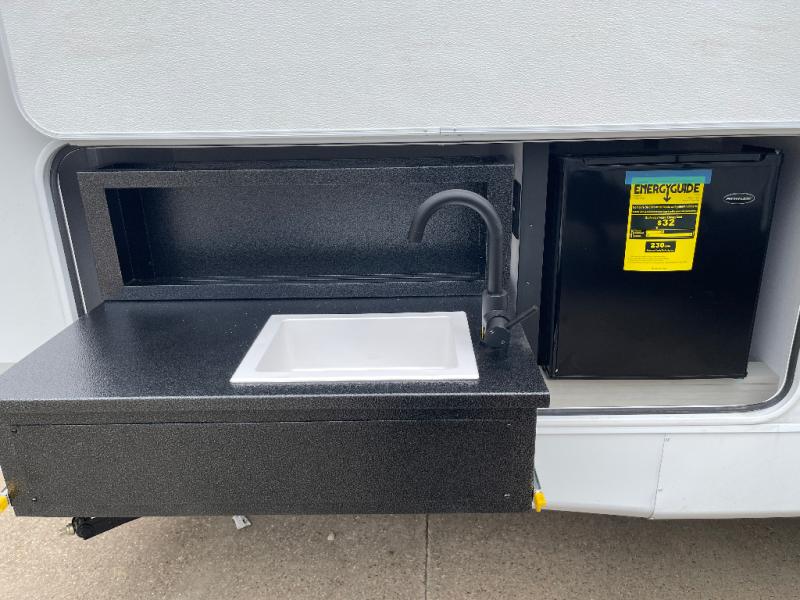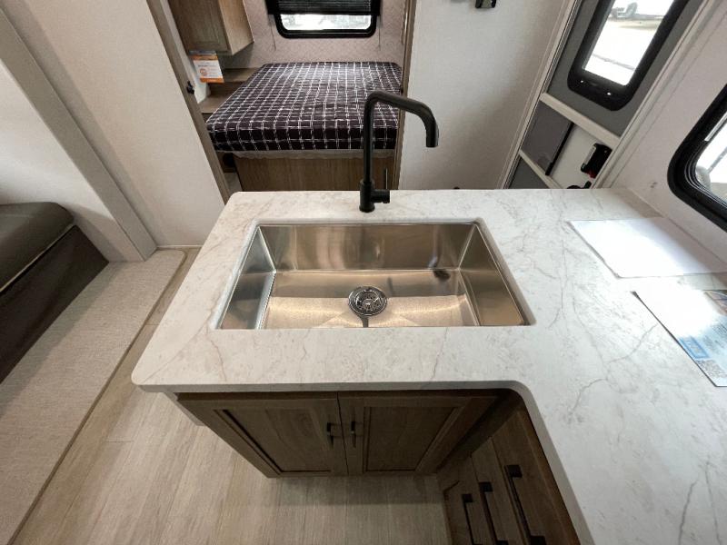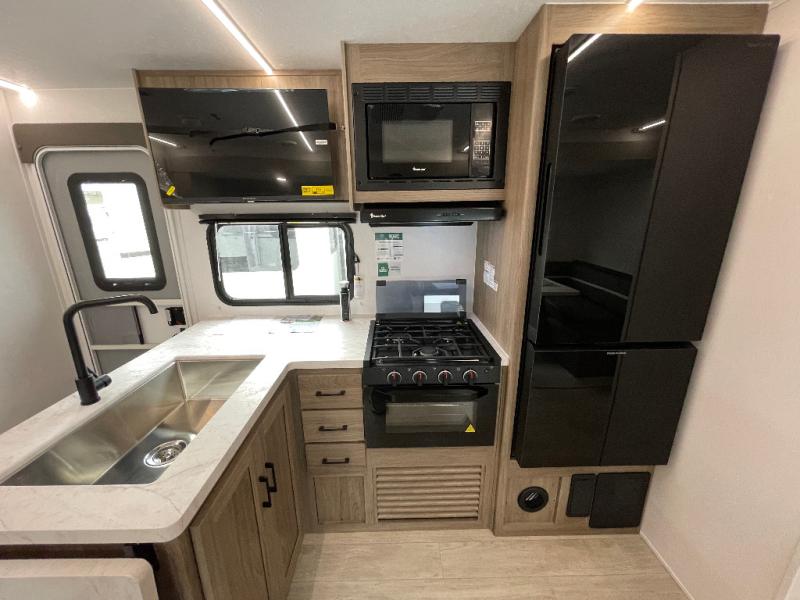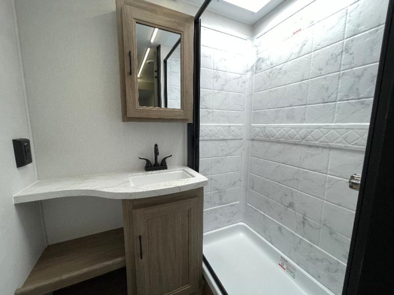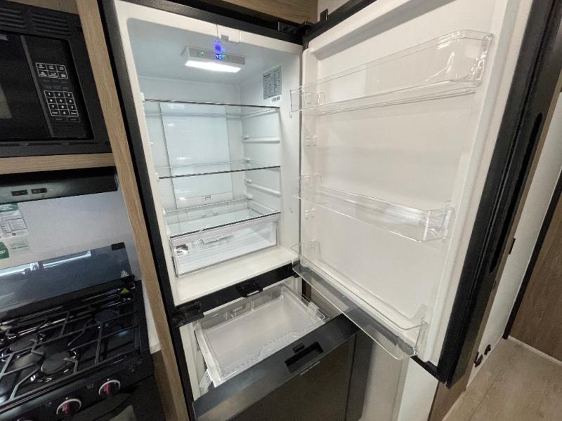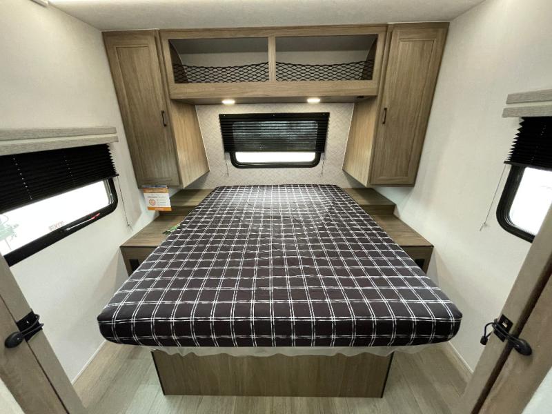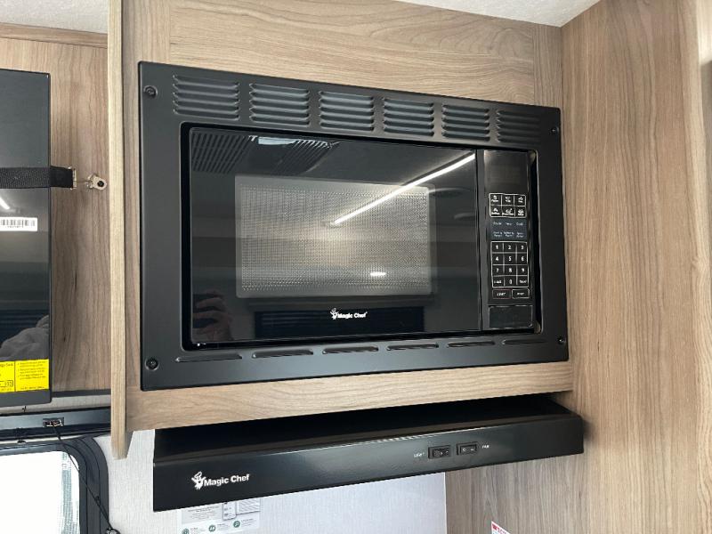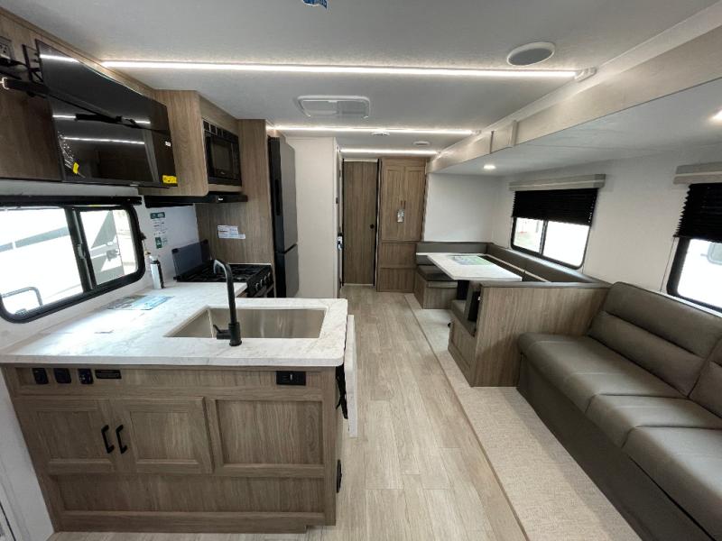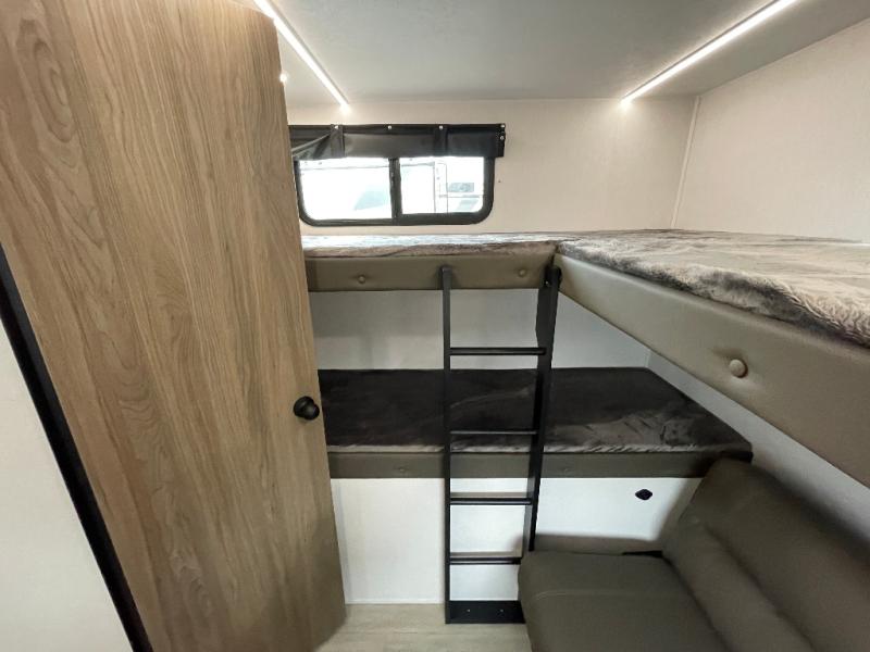 As you step into this trailer, you'll find the main bedroom at the front, featuring a spacious 60" x 80" queen bed with a wardrobe on each side for your clothes and essentials. At the center, the living area offers a large slide-out that holds a roomy U-shaped dinette perfect for meals or game nights beside it a comfortable sofa for extra seating. Opposite the slide, the L-shaped kitchen comes fully equipped with a 10-cu. ft. refrigerator, Magic Chef microwave and gas cooktop, plus a flip-up countertop for added prep space. Toward the rear, a full bathroom includes a large shower and generous counter space, and at the very back, the bunkhouse provides sleeping room for up to five, features a double bunk, bunk above sofa and trundle mat, making it easy to bring the whole crew along for the adventure.