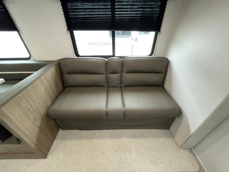 With any Freedom Express Select travel trailer by Coachmen you will find an alumicage construction and two-step vacuum bonded and pinch rolled sidewalls with Azdel interior and exterior for a trailer made to last. These Select value models come standard with a Bluetooth interior speaker, night shades, and wear-resistant vinyl flooring throughout. You will appreciate the power tongue jack, as well as the Dicor Tufflex PVC roof and heated and enclosed underbelly to help with protection and climate control. A GE 15K BTU roof A/C will keep you comfortable, and the suburban tankless water heater will provide endless hot showers!