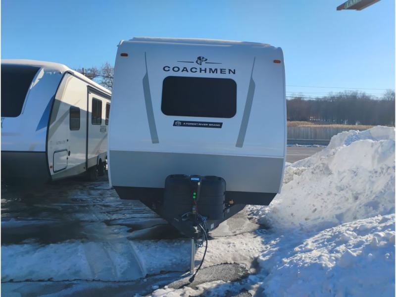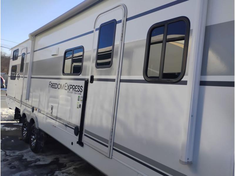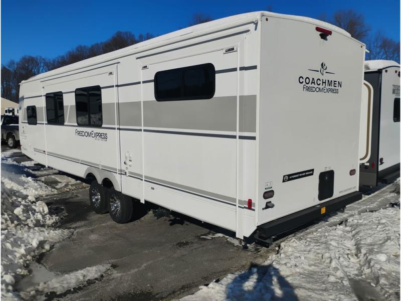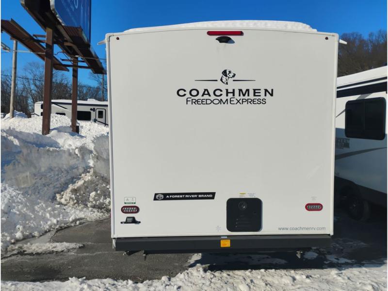 With any Freedom Express Select travel trailer by Coachmen you will find an alumicage construction and two-step vacuum bonded and pinch rolled sidewalls with Azdel interior and exterior for a trailer made to last. These Select value models come standard with a Bluetooth interior speaker, night shades, and wear-resistant vinyl flooring throughout. You will appreciate the power tongue jack, as well as the Dicor Tufflex PVC roof and heated and enclosed underbelly to help with protection and climate control. A GE 15K BTU roof A/C will keep you comfortable, and the suburban tankless water heater will provide endless hot showers!