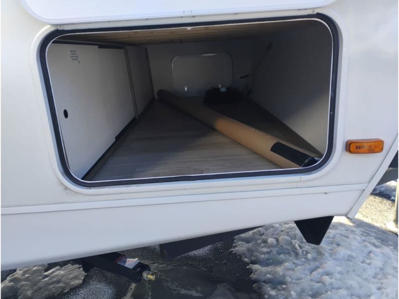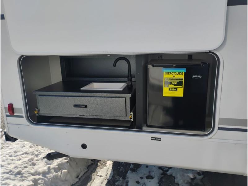 Head to your local state park for fun camping trips in this dual entry travel trailer. The rear private bunkhouse includes four bunks, plus a slide out for more space. The full bath is right next to the bunkhouse for convenience, plus it includes its own exterior entry door so you can quickly get in and get back out to the fun. Everyone can gather around the U-shaped dinette for meal times or game night, and the 40" Smart TV will be perfect for those rainy days. This model also includes a dual-burner cooktop and a microwave indoors, plus a pull-out camp kitchen outdoors the chef of the group is sure to love!