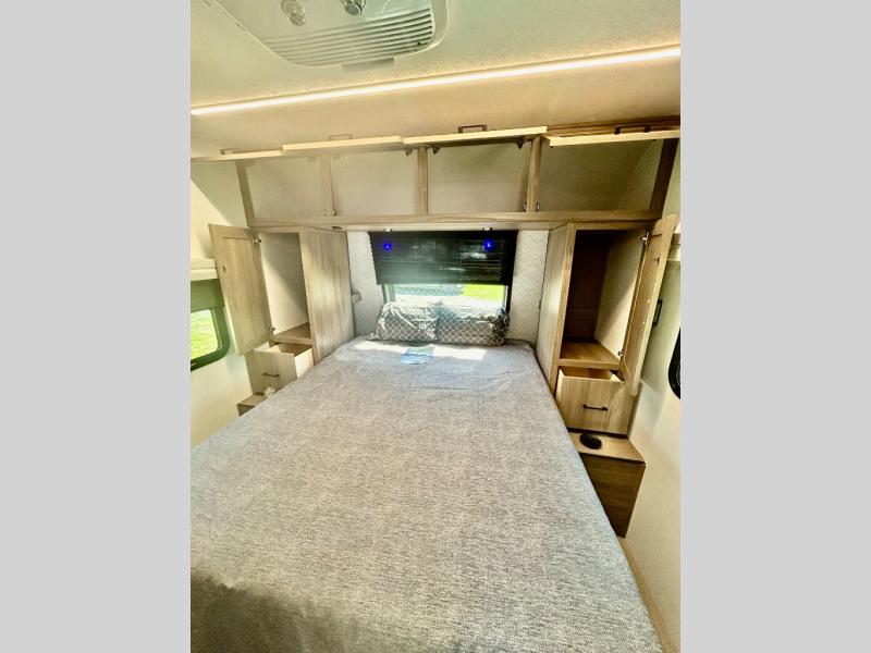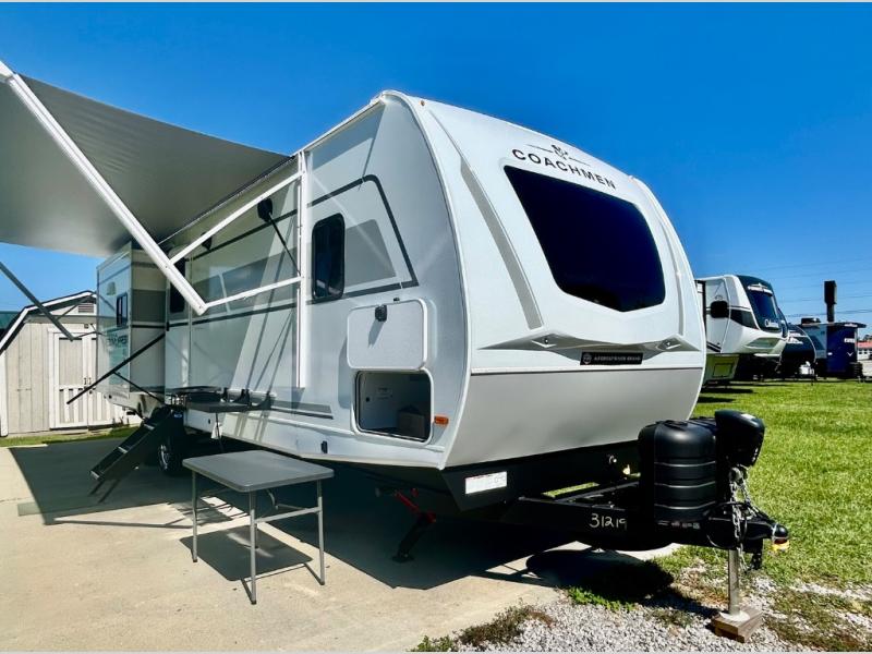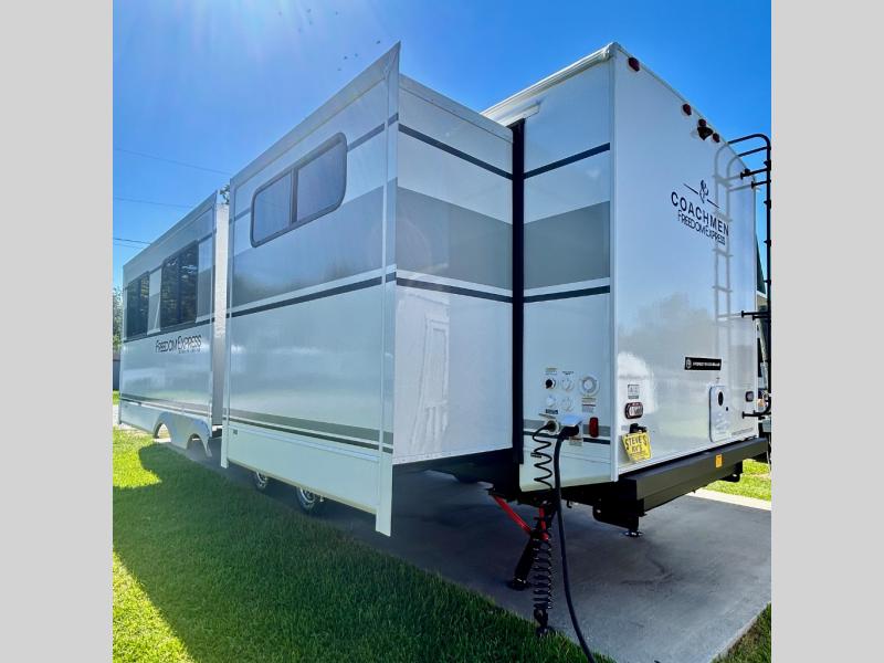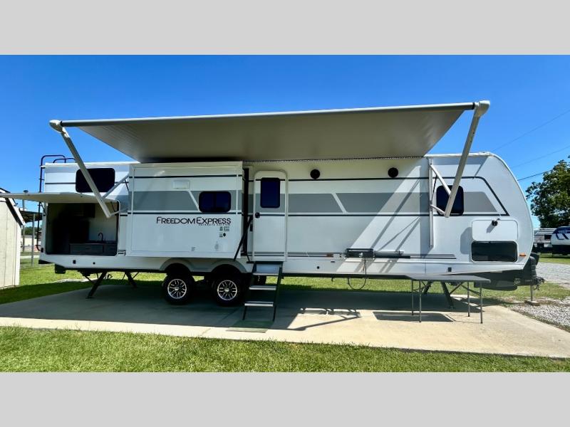 With any Freedom Express Ultra Lite travel trailer by Coachmen you will appreciate quality construction materials, such as vacuum bonded walls with Azdel composite, a 3/4 gel coated fiberglass cap with an automotive glass windshield, and a heated enclosed underbelly. Each model also features Tufflex PVC roofing, front rock guard, and E-Z Lube axles for smooth towing. Inside, you'll find kitchen backsplash, hidden hinge cabinetry, and wear-resistant vinyl flooring throughout. The power tongue jack included with the Ultra Lite Express Package will make set-up a breeze, and each model includes back-up camera prep and they are Freedom solar ready if you plan to go off-grid. Enjoy lightweight camping with a Freedom Express Ultra Lite travel trailer today!