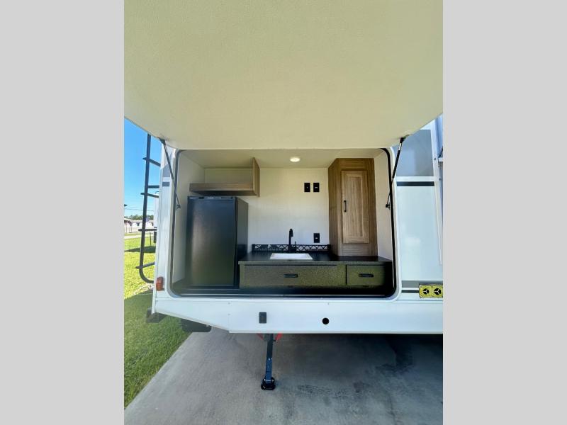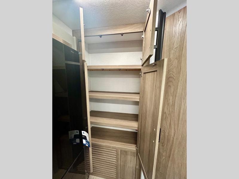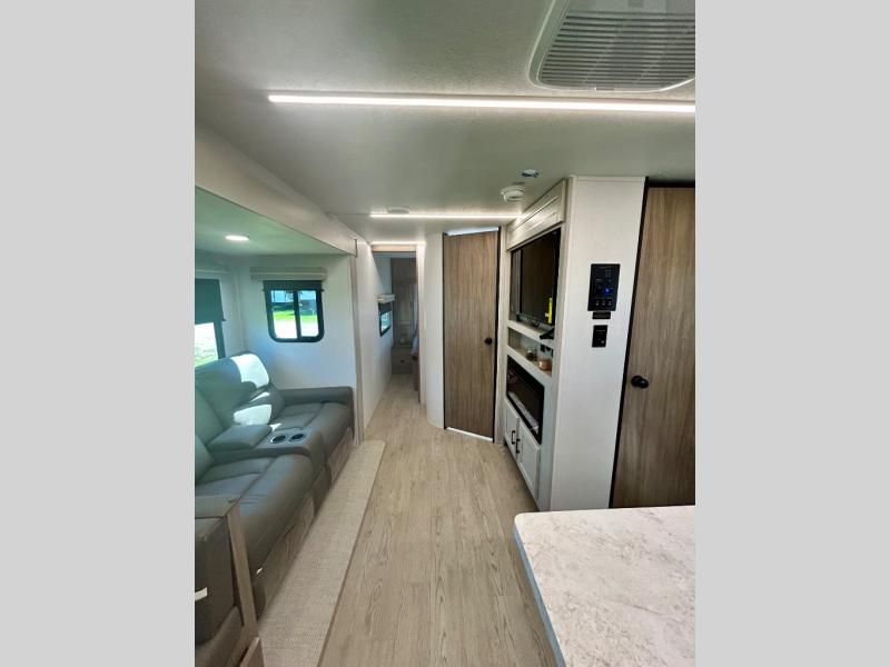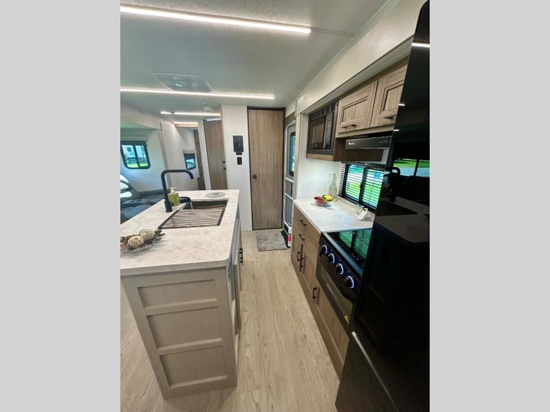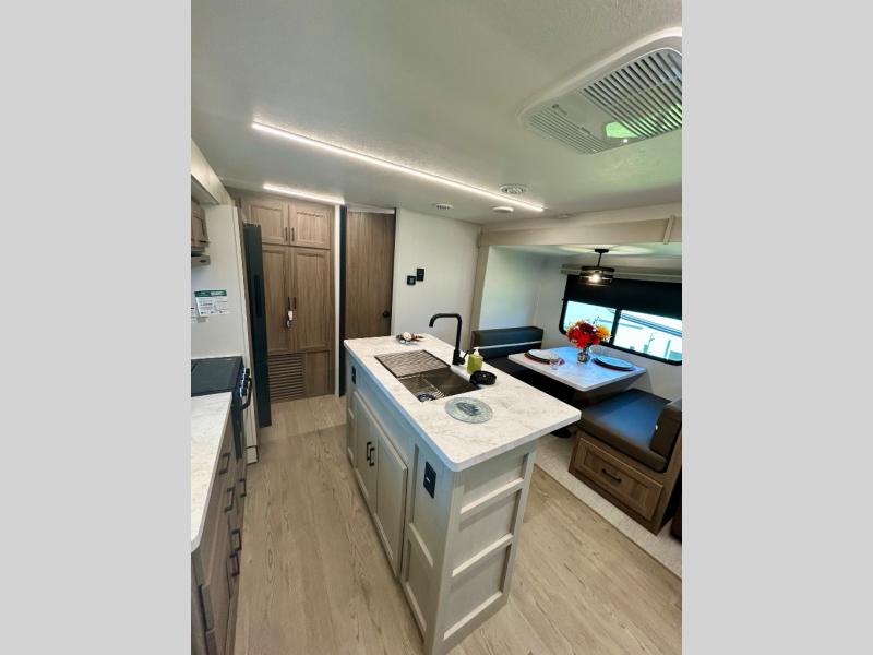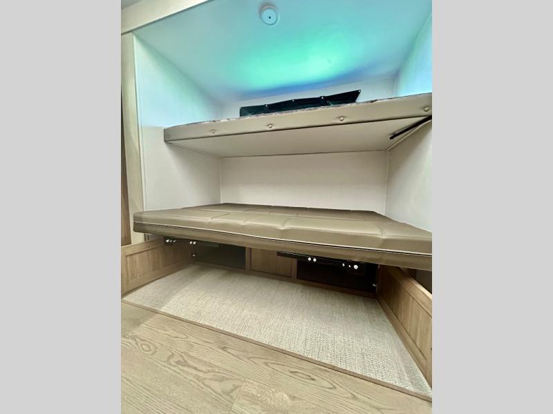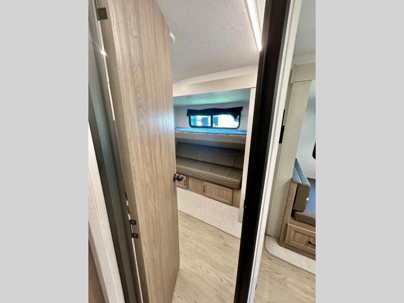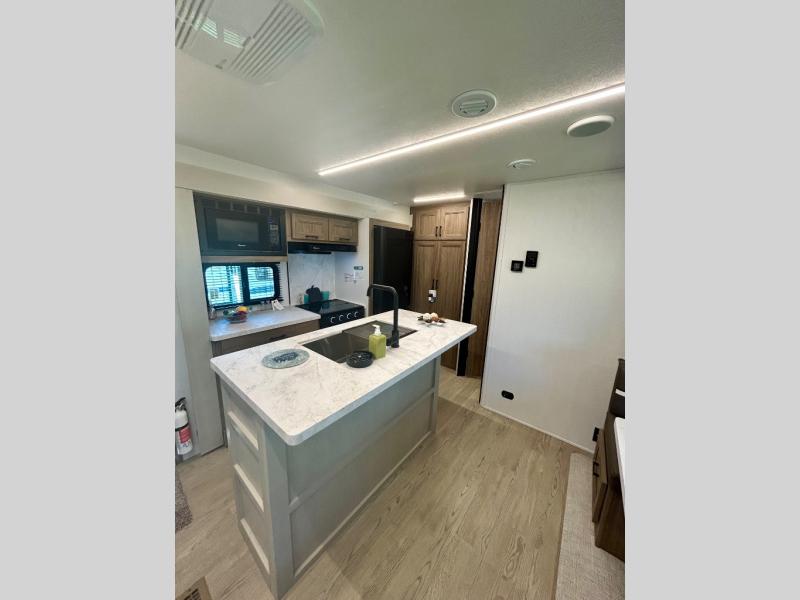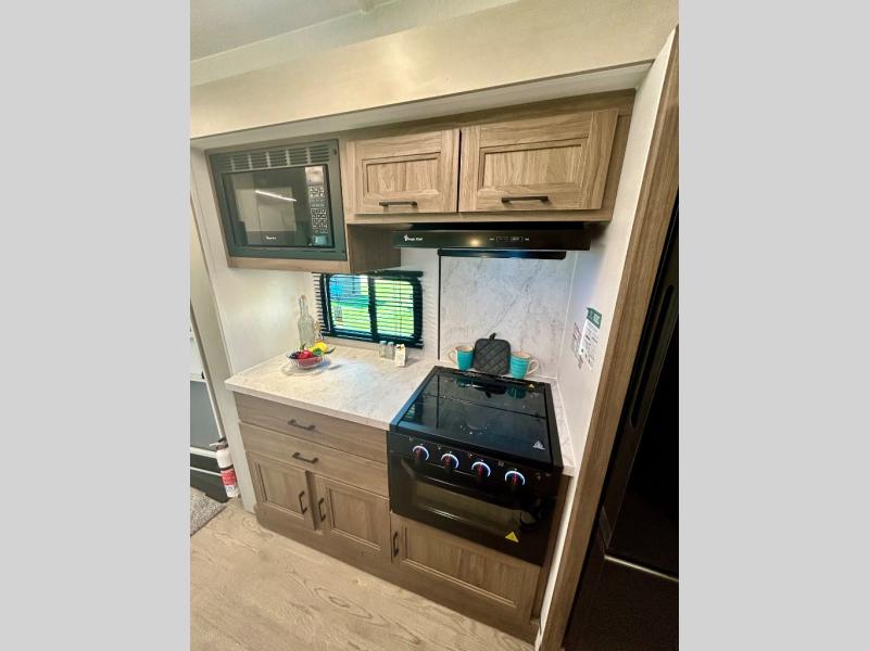 It won't be hard to find comfort and convenience in this travel trailer for eight. Once you've checked in at your campsite, grab your gear from the pass-through storage, put out the 20' awning, then start lunch on the full camp kitchen! If you'd rather cook inside, you'll find a three burner range and a microwave oven to cook meals, along with an 10 cu. ft. double door refrigerator, and pantry for food storage, plus a kitchen island for more prep space! The booth dinette provides a place to dine or play games, and the sofa can be switched out for an optional theater seat if you don't need the additional sleeping space. A stand-out feature on this model is the rear private bunkhouse with a flip-up bunk and roll-over sofa within a slide out, a second bunk across the room, a wardrobe with space for a TV, plus a second wardrobe for storage. And don't overlook the dual entry bath that leads to the front master bedroom, complete with a queen bed with underbed storage and dual wardrobes!