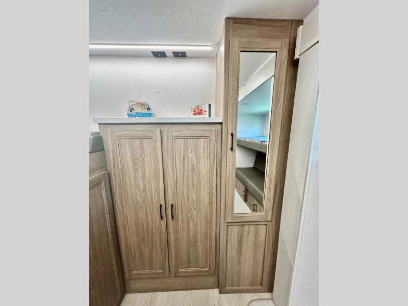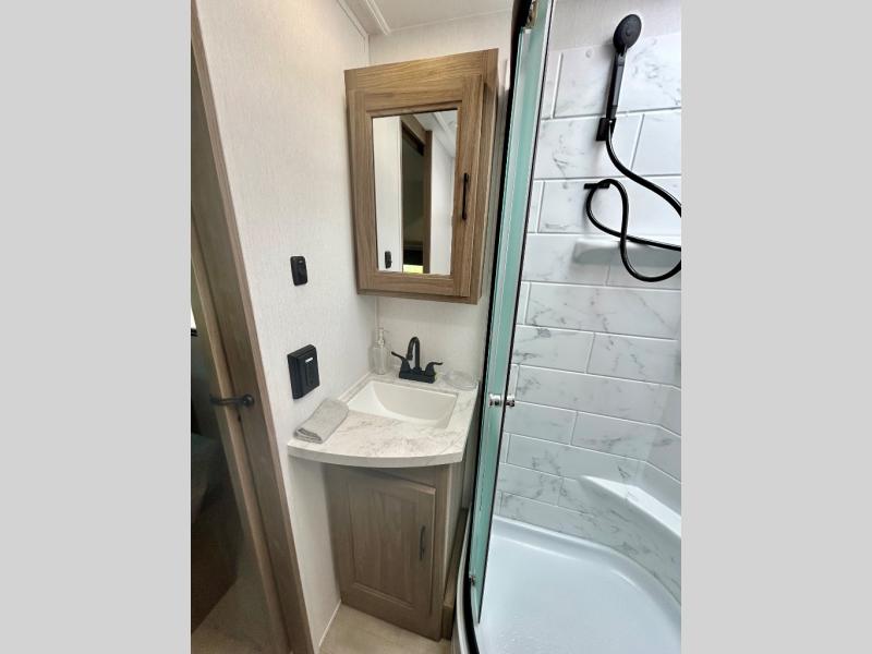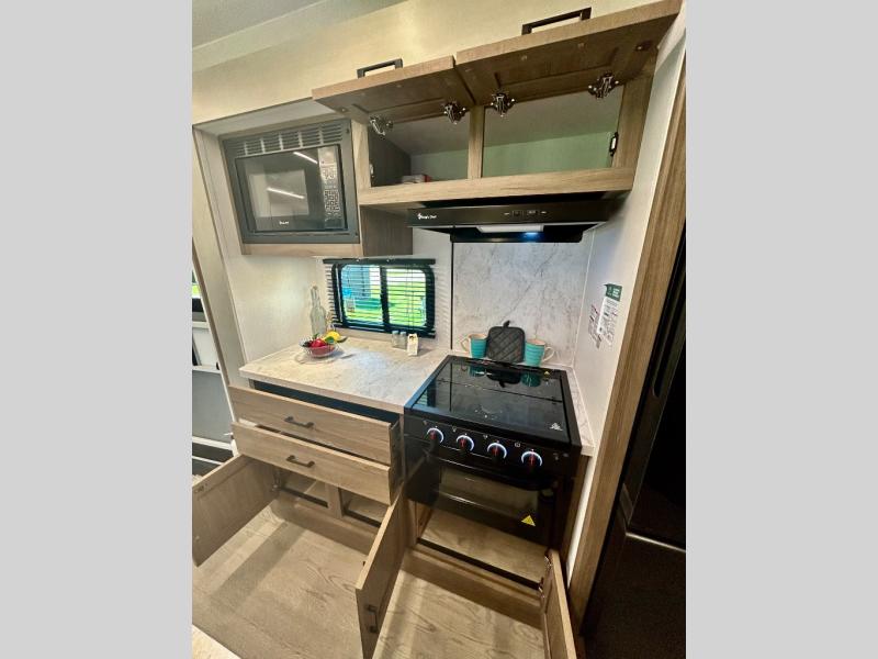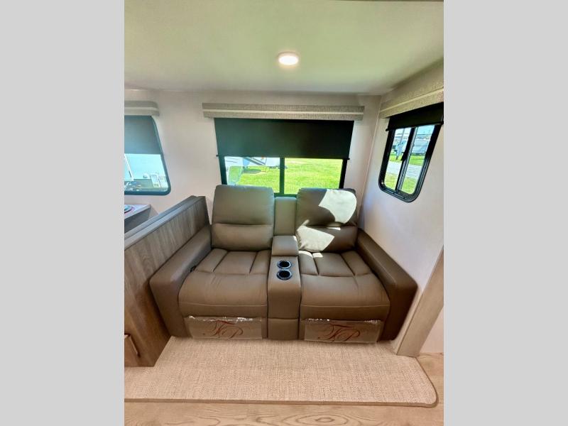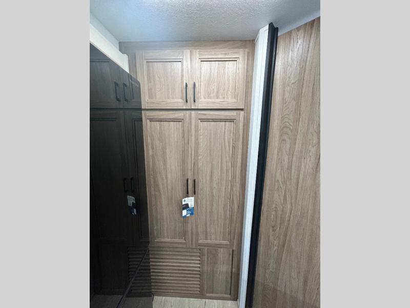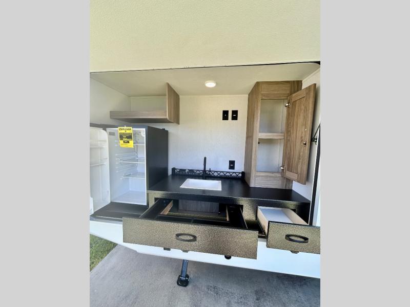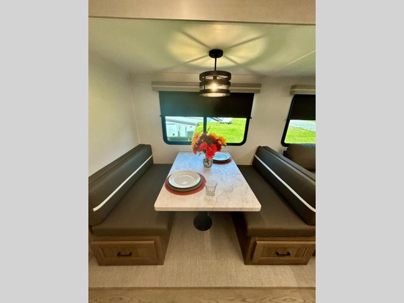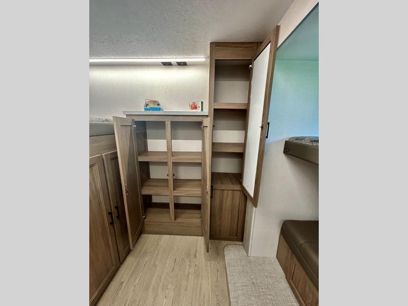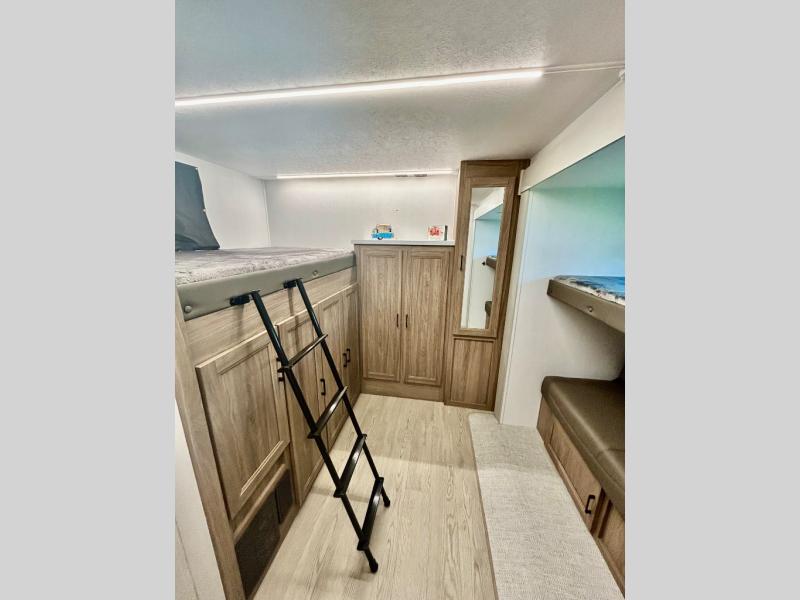 It won't be hard to find comfort and convenience in this travel trailer for eight. Once you've checked in at your campsite, grab your gear from the pass-through storage, put out the 20' awning, then start lunch on the full camp kitchen! If you'd rather cook inside, you'll find a three burner range and a microwave oven to cook meals, along with an 10 cu. ft. double door refrigerator, and pantry for food storage, plus a kitchen island for more prep space! The booth dinette provides a place to dine or play games, and the sofa can be switched out for an optional theater seat if you don't need the additional sleeping space. A stand-out feature on this model is the rear private bunkhouse with a flip-up bunk and roll-over sofa within a slide out, a second bunk across the room, a wardrobe with space for a TV, plus a second wardrobe for storage. And don't overlook the dual entry bath that leads to the front master bedroom, complete with a queen bed with underbed storage and dual wardrobes!