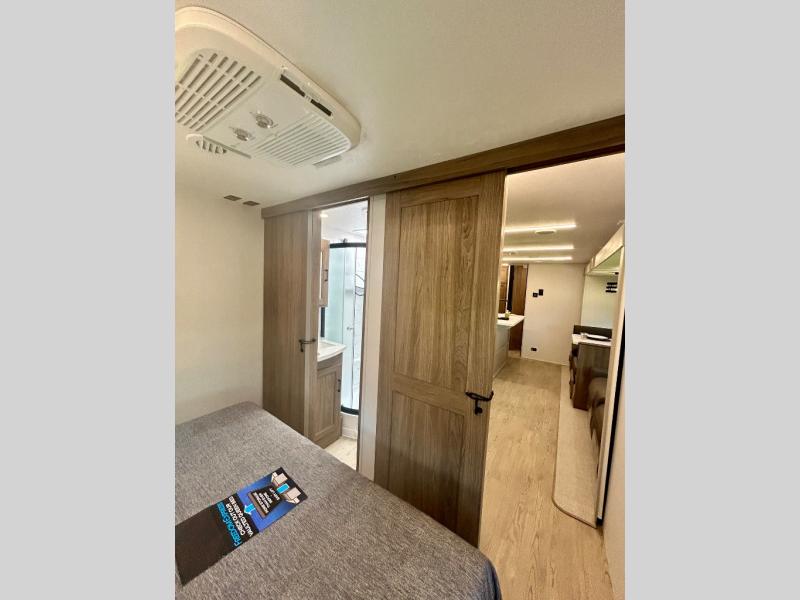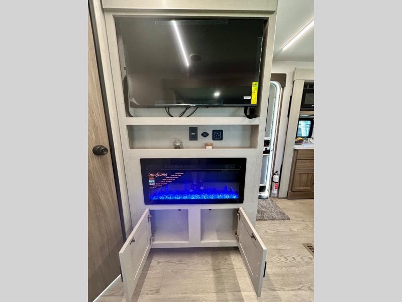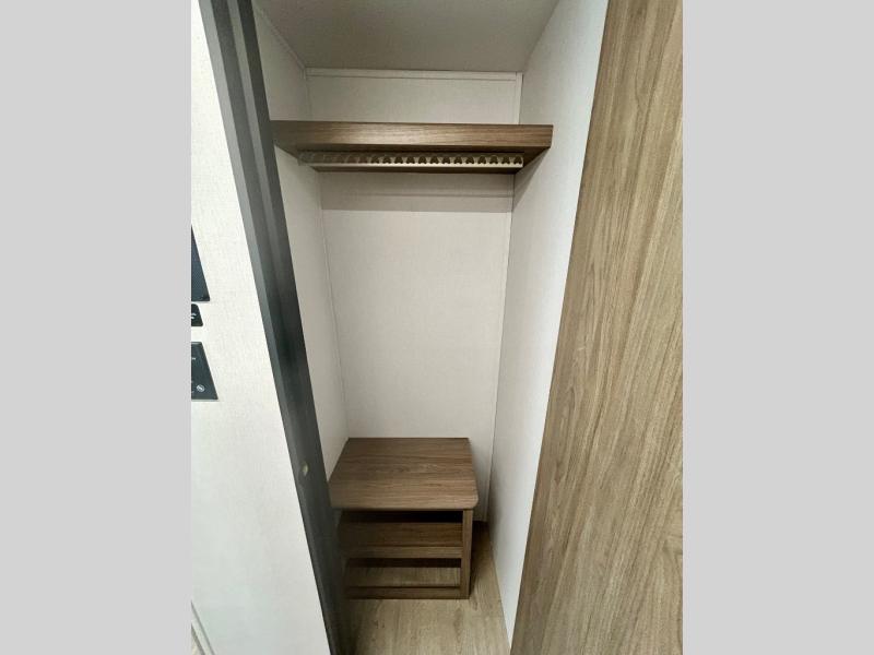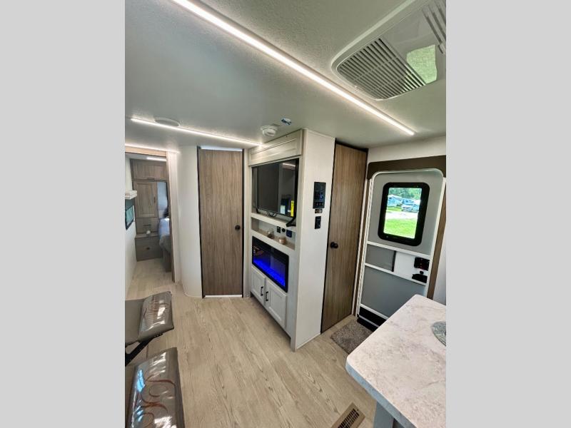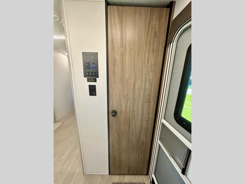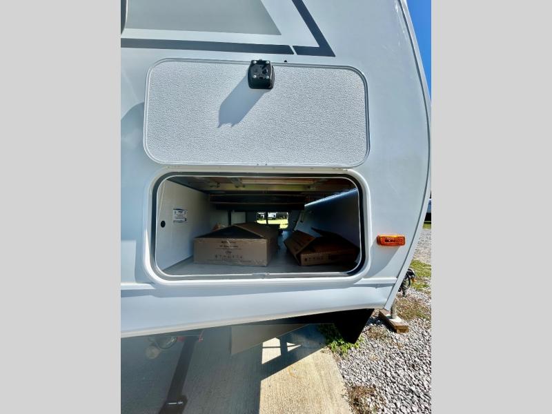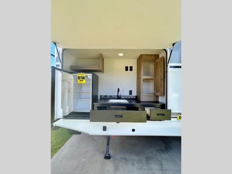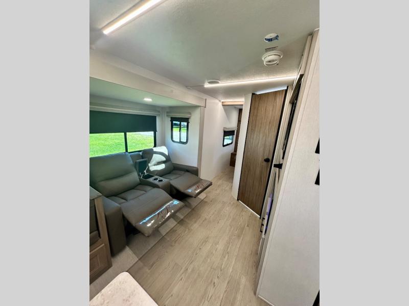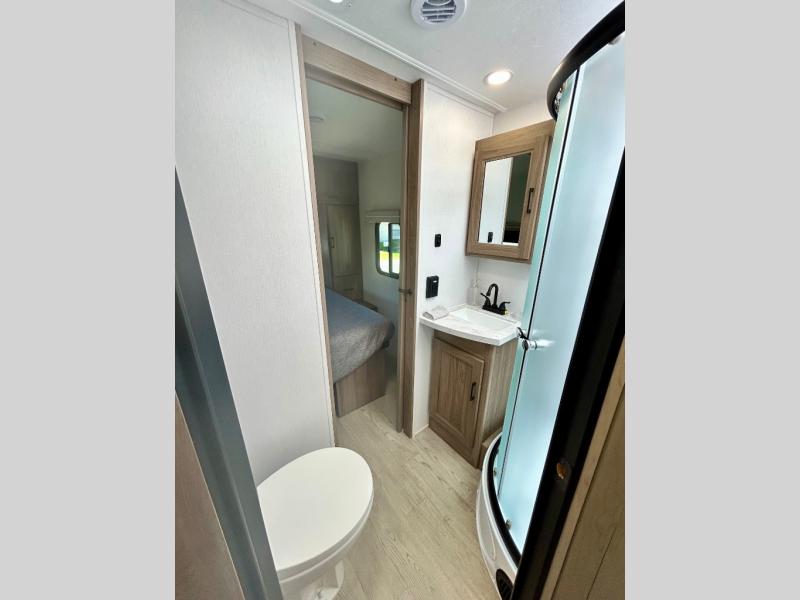 It won't be hard to find comfort and convenience in this travel trailer for eight. Once you've checked in at your campsite, grab your gear from the pass-through storage, put out the 20' awning, then start lunch on the full camp kitchen! If you'd rather cook inside, you'll find a three burner range and a microwave oven to cook meals, along with an 10 cu. ft. double door refrigerator, and pantry for food storage, plus a kitchen island for more prep space! The booth dinette provides a place to dine or play games, and the sofa can be switched out for an optional theater seat if you don't need the additional sleeping space. A stand-out feature on this model is the rear private bunkhouse with a flip-up bunk and roll-over sofa within a slide out, a second bunk across the room, a wardrobe with space for a TV, plus a second wardrobe for storage. And don't overlook the dual entry bath that leads to the front master bedroom, complete with a queen bed with underbed storage and dual wardrobes!