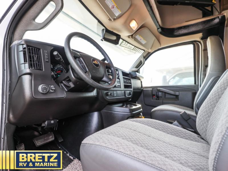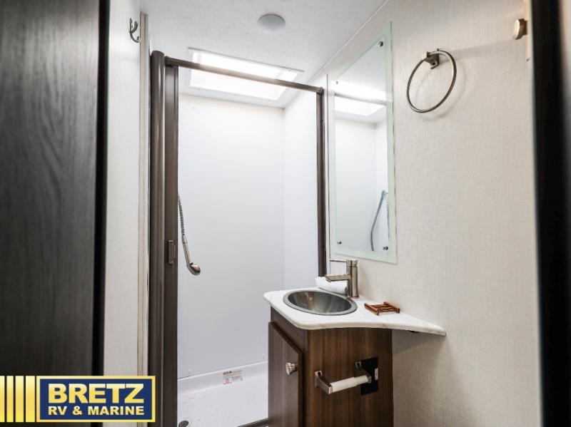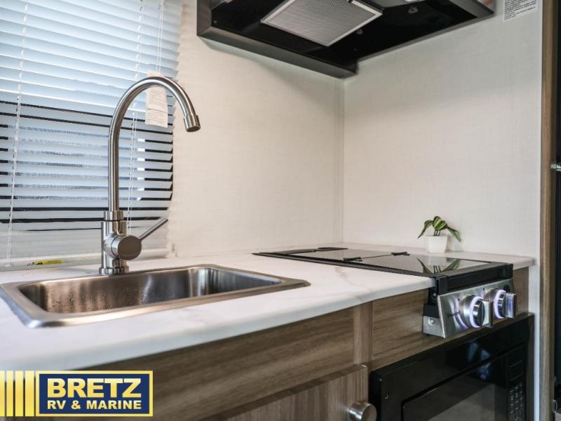 You will be met with comfort at every turn in this coach for six! Once you have stopped for the day, you can make lunch on the three burner cooktop and grab a cold drink from the 10 cu. ft. 12V refrigerator. There is a J-lounge with a pedestal table and extension where you can dine together, and the swing-arm TV in the cab will let you check the weather before heading outdoors. The rear corner full bath will let everyone freshen up when you return from hiking, and you'll enjoy a queen bed to sleep on each night, while your guest take the J-lounge and cab-over bunk!