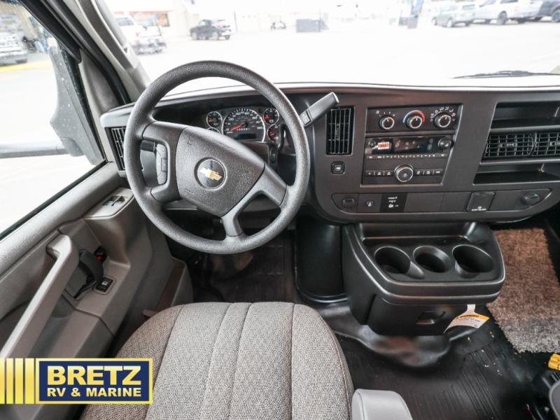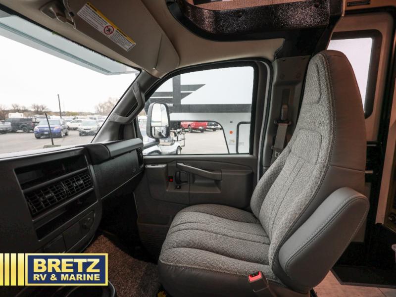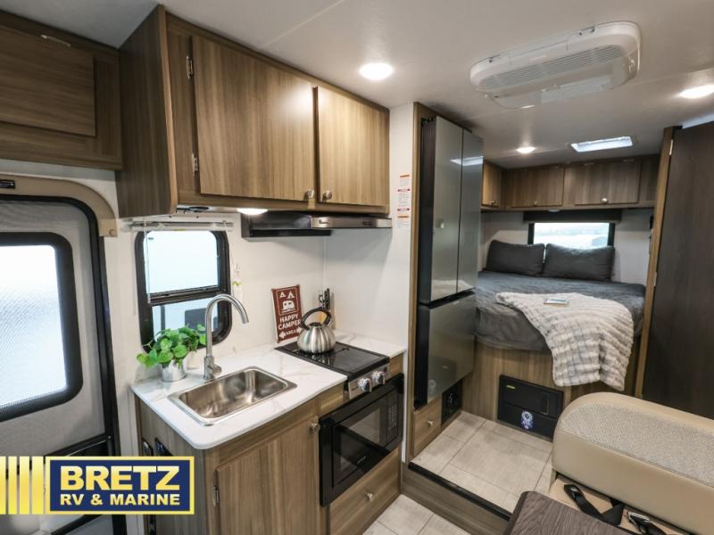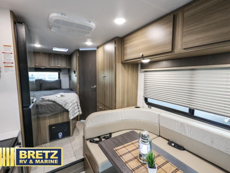 You will be met with comfort at every turn in this coach for six! Once you have stopped for the day, you can make lunch on the three burner cooktop and grab a cold drink from the 10 cu. ft. 12V refrigerator. There is a J-lounge with a pedestal table and extension where you can dine together, and the swing-arm TV in the cab will let you check the weather before heading outdoors. The rear corner full bath will let everyone freshen up when you return from hiking, and you'll enjoy a queen bed to sleep on each night, while your guest take the J-lounge and cab-over bunk!
