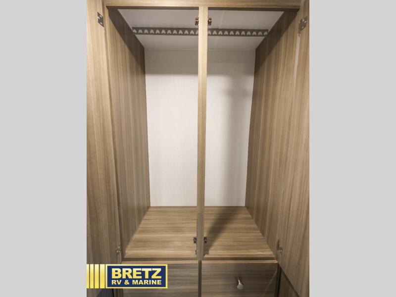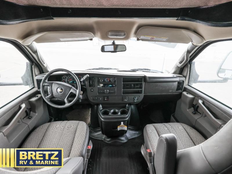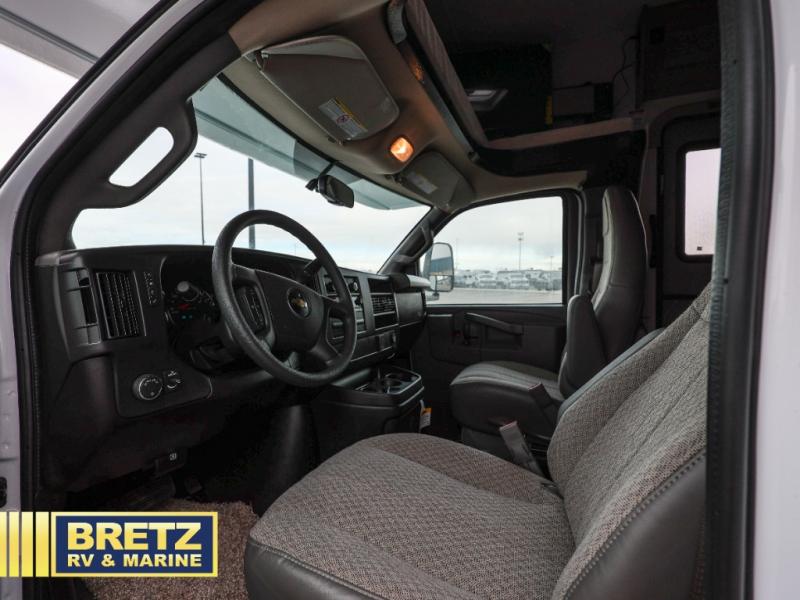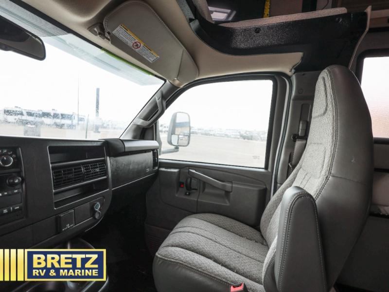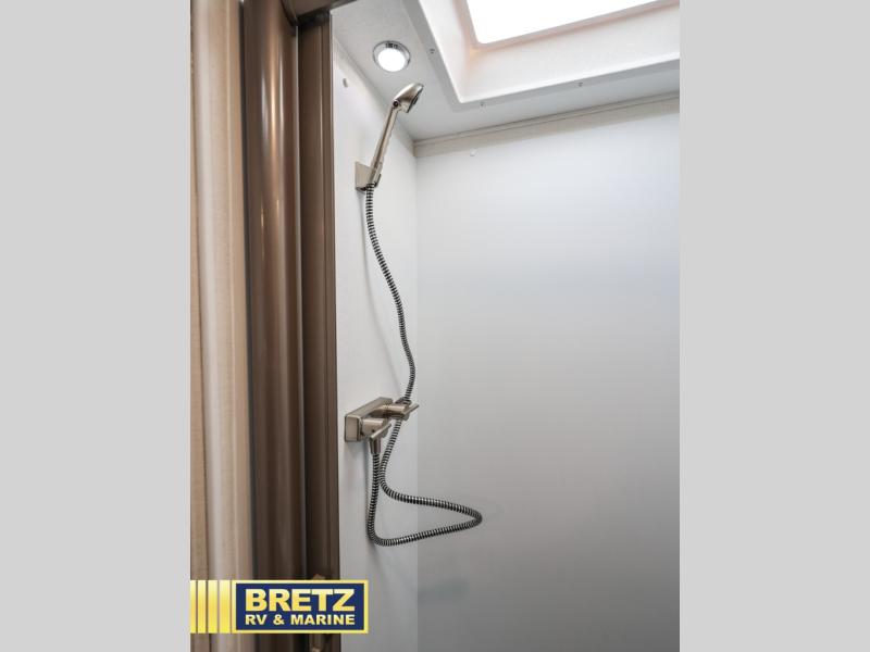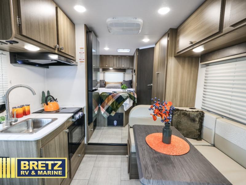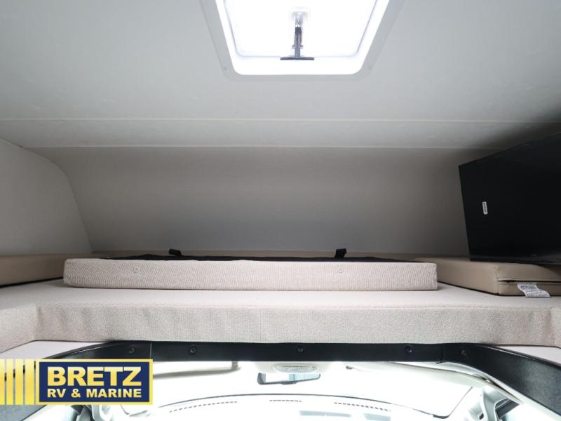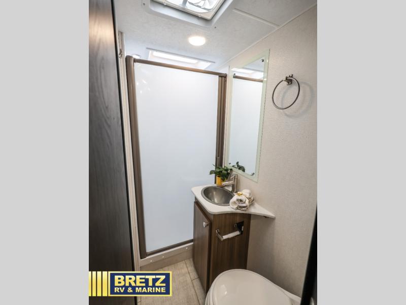 You will be met with comfort at every turn in this coach for six! Once you have stopped for the day, you can make lunch on the three burner cooktop and grab a cold drink from the 10 cu. ft. 12V refrigerator. There is a J-lounge with a pedestal table and extension where you can dine together, and the swing-arm TV in the cab will let you check the weather before heading outdoors. The rear corner full bath will let everyone freshen up when you return from hiking, and you'll enjoy a queen bed to sleep on each night, while your guest take the J-lounge and cab-over bunk!