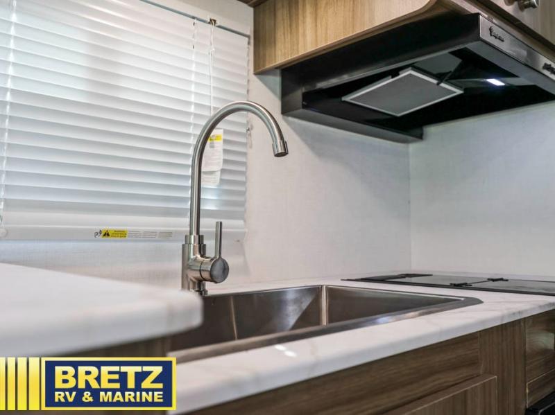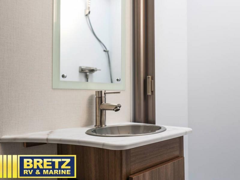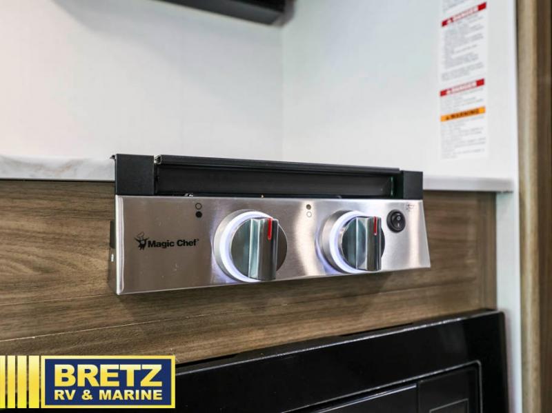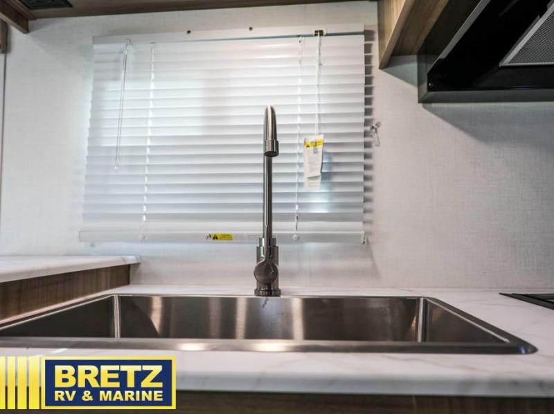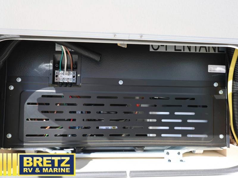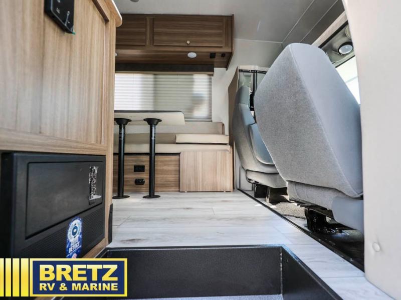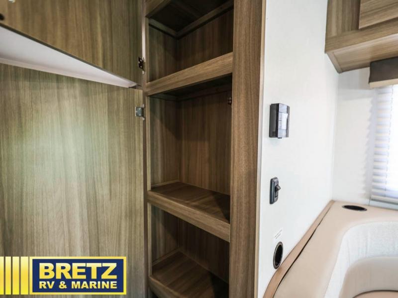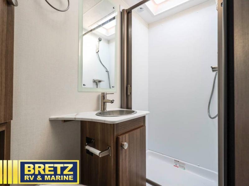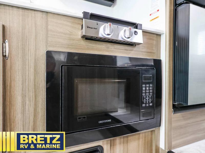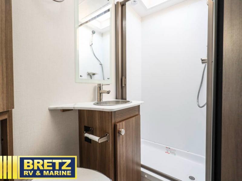 You will be met with comfort at every turn in this coach for six! Once you have stopped for the day, you can make lunch on the three burner cooktop and grab a cold drink from the 10 cu. ft. 12V refrigerator. There is a J-lounge with a pedestal table and extension where you can dine together, and the swing-arm TV in the cab will let you check the weather before heading outdoors. The rear corner full bath will let everyone freshen up when you return from hiking, and you'll enjoy a queen bed slide out to sleep on each night, while your guest take the J-lounge and cab-over bunk!