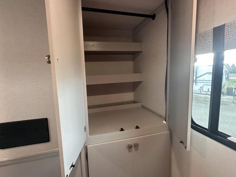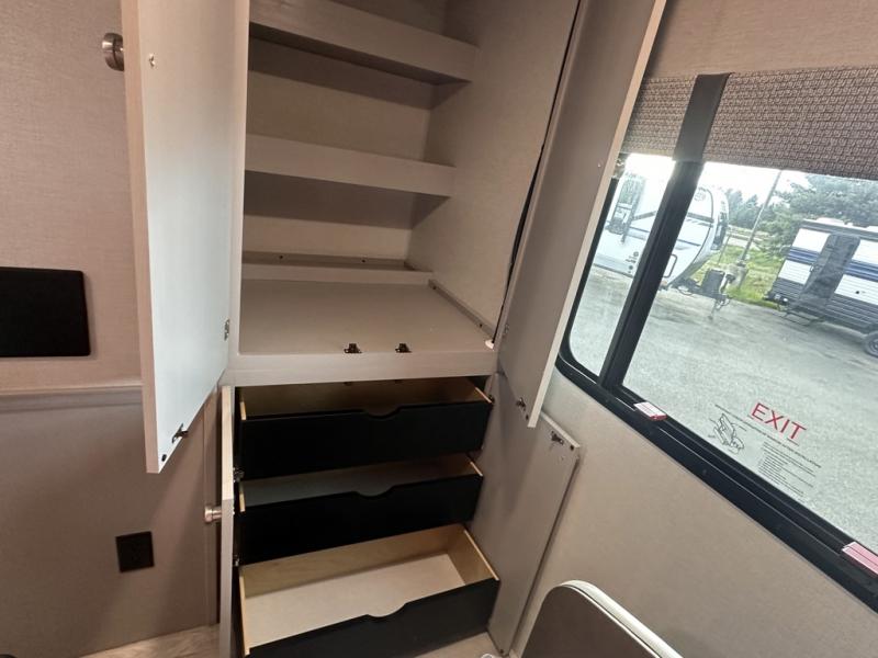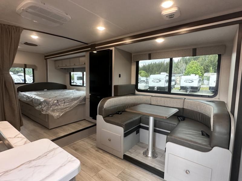 Enjoy a great escape in this motorhome! With a 60” x 80” queen bed and a 57” x 95” bunk over the cab, there’ll be plenty of space for everyone. Eat your meals at the spacious U-dinette or use it to spread out and play a board game once the dishes are cleared away. The kitchen rivals your home setup with a pantry, microwave, and stainless steel farmer's kitchen sink with a high-rise kitchen faucet. This model also includes the CRV Supersprings Ride with heavy duty stabilizer bars, chassis electronic stability control, SumoSprings front shock absorbers, and more!