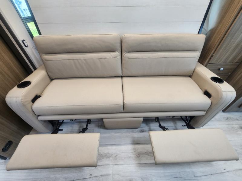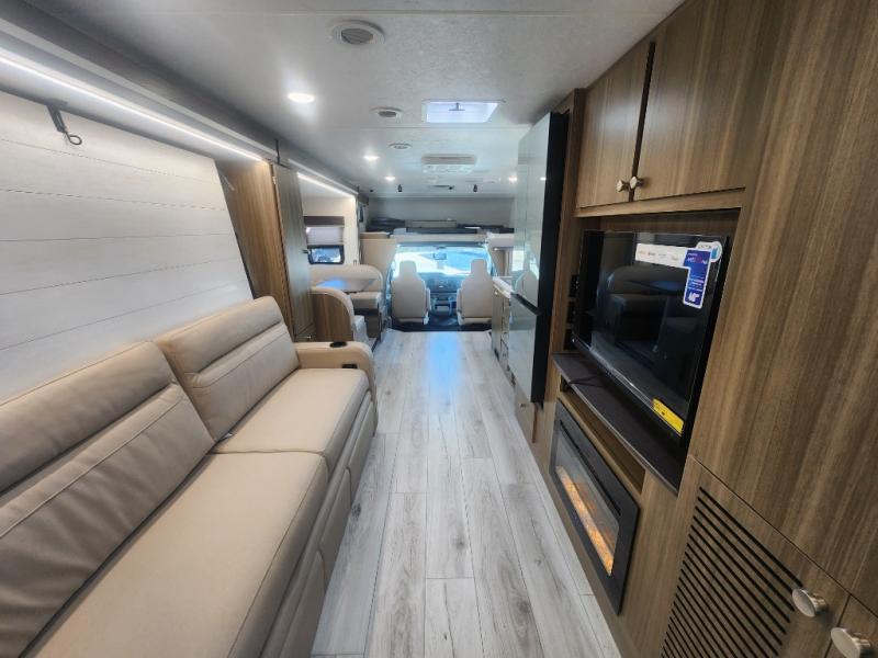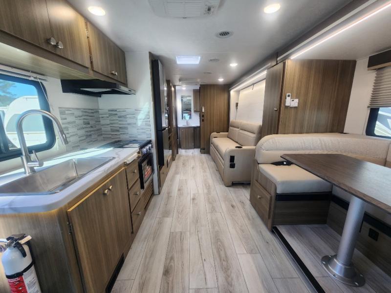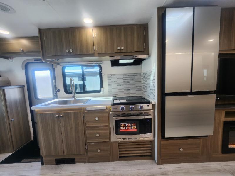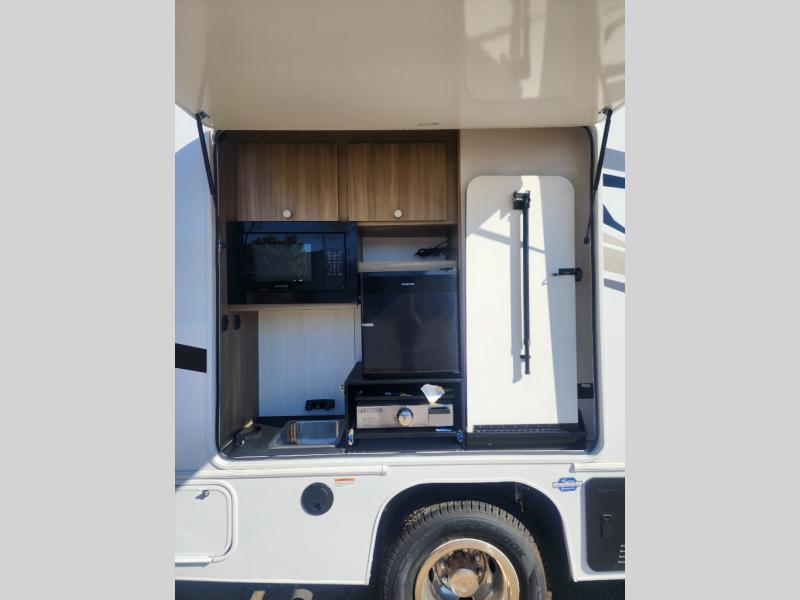 There is versatility found all throughout this motorhome! Starting with the 72" x 74" Murphy bed that offers a comfortable place to sleep and can convert into a 84" sofa to sit on during the day. Across from it is a 40" Smart TV with an optional fireplace below it plus optional washer and dryer ready. The 57" x 80" bunk over cab offers additional sleeping or storage space, and you could even transform the 44" x 82" U-shaped dinette into an extra sleeping space. The fully equipped kitchen has a pull-out countertop extension to make meal prepping easier and there is even an outside kitchen so you can cook dinner in the great outdoors!