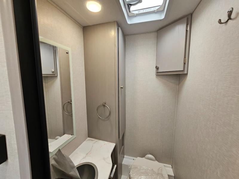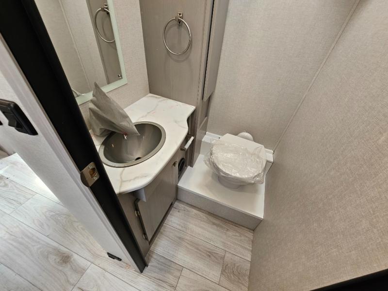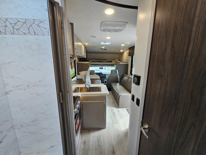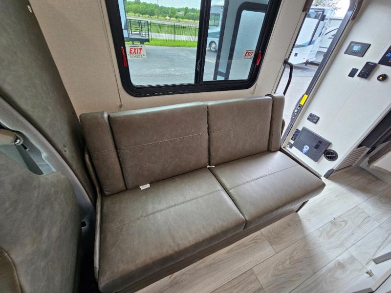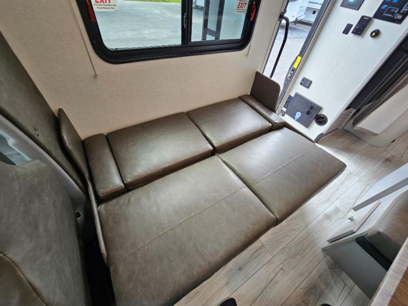 Sneak off for a getaway in this motorhome that has everything you might need! The private rear bedroom has a 60” x 80” queen bed with storage on either side and plenty of room to walk around. The bathroom is split with the shower on one side and the sink and toilet behind a separate door so sharing is a breeze. Relax up front on either the sofa or the roomy 42” x 71” dinette with cabinets above for all your supplies. A bunk over the cab provides yet another sleeping area that will be popular with little ones.