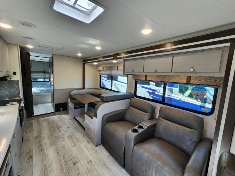 Perfect indoor and outdoor spaces define this great motorhome! Inside you’ll feel right at home with a spacious living area. The sofa faces the TV which is on a lift so can be tucked away out of sight when you aren’t watching. The U-dinette offers even more space for the whole family to enjoy meals cooked in the kitchen. A mid-coach bath can be used by two people at once as the shower is across the hall from the toilet/sink room. A rear bedroom with queen bed and roomy wardrobes lets you bring many changes of clothes. Step outside under the power patio awning with LED light, or add on the optional camp kitchen so you can cook under the open sky. There is even an optional outside entertainment center if you enjoy watching the big game outdoors! This model also includes the CRV Supersprings Ride with heavy duty stabilizer bars, chassis electronic stability control, SumoSprings front shock absorbers, and more!