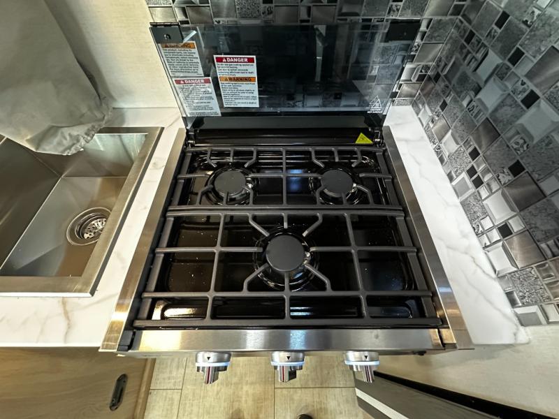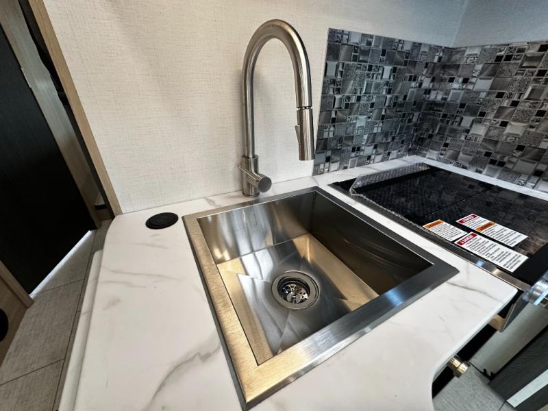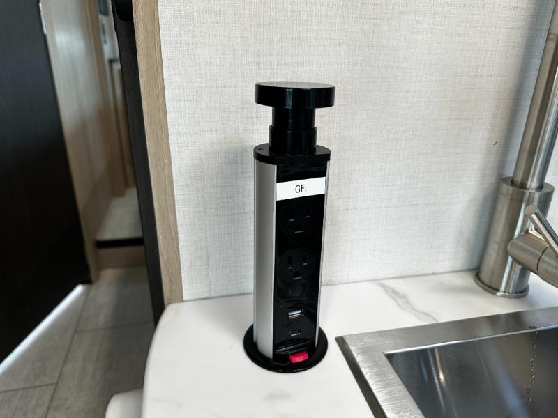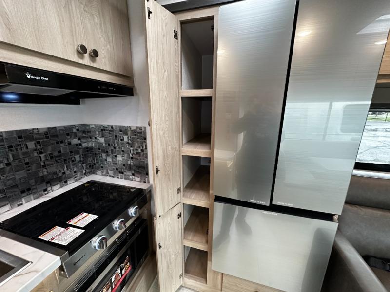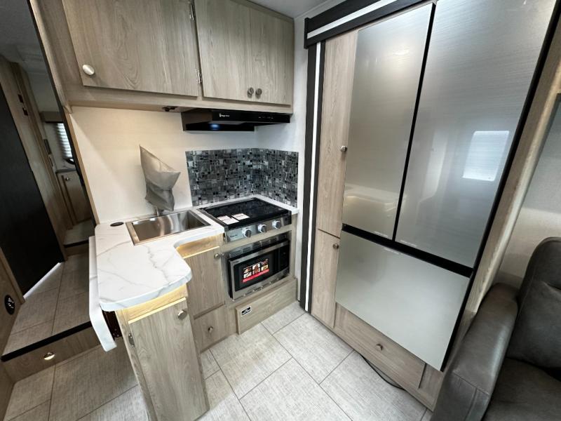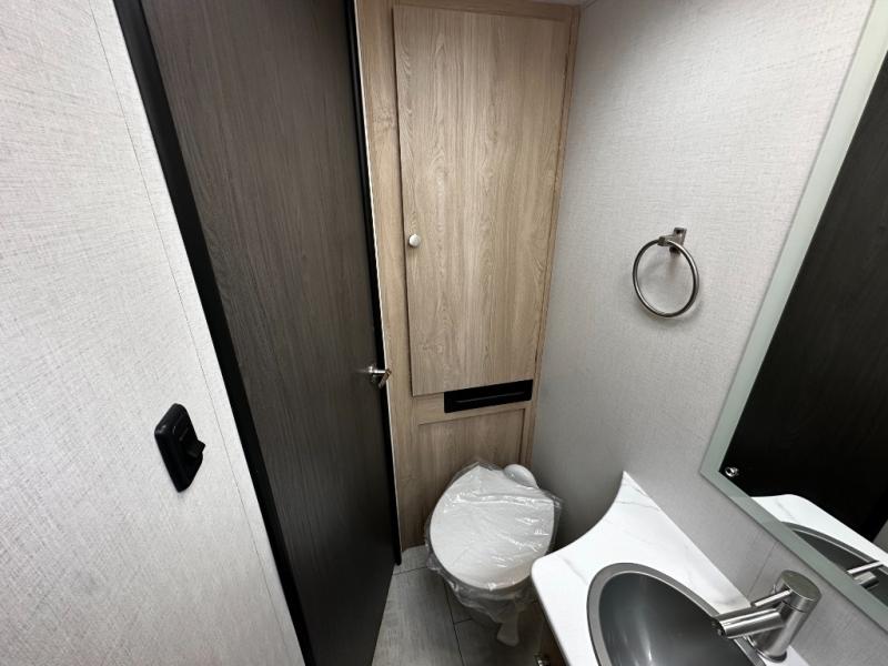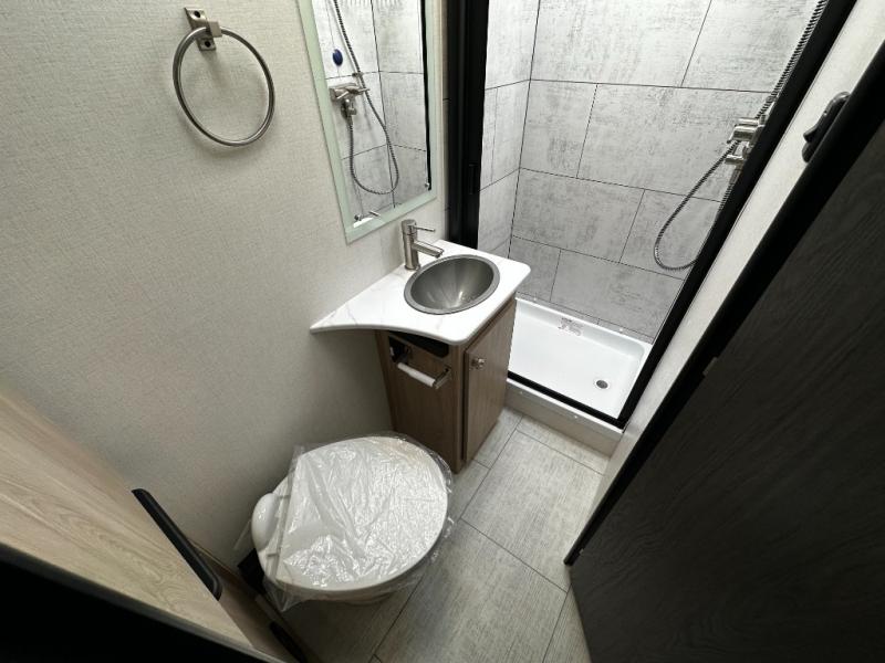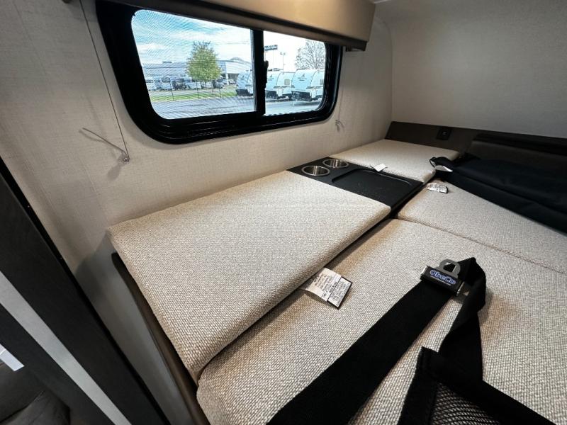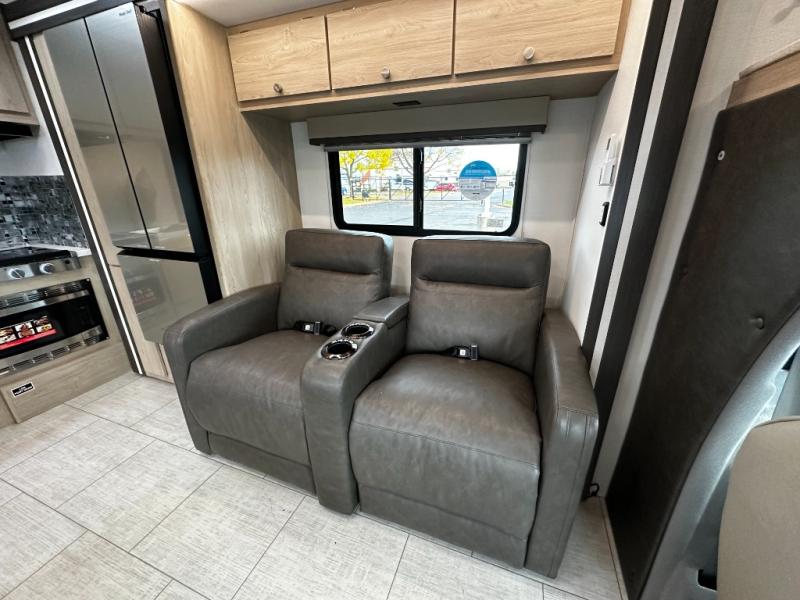 Step inside and enjoy a bright, open living area created by two spacious slide-outs. The well-equipped kitchen offers ample countertop space, quality appliances, and smart storage for easy meal prep on the road. A comfortable dinette and sofa provide inviting seating options for relaxing, dining, or entertaining. In the rear, the private bedroom features a walk-around bed, wardrobe storage, and a cozy feel that makes every night restful. The full bathroom is designed with everyday convenience in mind, giving you the comfort and function you expect from a home-like RV.