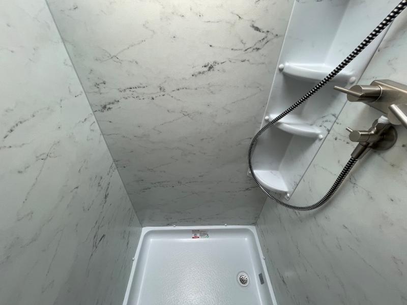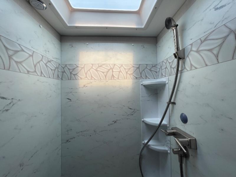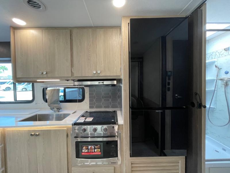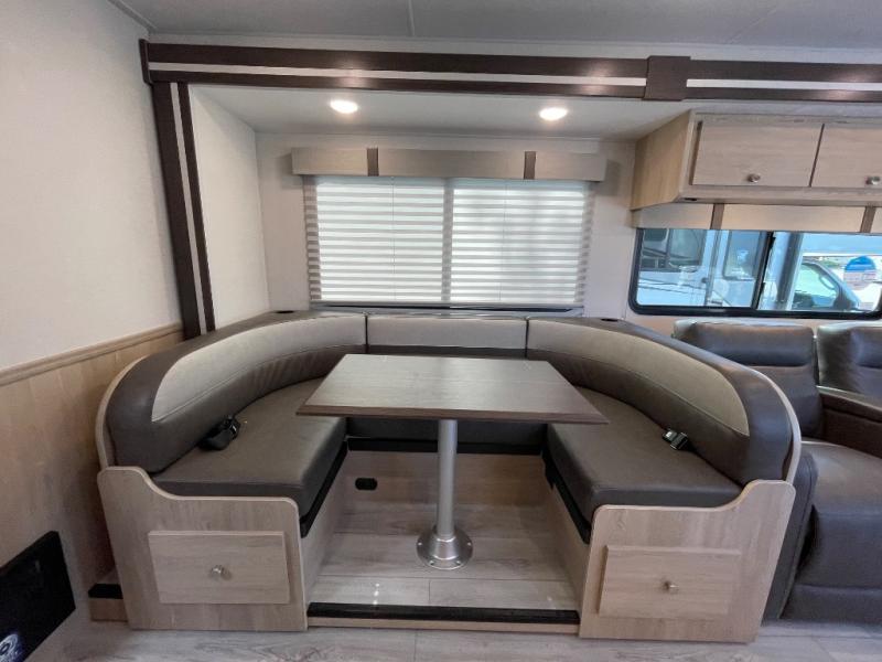 You'll have the time of your life in this Leprechaun Class C gas motorhome! There is a rear private bedroom with a queen-size bed and a wardrobe slide, and the bedroom is right next to the bathroom for convenience. Here you'll find a private toilet and sink with the shower right across the hall, and you can close off this space to make one big bathroom if you want! Out in the main living area, there is a large slide that holds the U-shaped dinette and sofa. These pieces of furniture sit directly across from the kitchen so that you can chat with the chef while preparing meals on the three-burner range or in the microwave. If you enjoy cooking outdoors, you might want to choose the optional camp kitchen!