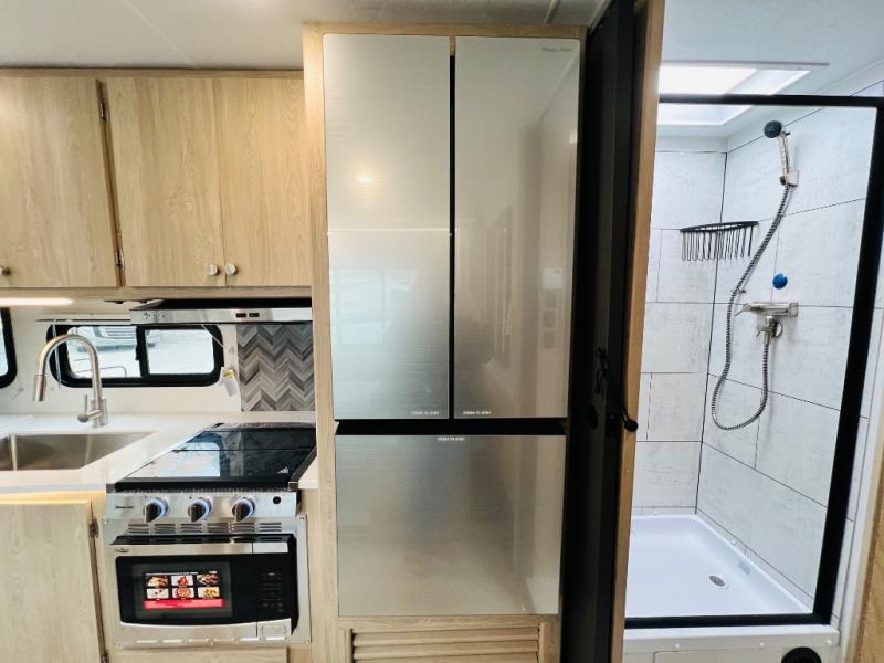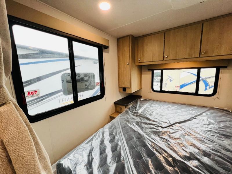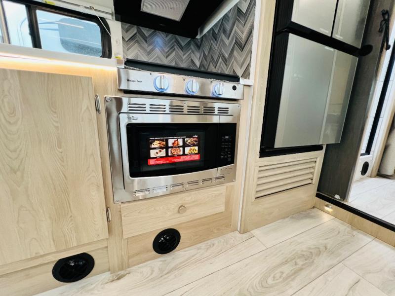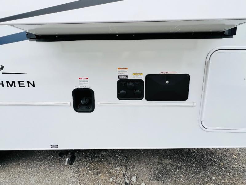 You'll have the time of your life in this Leprechaun Class C gas motorhome! There is a rear private bedroom with a queen-size bed and a wardrobe slide, and the bedroom is right next to the bathroom for convenience. Here you'll find a private toilet and sink with the shower right across the hall, and you can close off this space to make one big bathroom if you want! Out in the main living area, there is a large slide that holds the U-shaped dinette and sofa. These pieces of furniture sit directly across from the kitchen so that you can chat with the chef while preparing meals on the three-burner range or in the microwave. If you enjoy cooking outdoors, you might want to choose the optional camp kitchen!