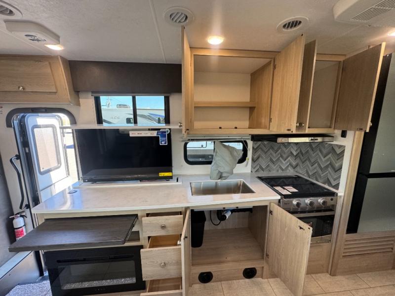 You'll have the time of your life in this Leprechaun Class C gas motorhome! There is a rear private bedroom with a queen-size bed and a wardrobe slide, and the bedroom is right next to the bathroom for convenience. Here you'll find a private toilet and sink with the shower right across the hall, and you can close off this space to make one big bathroom if you want! Out in the main living area, there is a large slide that holds the U-shaped dinette and sofa. These pieces of furniture sit directly across from the kitchen so that you can chat with the chef while preparing meals on the three-burner range or in the microwave. If you enjoy cooking outdoors, you might want to choose the optional camp kitchen!