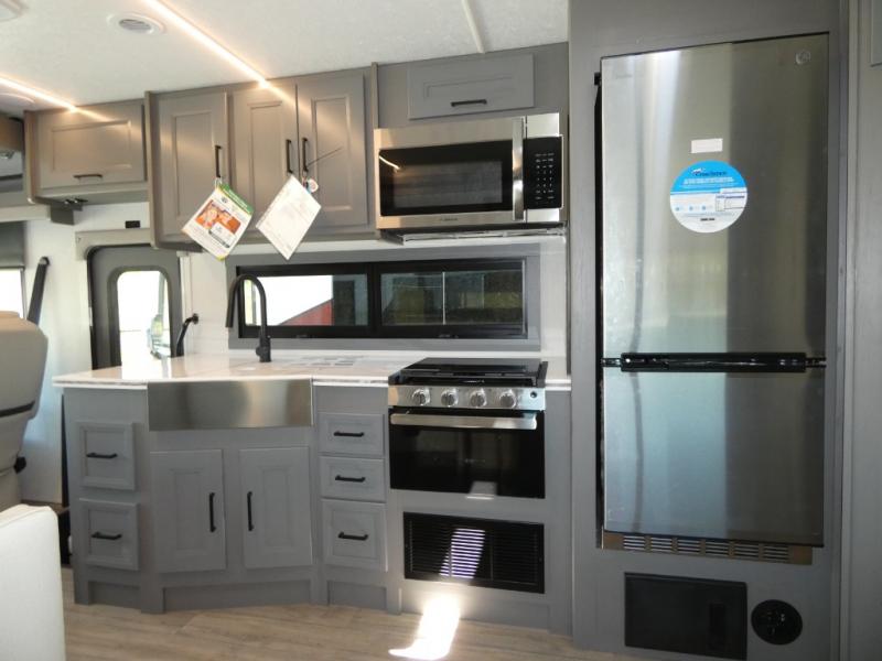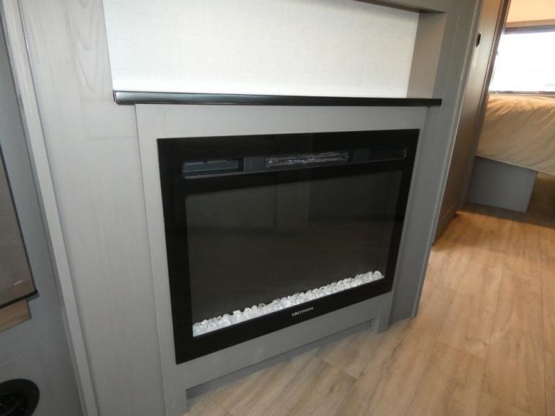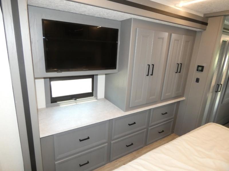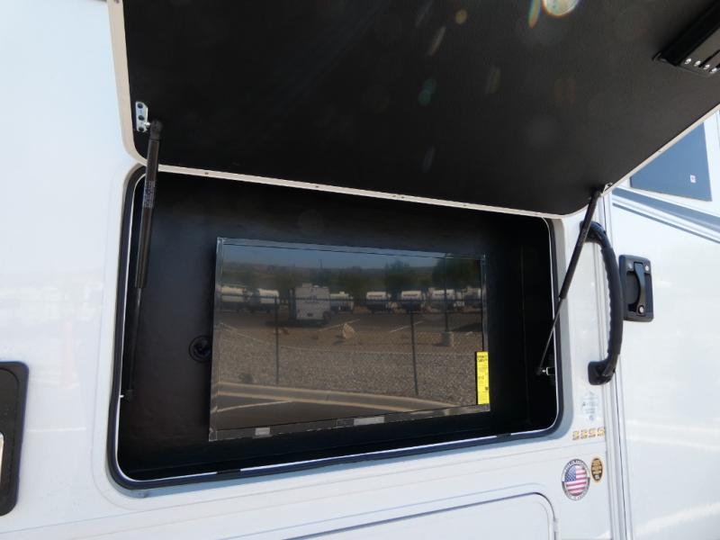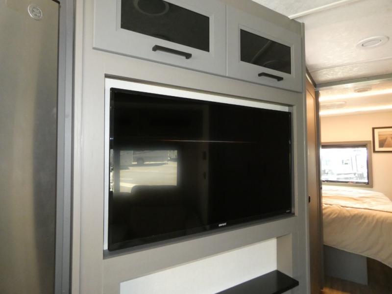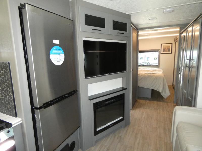 You and your family will be fascinated with this motor home. Perfect for family and guests due to its plenty of room to sleep, like the 70" x 74" king bed for a couple, and the 47" x 81" overhead bunk where two more people can easily fit. This unit is equipped with all the facilities need for a comfortable ride starting with a full bathroom with a 30" x 36" shower, interior kitchen with fridge, farm sink, three cooktop burners, microwave and a 42" x 76" dinette ideal to eat the dinner comfortably. You can also have relaxing and entertaining time whether watching the TV in the living room while enjoying the fireplace or in the 32" bedroom LED TV. In this motorhome, you will also find plenty of space to store your stuff in diverse parts, like wardrobe, dresser, and overhead cabinets in the bedroom area, as well as linen/ pantry and overhead cabinets in the kitchen area. Finally, enjoy the nicest meals in the outdoor kitchen, allowing you to have a great time having food while admiring the surroundings.