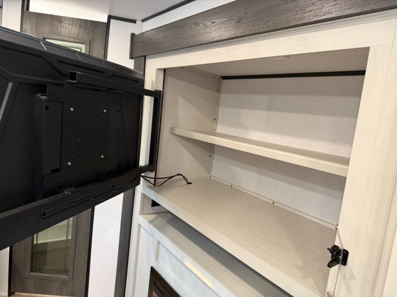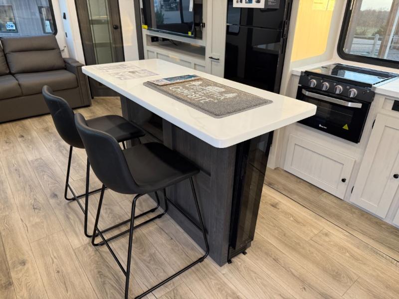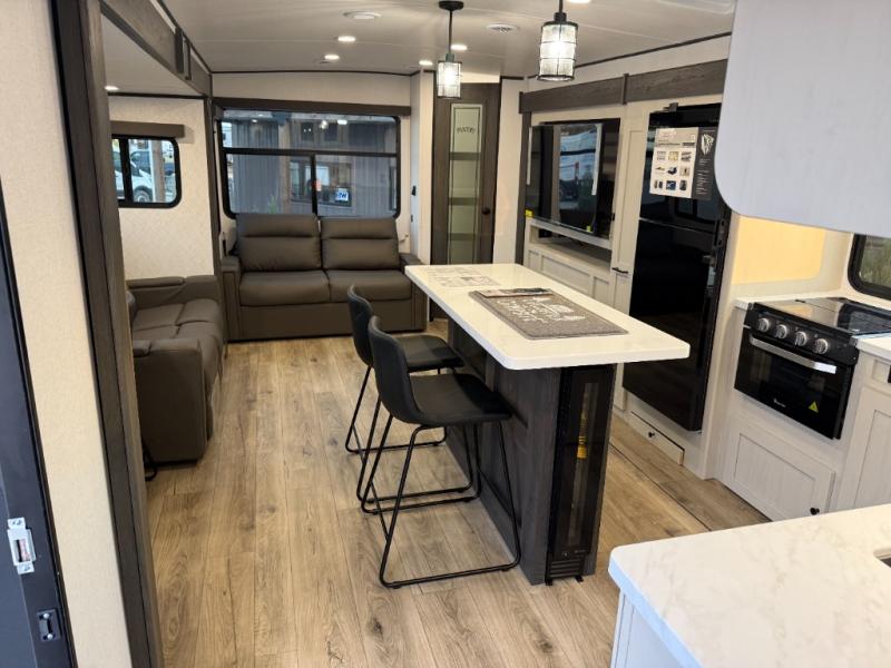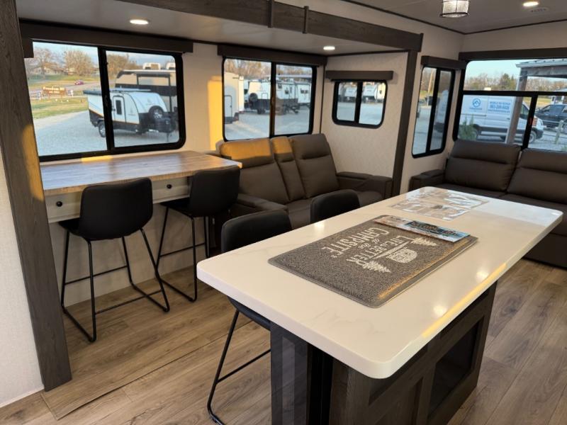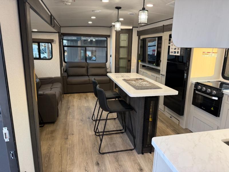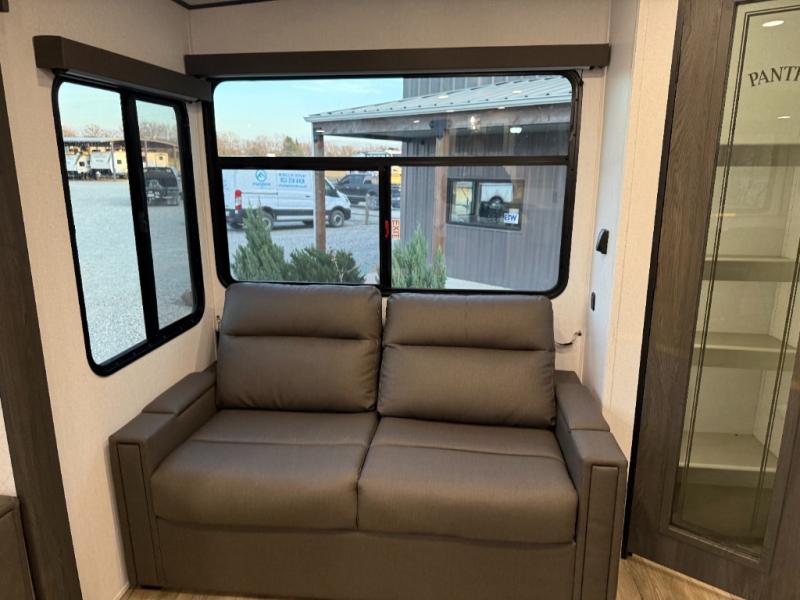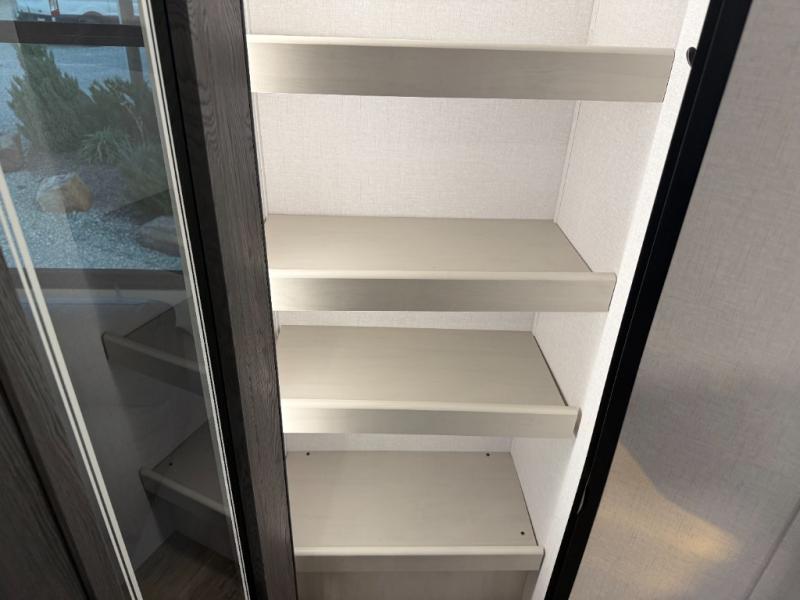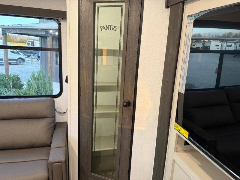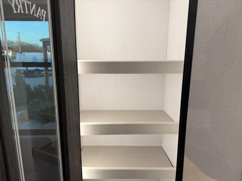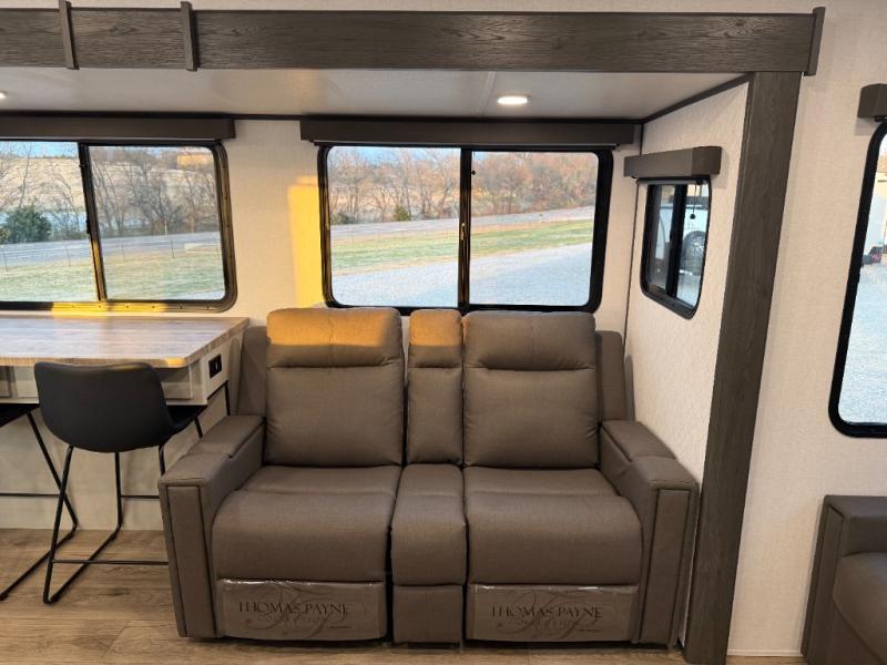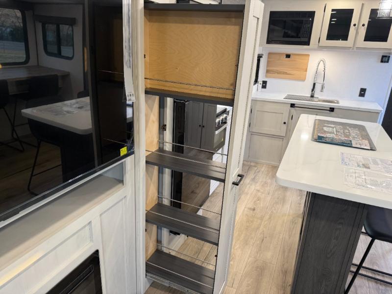 Escape to a world of adventure and relaxation with this incredible travel trailer! The rear living area is a dynamic hub of entertainment, featuring a versatile tri-fold sofa and a premium theater seat that lets you immerse yourself in your favorite shows or movies. The cutting-edge entertainment center provides endless hours of fun. Equipped with top-of-the-line appliances, including a spacious refrigerator, three-burner range, and microwave, the kitchen is a culinary haven. The functional kitchen island provides additional counter space, while the generous walk-in pantry and ample overhead cabinets keep your kitchen essentials organized and within easy reach. The front bedroom is a serene sanctuary, featuring a comfortable queen bed with plenty of storage under it and spacious wardrobes on each side of the bed, ideal for keeping your favorite outfits organized and free of dirt.