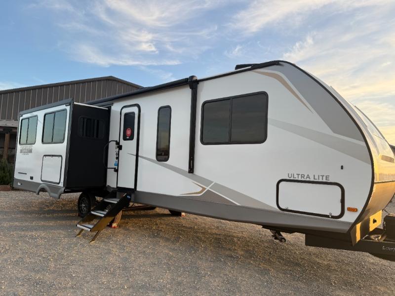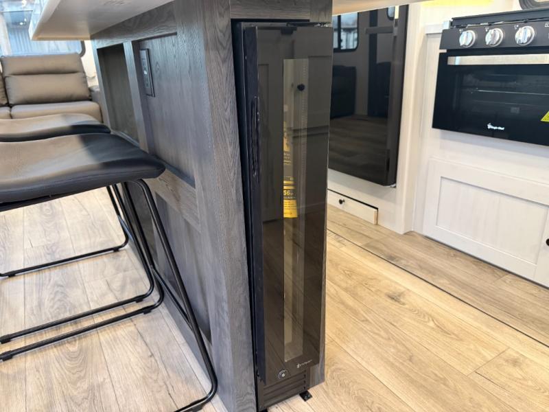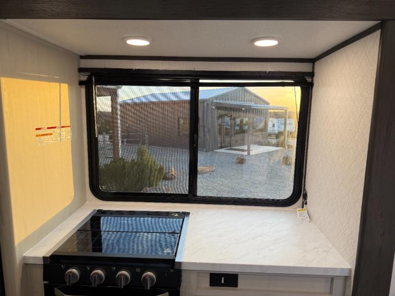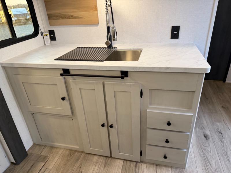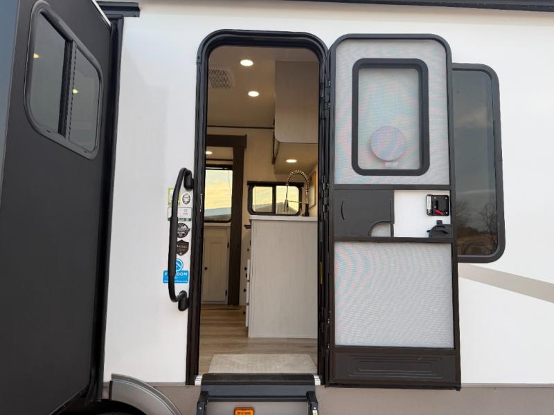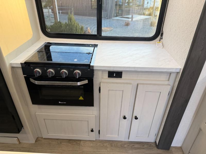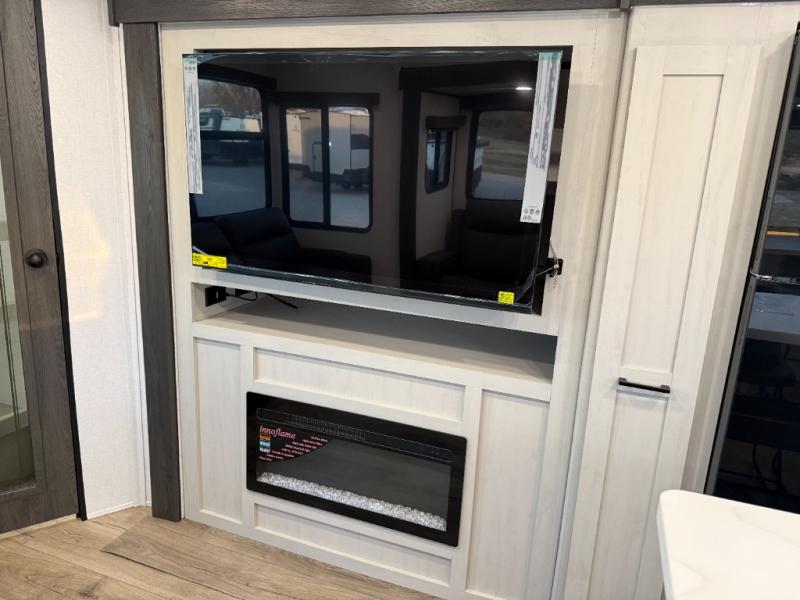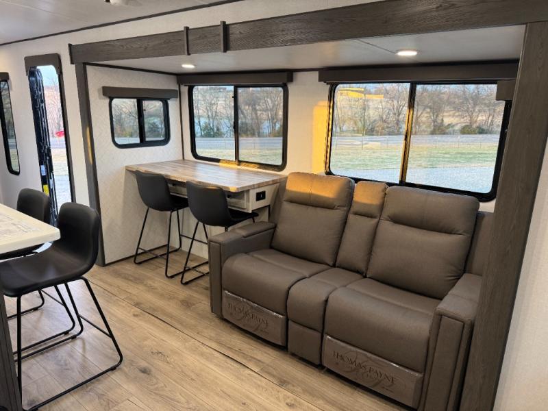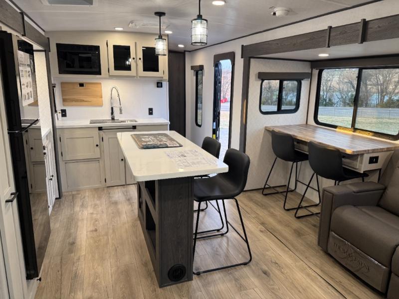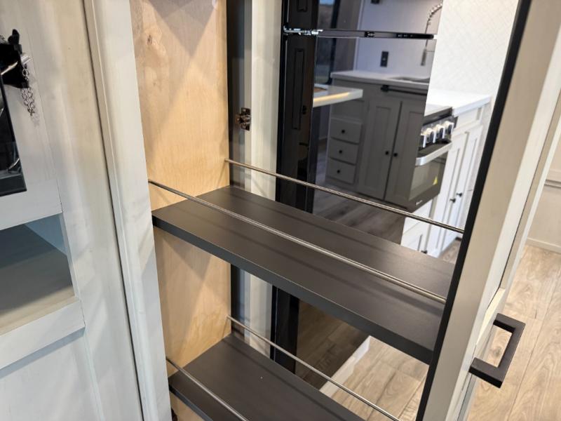 Escape to a world of adventure and relaxation with this incredible travel trailer! The rear living area is a dynamic hub of entertainment, featuring a versatile tri-fold sofa and a premium theater seat that lets you immerse yourself in your favorite shows or movies. The cutting-edge entertainment center provides endless hours of fun. Equipped with top-of-the-line appliances, including a spacious refrigerator, three-burner range, and microwave, the kitchen is a culinary haven. The functional kitchen island provides additional counter space, while the generous walk-in pantry and ample overhead cabinets keep your kitchen essentials organized and within easy reach. The front bedroom is a serene sanctuary, featuring a comfortable queen bed with plenty of storage under it and spacious wardrobes on each side of the bed, ideal for keeping your favorite outfits organized and free of dirt.
