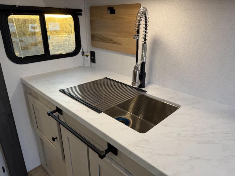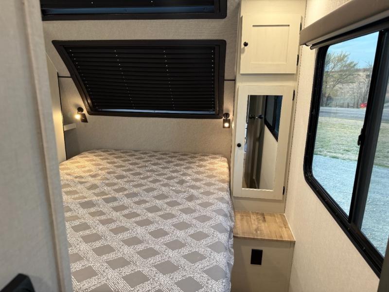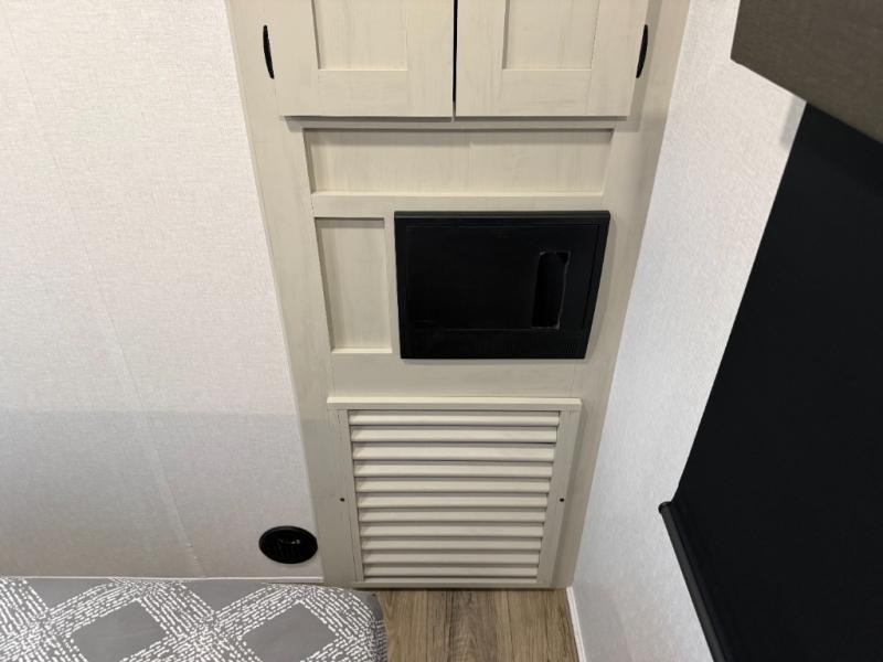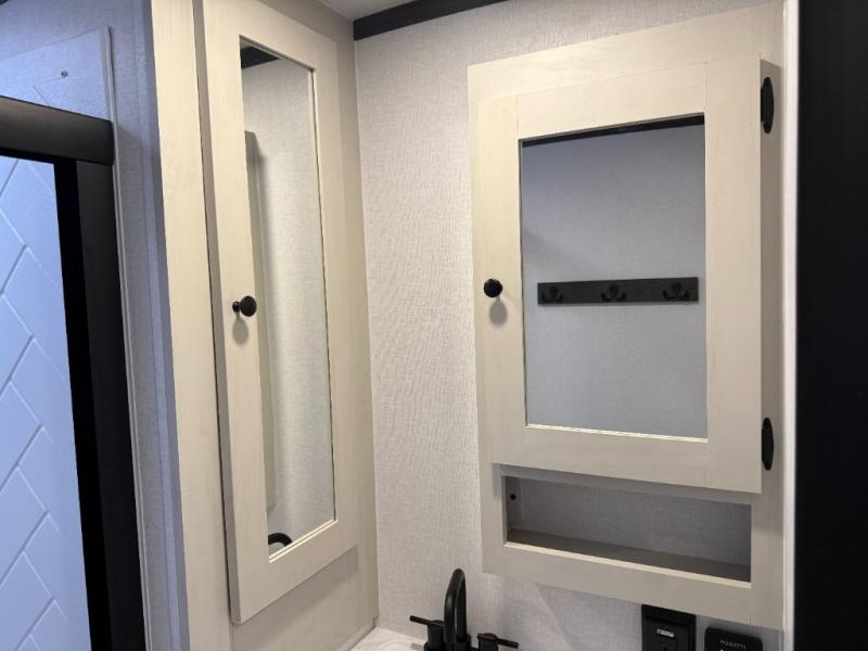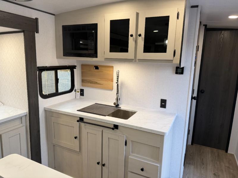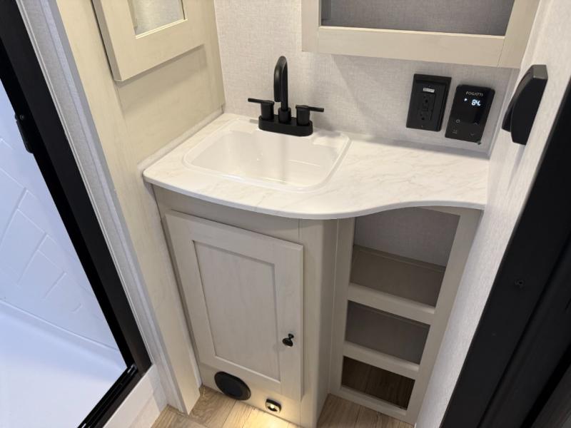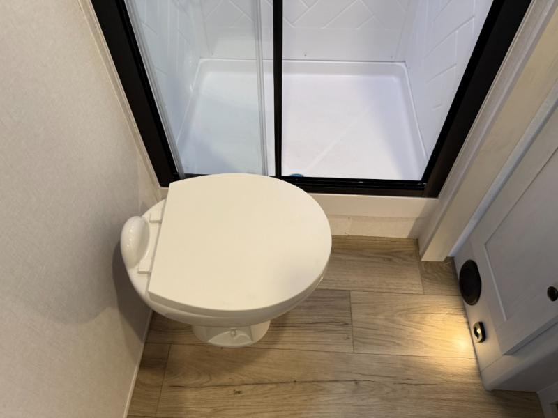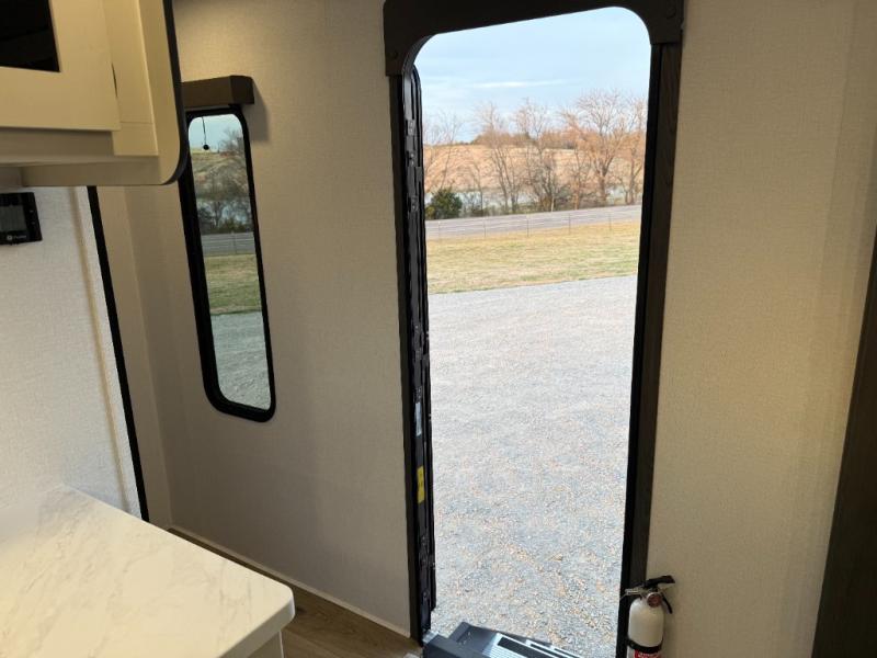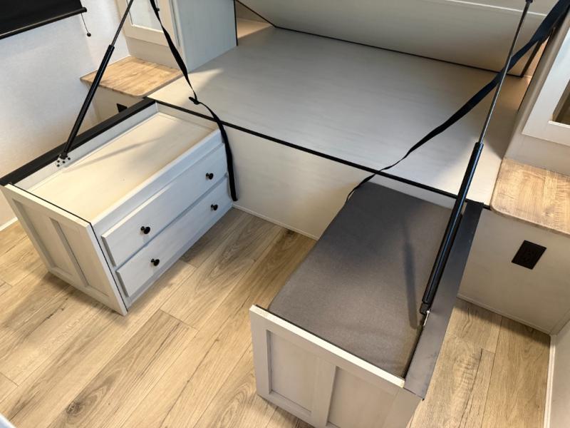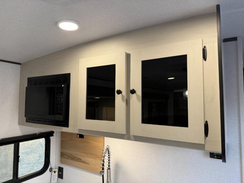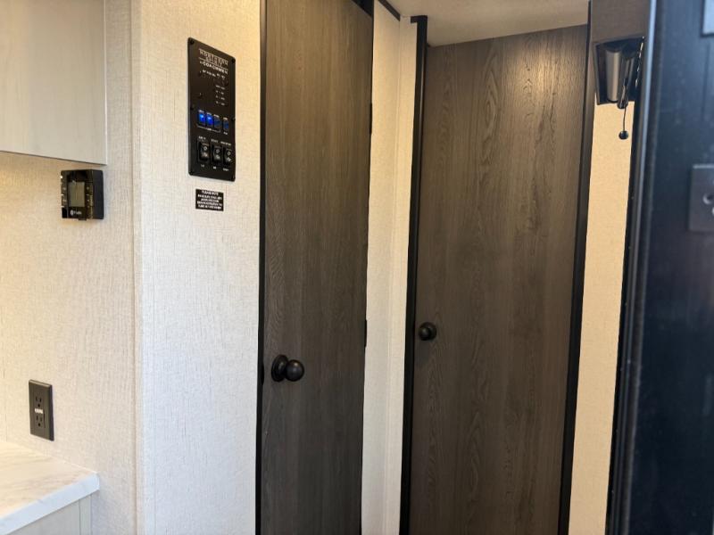 Escape to a world of adventure and relaxation with this incredible travel trailer! The rear living area is a dynamic hub of entertainment, featuring a versatile tri-fold sofa and a premium theater seat that lets you immerse yourself in your favorite shows or movies. The cutting-edge entertainment center provides endless hours of fun. Equipped with top-of-the-line appliances, including a spacious refrigerator, three-burner range, and microwave, the kitchen is a culinary haven. The functional kitchen island provides additional counter space, while the generous walk-in pantry and ample overhead cabinets keep your kitchen essentials organized and within easy reach. The front bedroom is a serene sanctuary, featuring a comfortable queen bed with plenty of storage under it and spacious wardrobes on each side of the bed, ideal for keeping your favorite outfits organized and free of dirt.