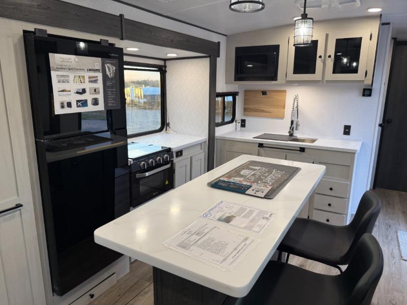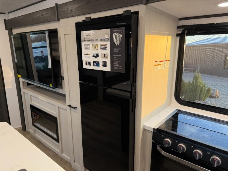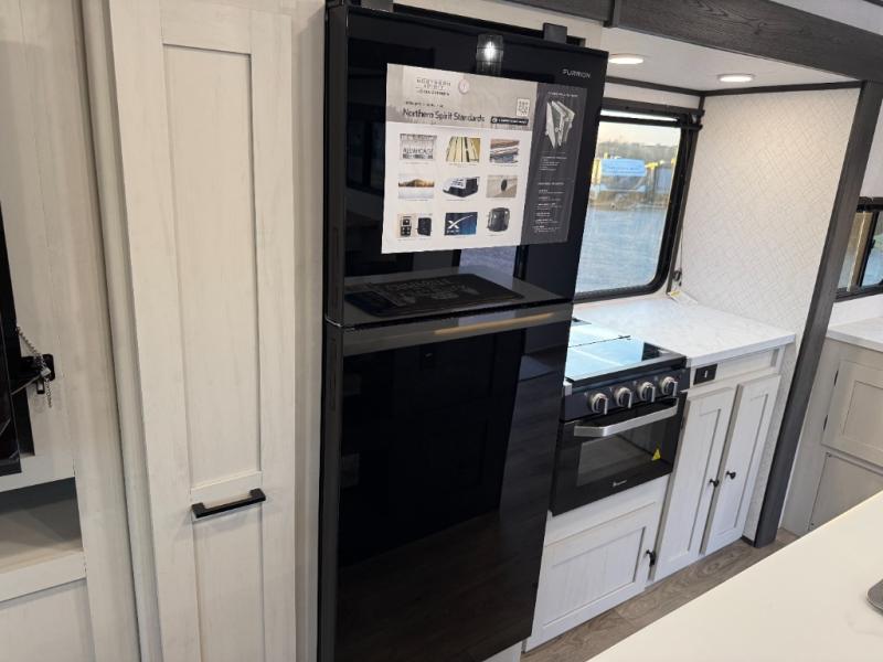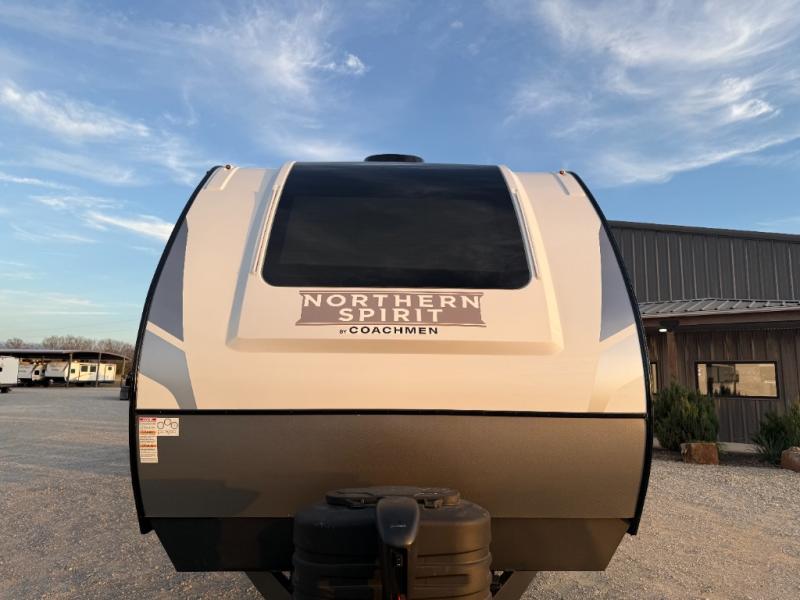With any Northern Spirit Ultra Lite travel trailer by Coachmen, the "Twice Cool" dual ducted air conditioning system, motion activated floor lights, and the motion activated pass-through storage light plus fishing pole storage, will make your camping experience simplified. The heated and enclosed underbelly provides protection on the road, the 200W solar panel with 30 amp controller provides off-grid camping, and the power tongue jack makes setup easier. Each is built with a front cap with LED strip lights, a laminated, aluminum framed floor, rear wall, and sidewalls, plus a fully walkable roof with seamless Tufflex PVC covering. Make your decision today, and camp with everything in its place!