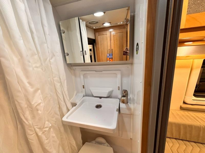 This camper van with a full rear bath will meet your needs surprisingly well. Two twin beds will provide comfortable sleeping space each night, and the swivel table in between the beds will be the perfect place to enjoy breakfast together. There is a bath wardrobe to keep your clothes tidy, plus you'll find overhead cabinets above the beds and additional storage just as you enter the coach for your belongings. This coach also includes swivel captain's seats so you can turn them around for living room seating!