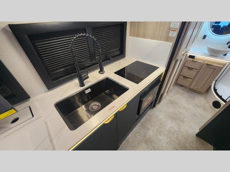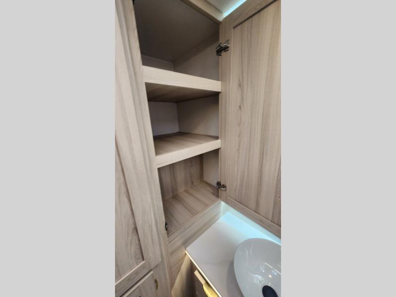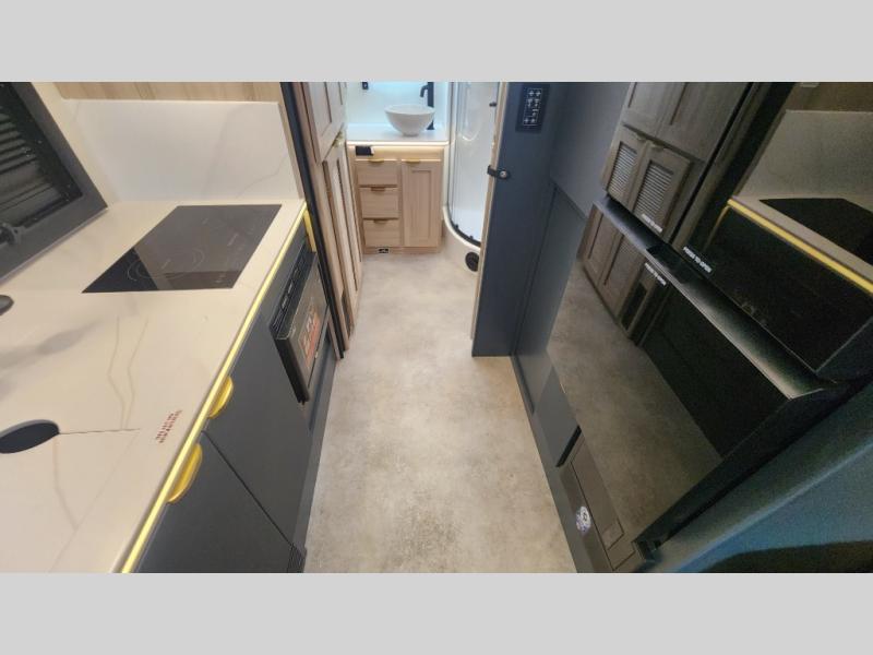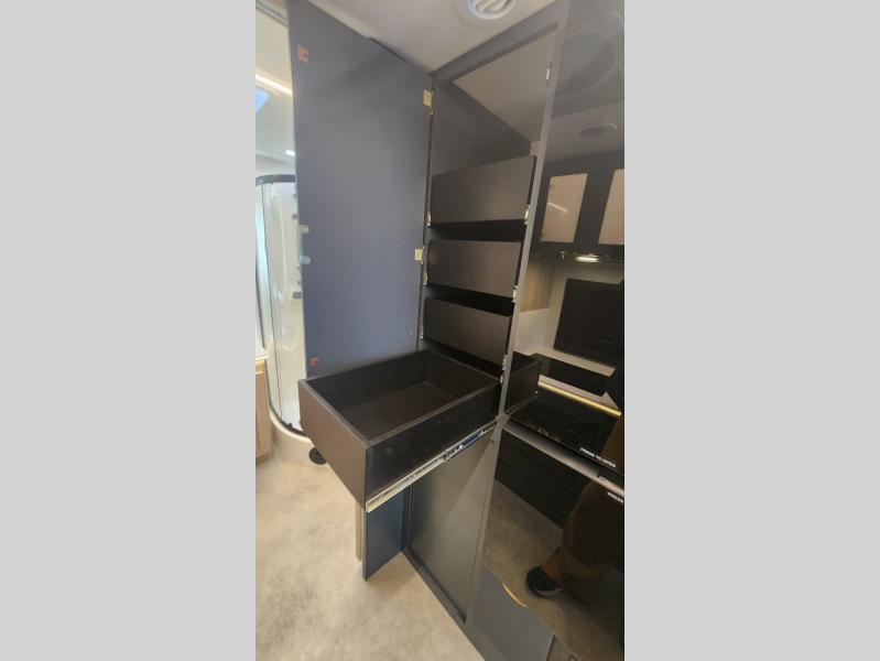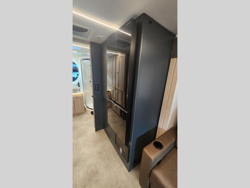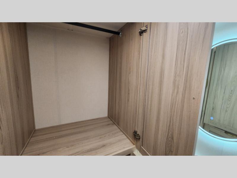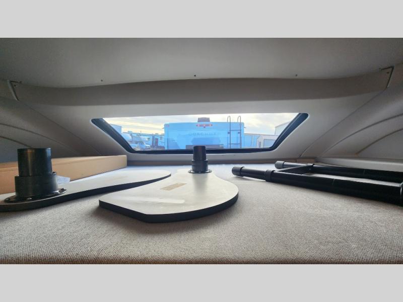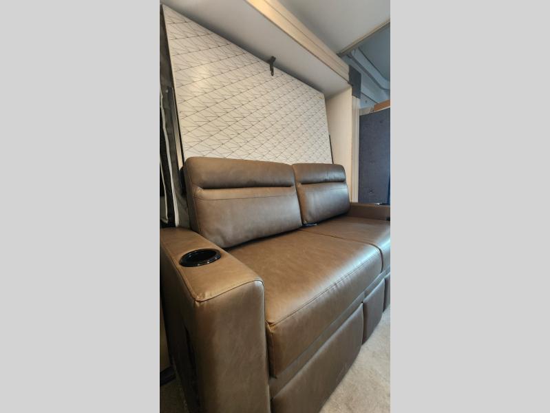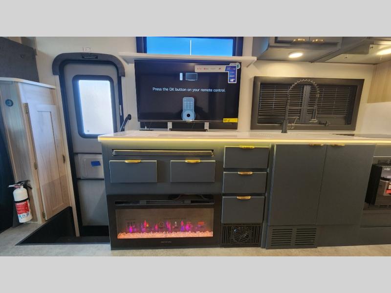 You will enjoy the versatility that this Murphy bed model provides. Depending on whether it is daytime or evening will determine if you have a 60" x 74" bed that slides out or a 62" sofa to enjoy. There is a 45" x 76" bunk over cab that can be used for added sleeping for two more guests or used as added storage space. The rear full bath is spacious and private and includes a 35" x 35" angled shower, toilet, vanity with sink, plus linen cabinet, and wardrobe. The kitchen features everything needed to create meals while on the go, and a cozy fireplace is included beneath the coach TV for your enjoyment.