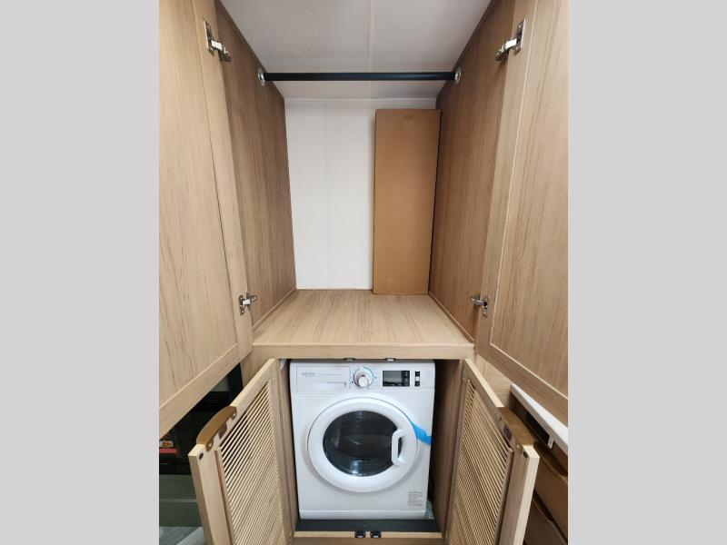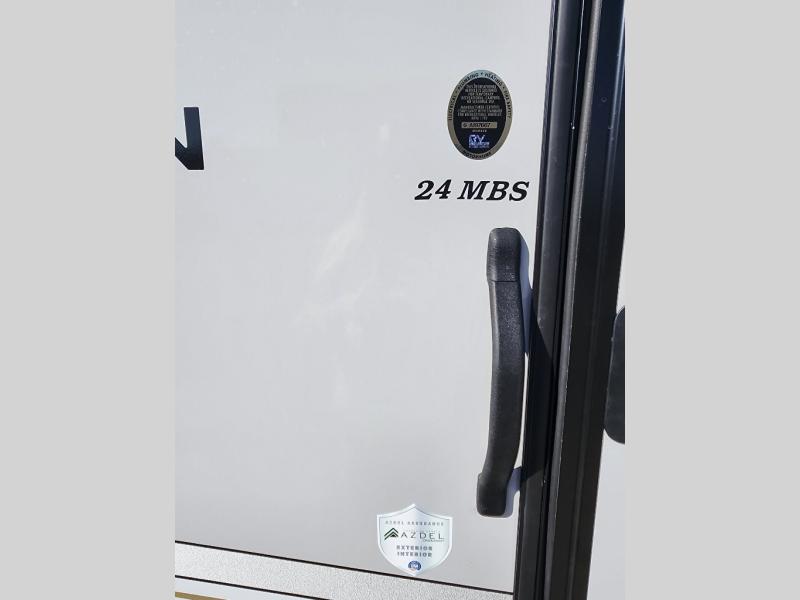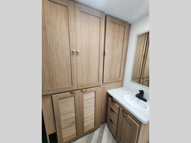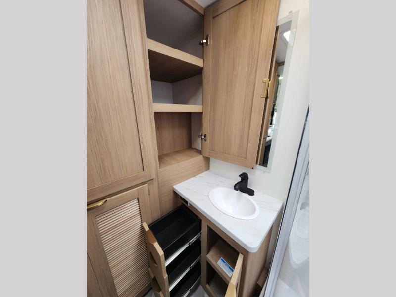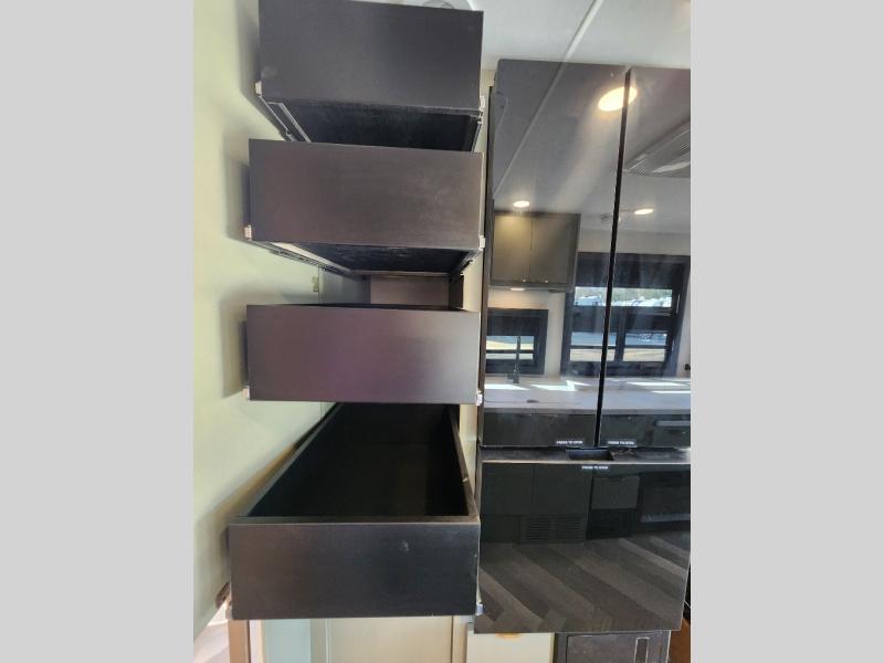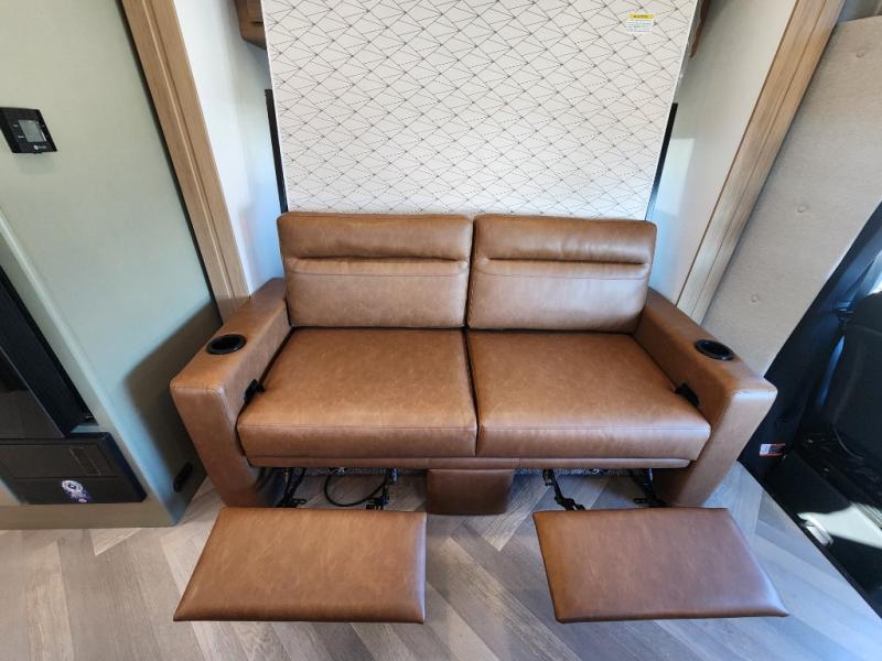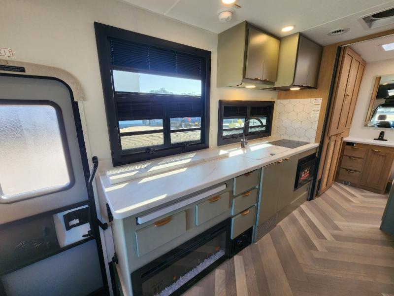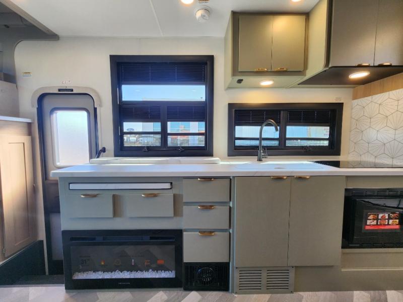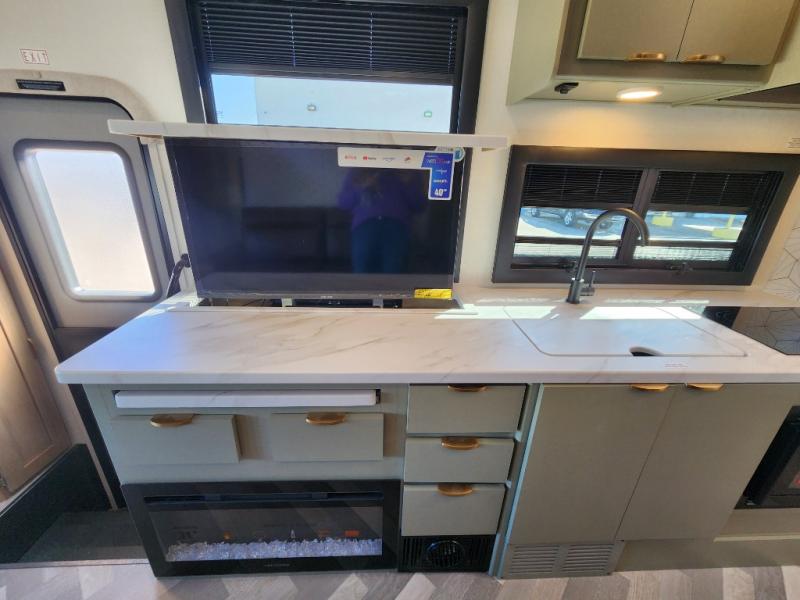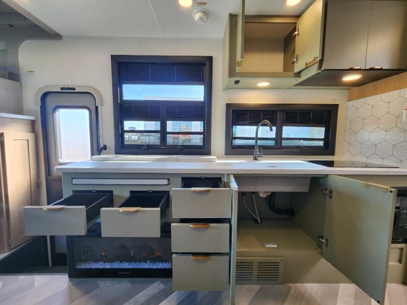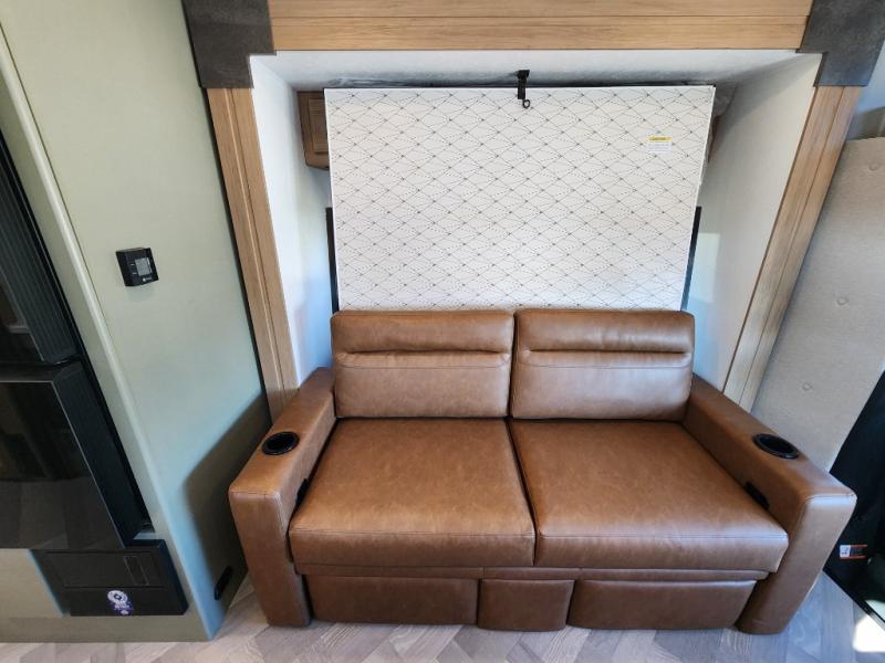 You will enjoy the versatility that this Murphy bed model provides. Depending on whether it is daytime or evening will determine if you have a 60" x 74" bed that slides out or a 62" sofa to enjoy. There is a 45" x 76" bunk over cab that can be used for added sleeping for two more guests or used as added storage space. The rear full bath is spacious and private and includes a 35" x 35" angled shower, toilet, vanity with sink, plus linen cabinet, and wardrobe. The kitchen features everything needed to create meals while on the go, and a cozy fireplace is included beneath the coach TV for your enjoyment.