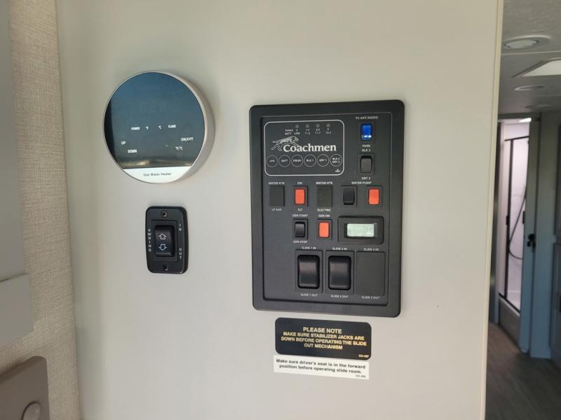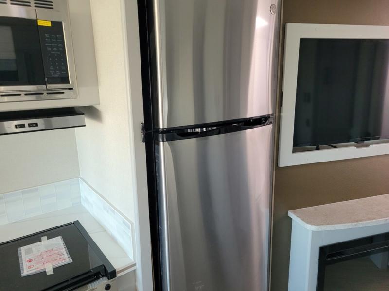 Enjoy a home away from home with this motorhome! The drop-down bunk over cab provides an extra sleeping space but can be stored away when not needed. Prepare your best home cooked meals while on the road with the stainless steel three burner cooktop and 12V stainless steel double door 10 cu. ft. refrigerator then enjoy them at the 42" x 72" booth dinette. Relax in true comfort on the 68" theater sofa across from the Smart TV and fireplace. After a long day of traveling, you can freshen up in the 26" x 38" shower while another uses the private toilet and sink. The rear private bedroom has a 72" x 76" king bed slide with a CPAP station above it and across from it there is a wardrobe, an LED TV, storage space, and washer and dryer prep!