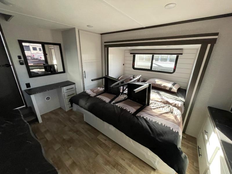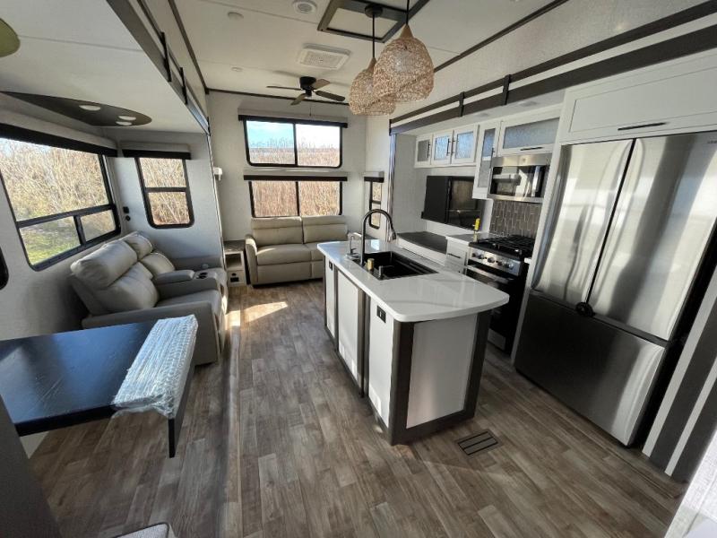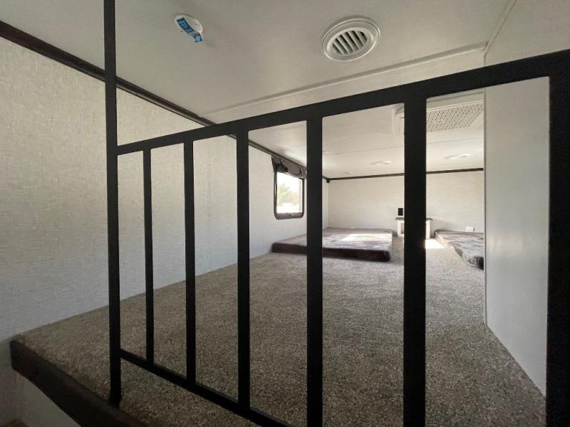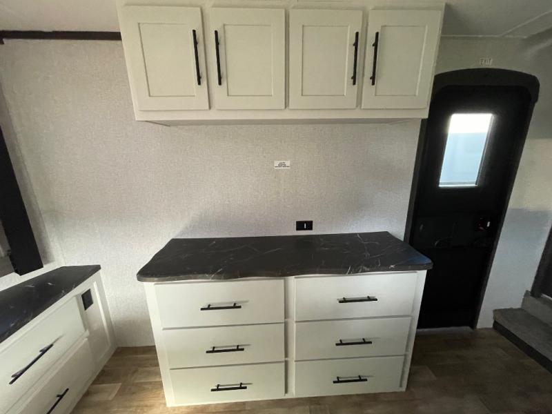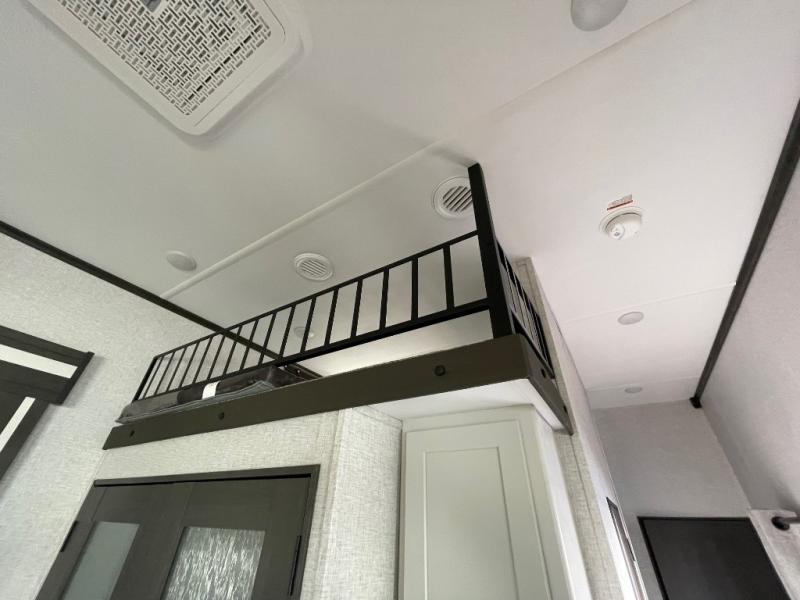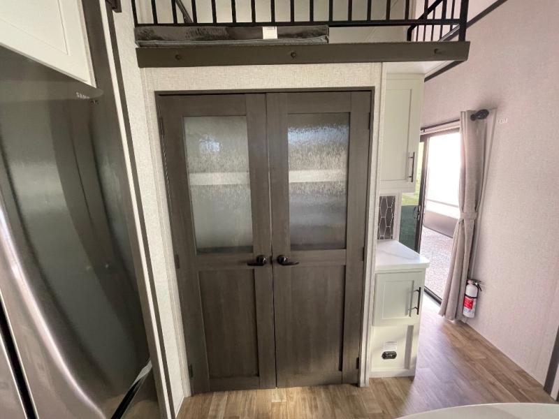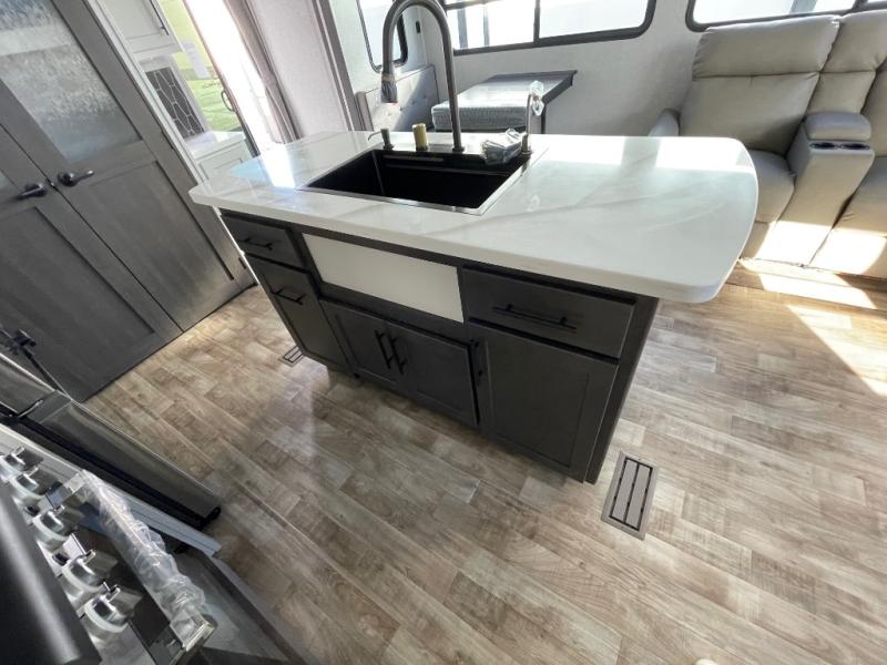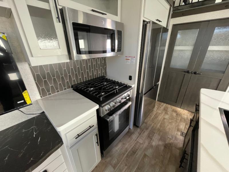 You can comfortably sleep seven people in this destination trailer, so invite more friends along! The little ones are sure to love the loft areas above the bedroom and bathroom. You will have the front private bedroom all to yourselves with a king bed slide out and plenty of space to relax and store your things. If you have any other guests, they can sleep on the hide-a-bed sofa at the back of the trailer. You will find everything you need in this residential kitchen with an island, an Insignia four burner cooktop, plus a double door pantry with shelves. And when your day is over you can relax in the rear living area on the theater seating across from the 50" lift TV and fireplace!