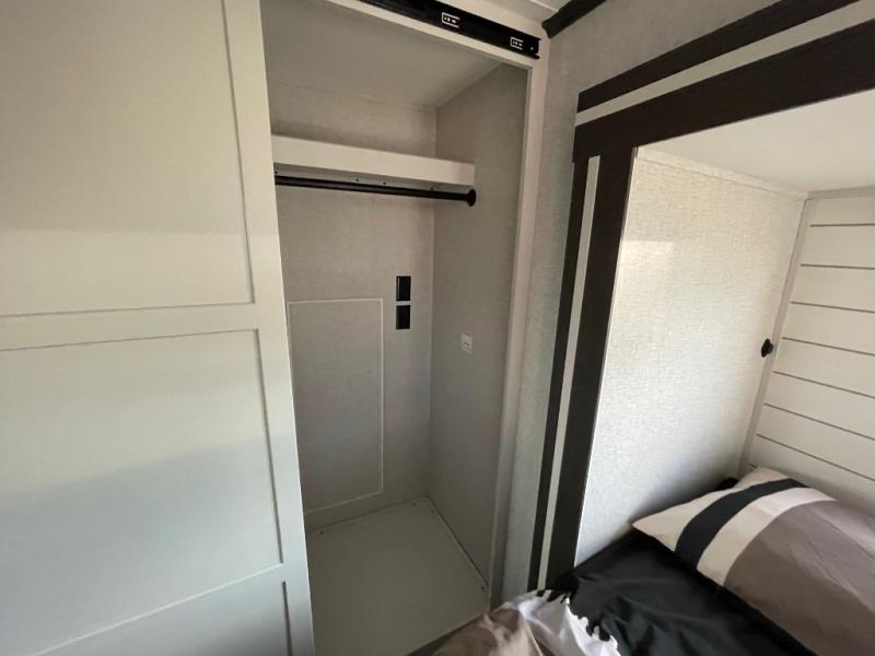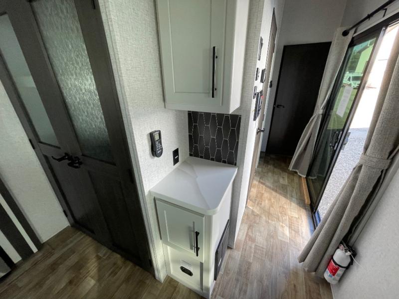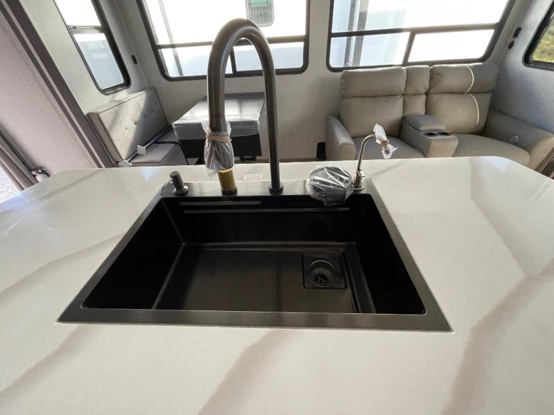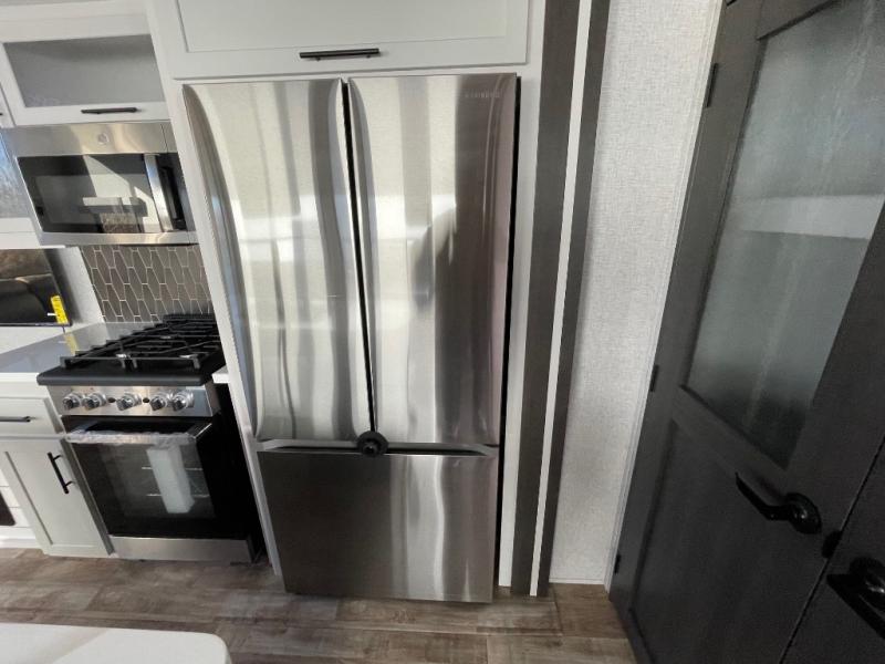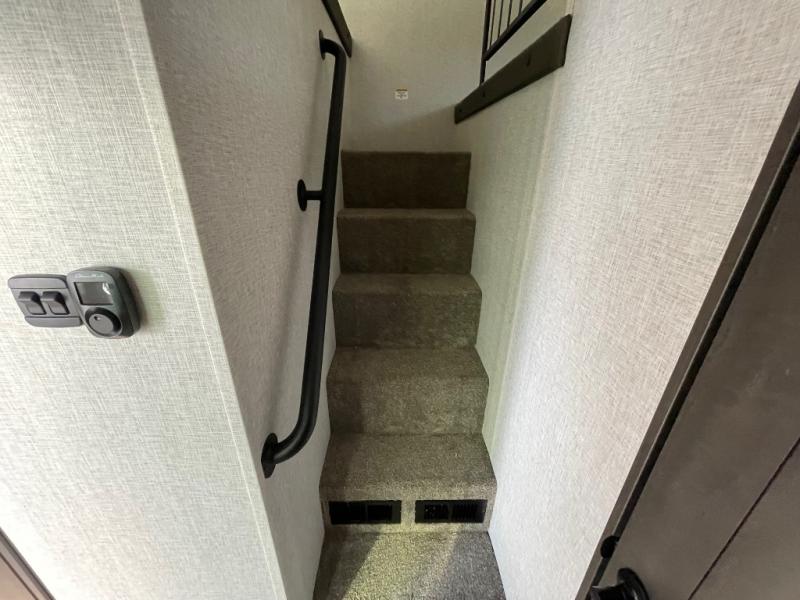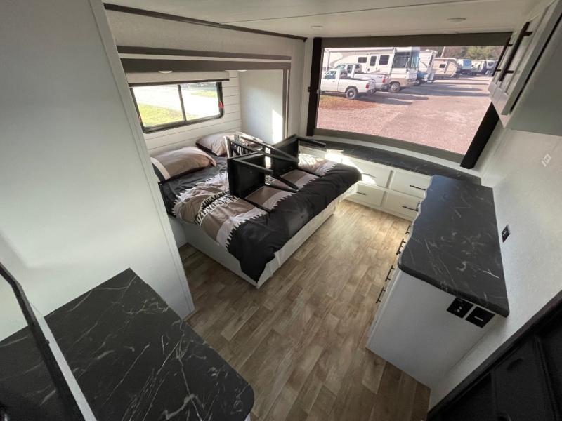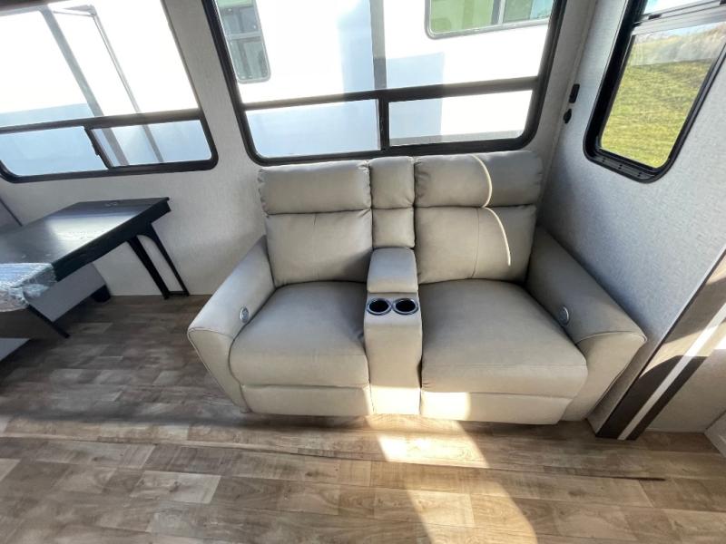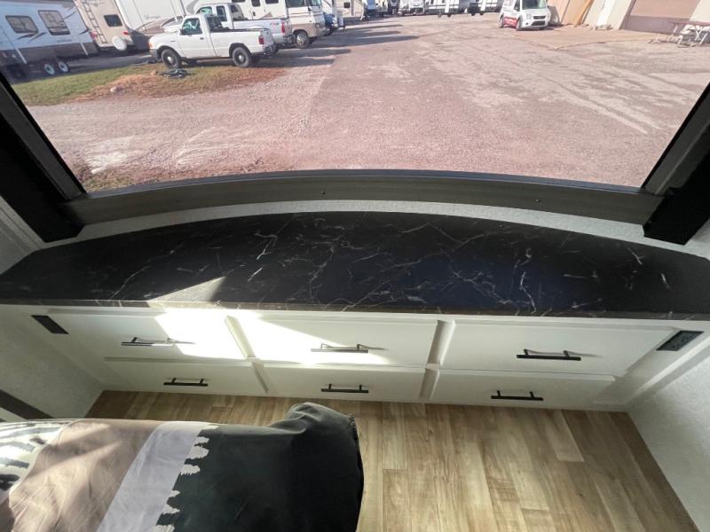 You can comfortably sleep seven people in this destination trailer, so invite more friends along! The little ones are sure to love the loft areas above the bedroom and bathroom. You will have the front private bedroom all to yourselves with a king bed slide out and plenty of space to relax and store your things. If you have any other guests, they can sleep on the hide-a-bed sofa at the back of the trailer. You will find everything you need in this residential kitchen with an island, an Insignia four burner cooktop, plus a double door pantry with shelves. And when your day is over you can relax in the rear living area on the theater seating across from the 50" lift TV and fireplace!
