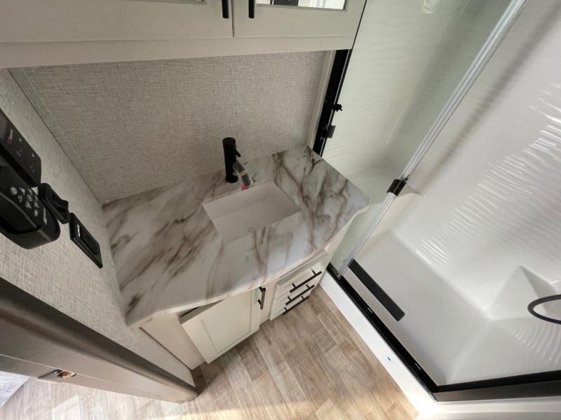 Each Hampton destination trailer by CrossRoads RV includes a one-piece fiberglass front cap, tinted glass windows, and an outside faucet that will surely come in handy when wanting to rinse off your hands or even shoes after exploring outdoors. Each is constructed with a fiberglass roof and floor insulation with radiant tech foil, an enclosed underbelly, and severe weather welded mounts and rain gutters along the entire roof line. And, the Convenience package that comes standard includes KeyTV, a microwave, a quilted bedspread, a power vent in the bathroom, and more. Other interior features offered include decorative accent lighting, a 9-foot floor to ceiling height, a patio door with a swing-out assist rail, and two-toned wood fascia. So choose your destination, select your favorite Hampton, and start feeling at home when you are actually on vacation!