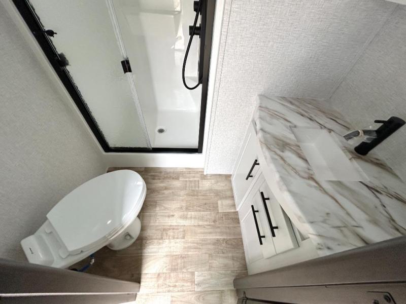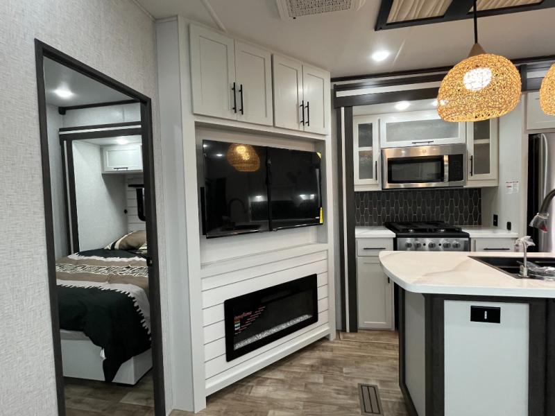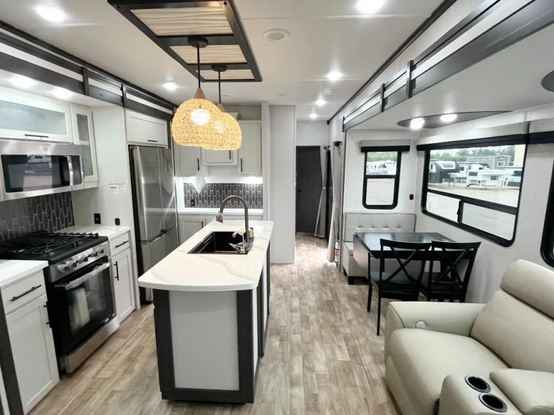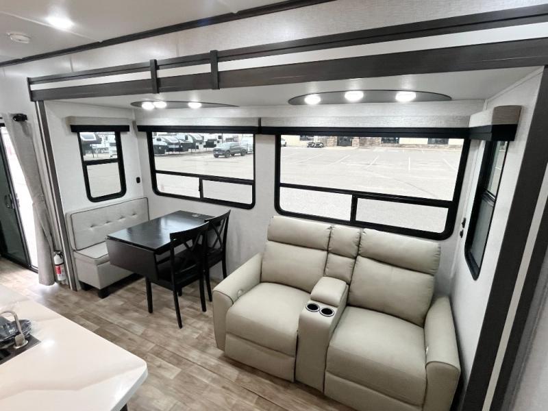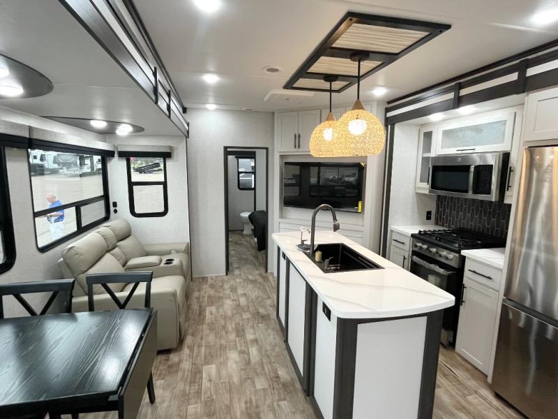 Wow! Check out this destination trailer with four slides, two private bedrooms, and two full baths! Now you can camp for longer periods of time and soak up the nature around you. The kitchen island includes plenty of counter space, a deep stainless steel sink for easy clean up, and a hutch for more storage. After dinner is cleaned up you can relax on the power theater seating in great view of the 50" TV, or you may just want to play a game of cards at the free-standing table with chairs and a bench seat.