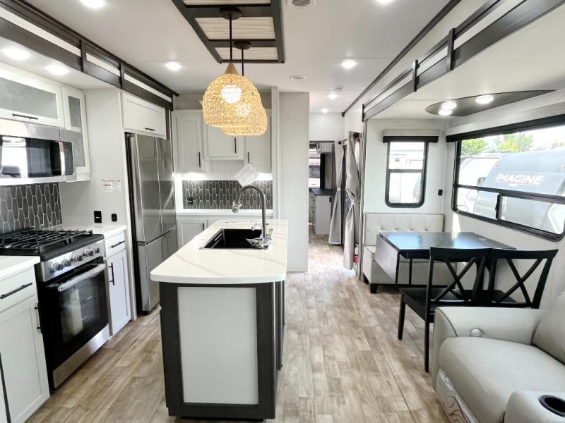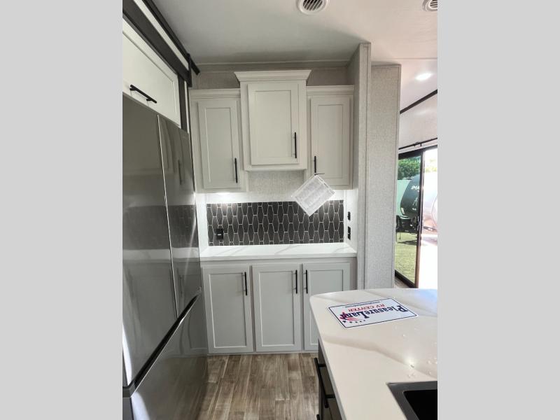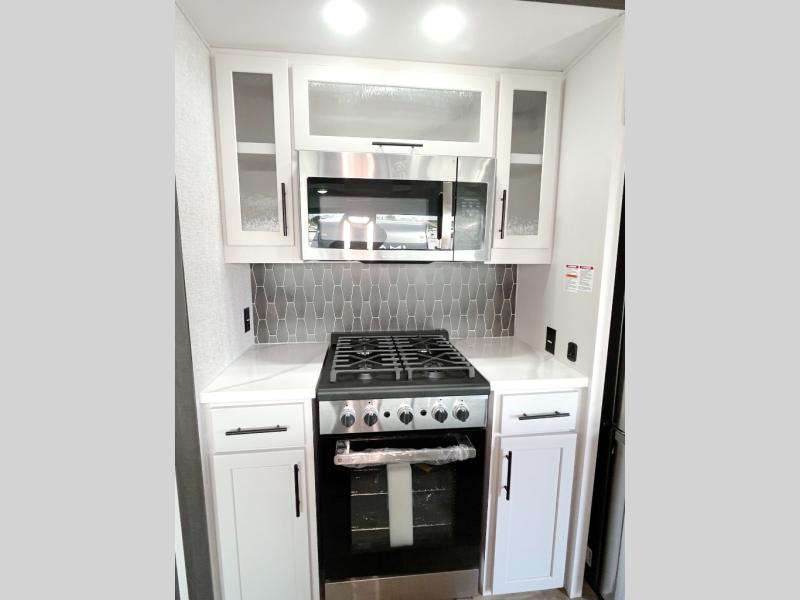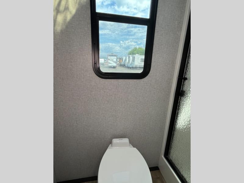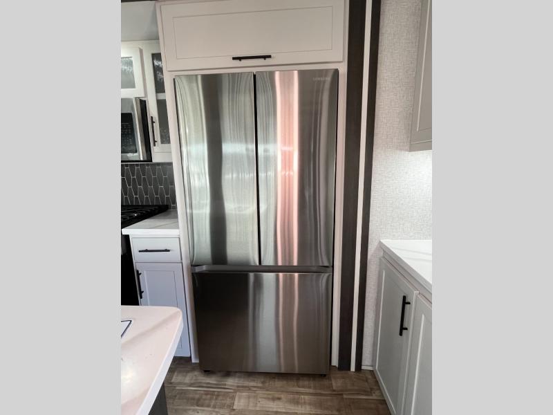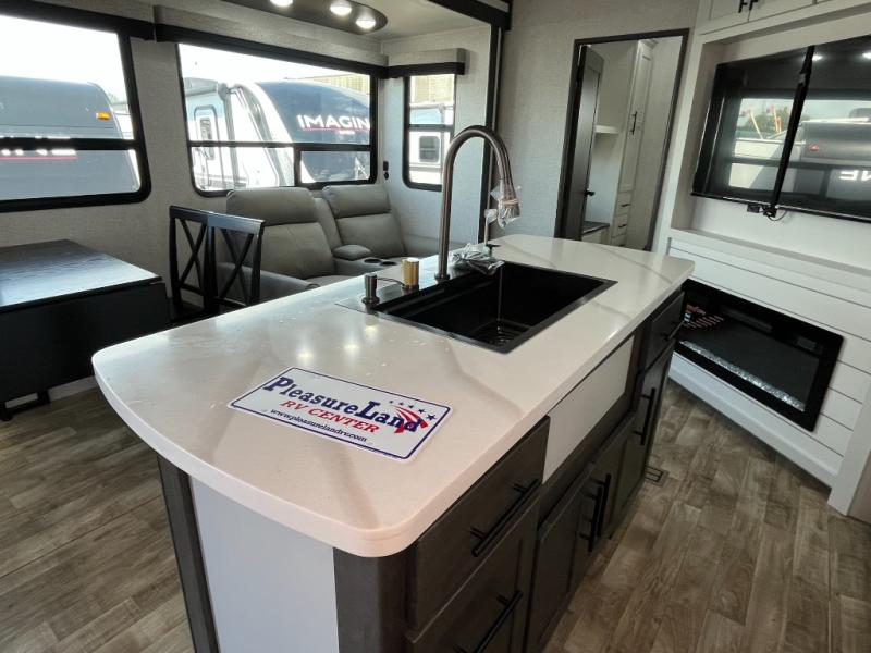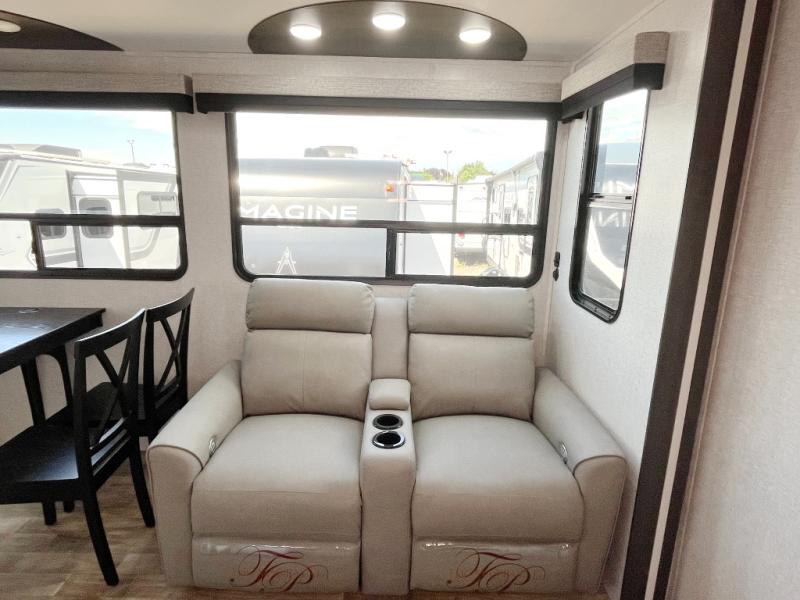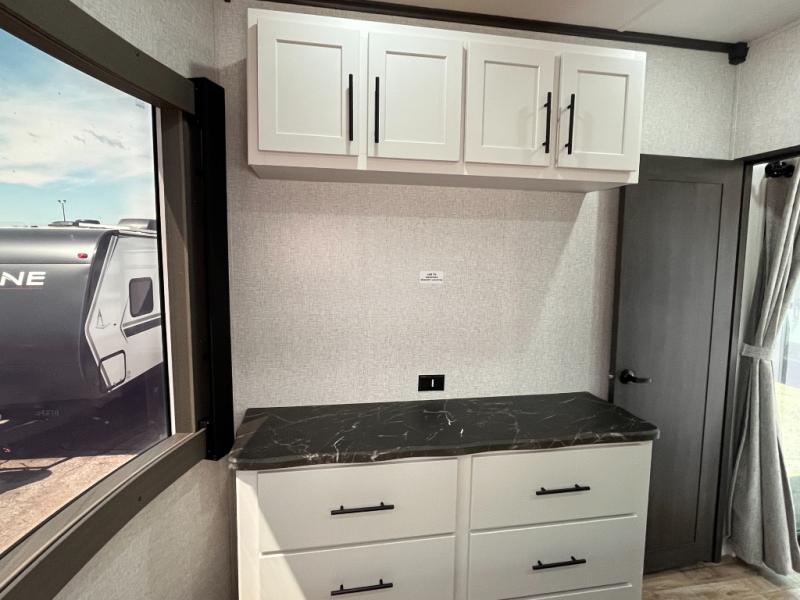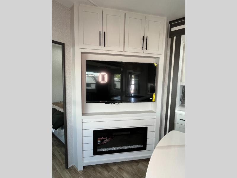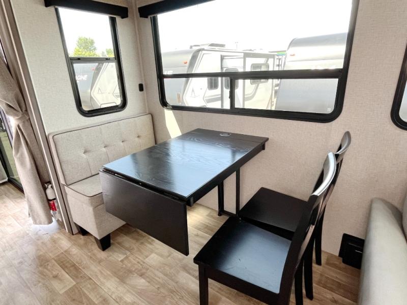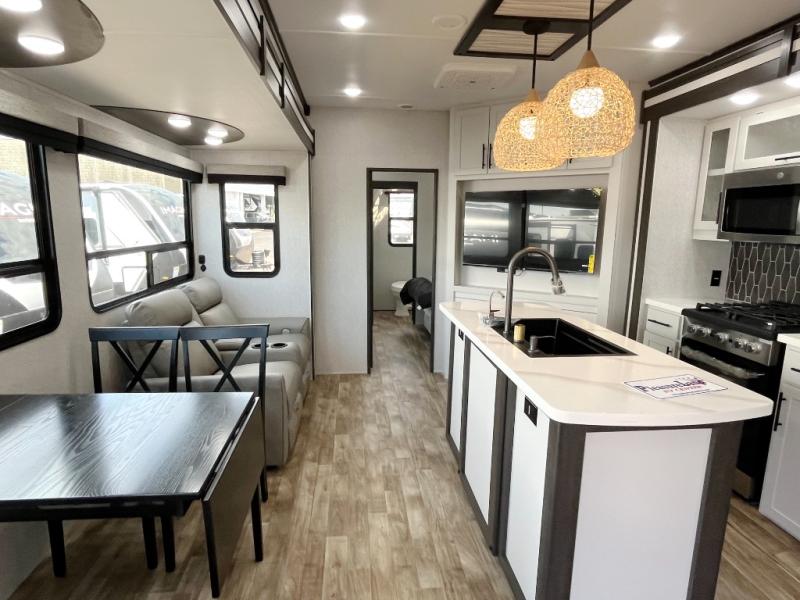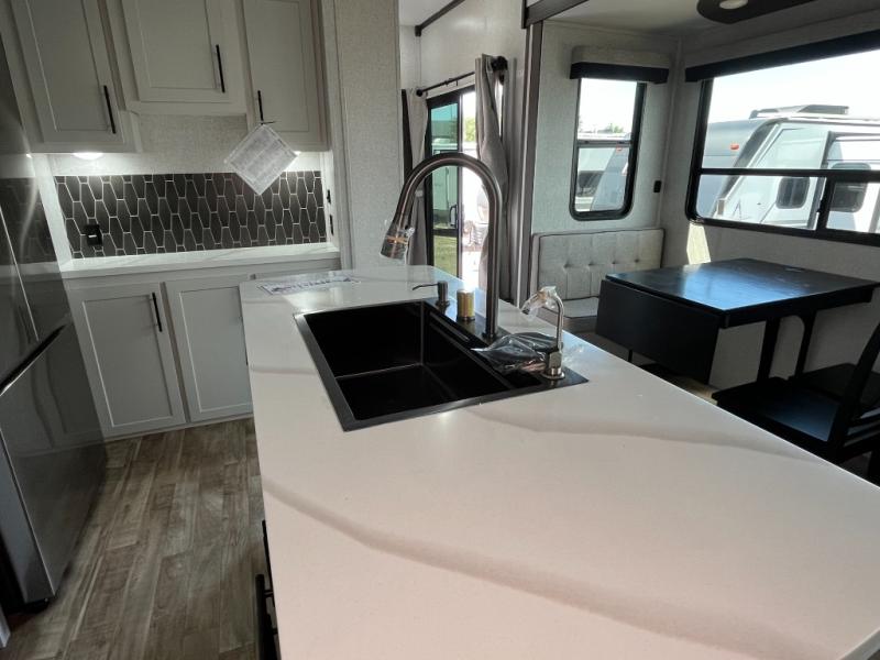 Wow! Check out this destination trailer with four slides, two private bedrooms, and two full baths! Now you can camp for longer periods of time and soak up the nature around you. The kitchen island includes plenty of counter space, a deep stainless steel sink for easy clean up, and a hutch for more storage. After dinner is cleaned up you can relax on the power theater seating in great view of the 50" TV, or you may just want to play a game of cards at the free-standing table with chairs and a bench seat.