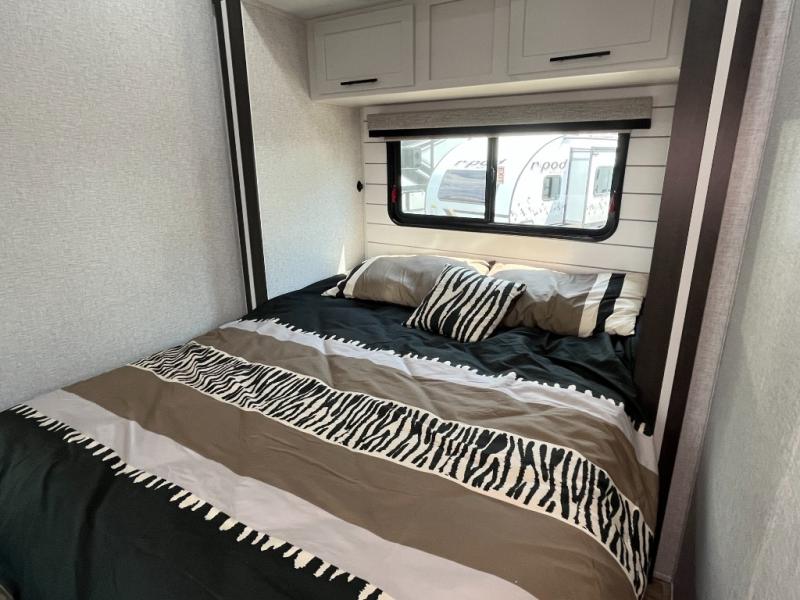 Each Hampton destination trailer by CrossRoads RV includes a one-piece fiberglass front cap, tinted glass windows, and an outside faucet that will surely come in handy when wanting to rinse off your hands or even shoes after exploring outdoors. Each is constructed with a fiberglass roof and floor insulation with radiant tech foil, an enclosed underbelly, and severe weather welded mounts and rain gutters along the entire roof line. And, the Convenience package that comes standard includes KeyTV, a microwave, a quilted bedspread, a power vent in the bathroom, and more. Other interior features offered include decorative accent lighting, an 8-foot floor to ceiling height, a patio door with a swing-out assist rail, and two-toned wood fascia. So choose your destination, select your favorite Hampton, and start feeling at home when you are actually on vacation!