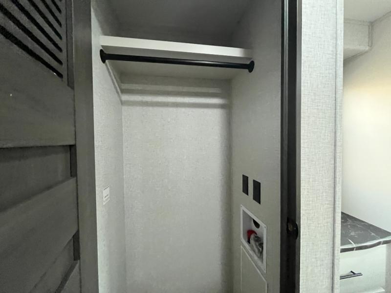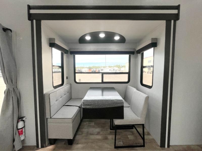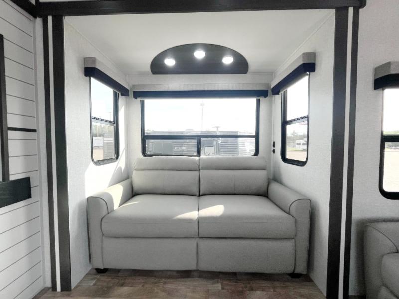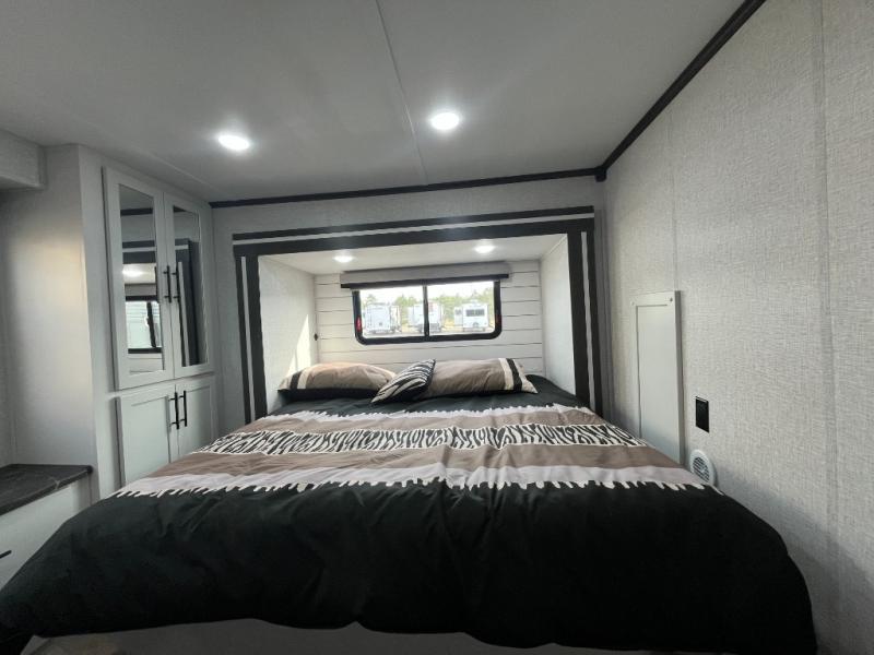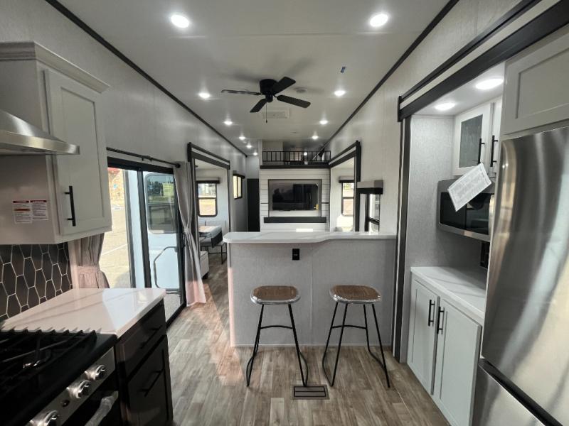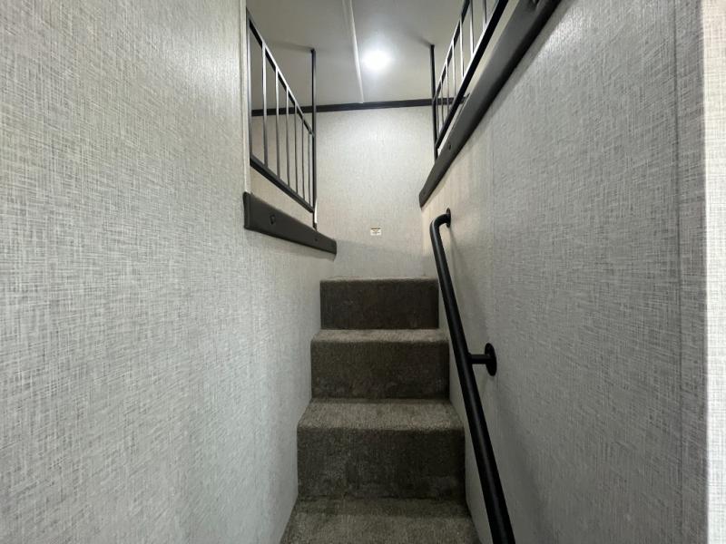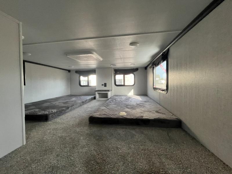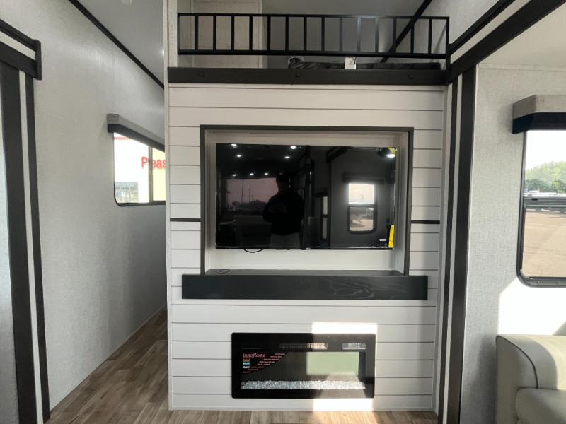 Are you looking for a destination trailer that can fit your whole crew? Look no further than this unit with four slides, three bunk mats in the loft areas, plus a spacious full bath that will allow everyone to stay clean each day. The front kitchen is any chef's dream with its ample counter space, pantry/cabinet, residential four burner range, and residential refrigerator. After dinner is cleaned up, everyone can meet in the middle living area to watch a movie on the 50" TV, and the fireplace here will make it feel more like home.