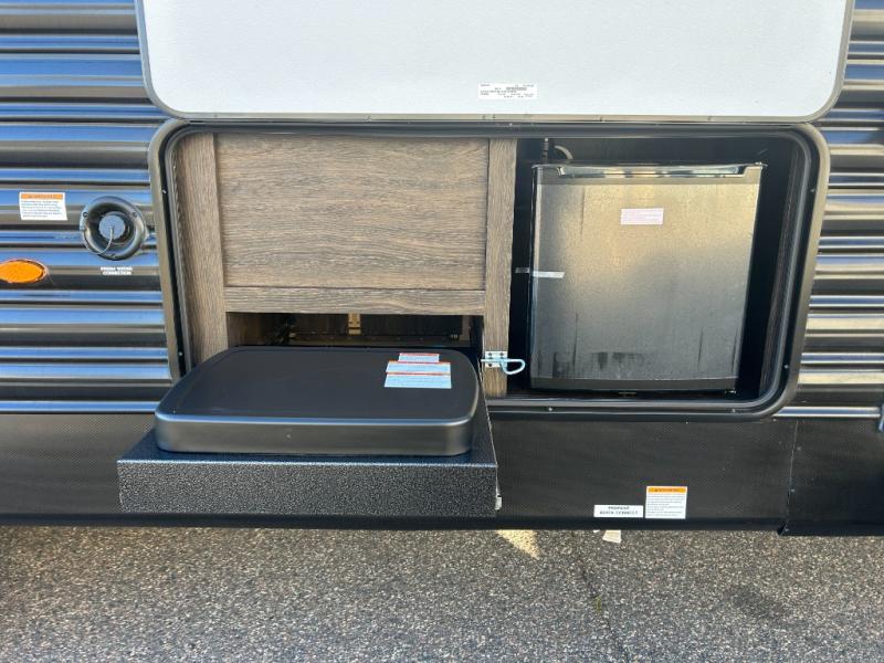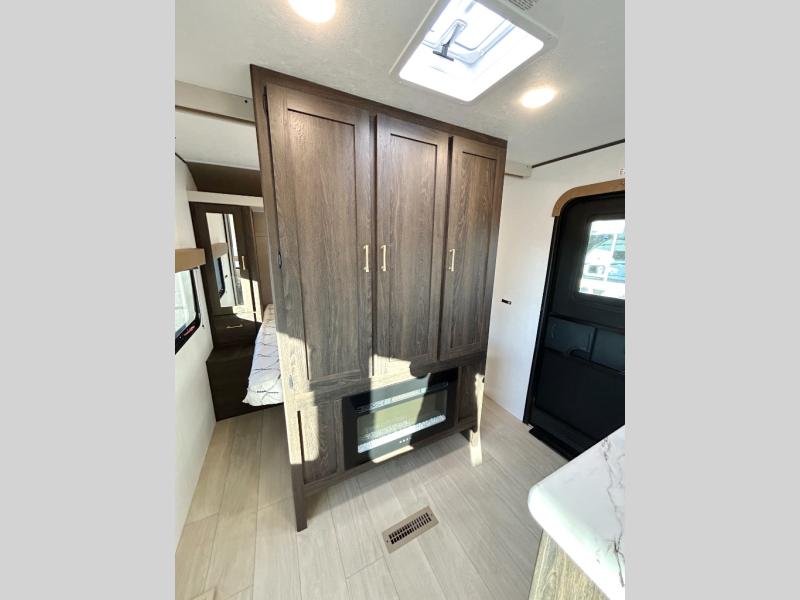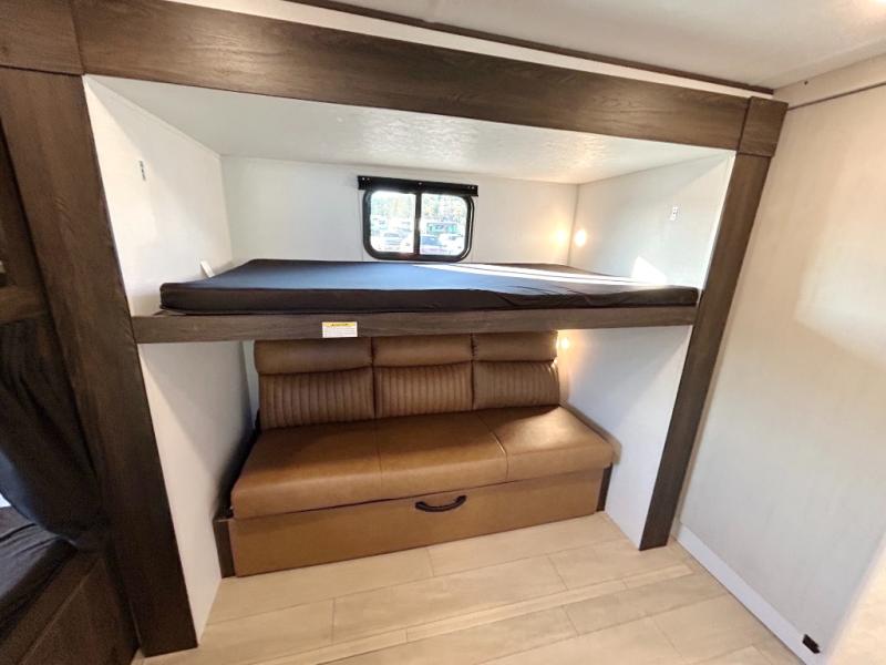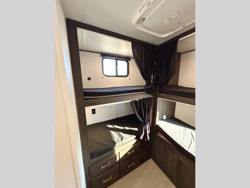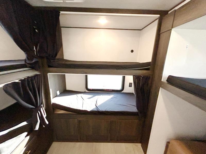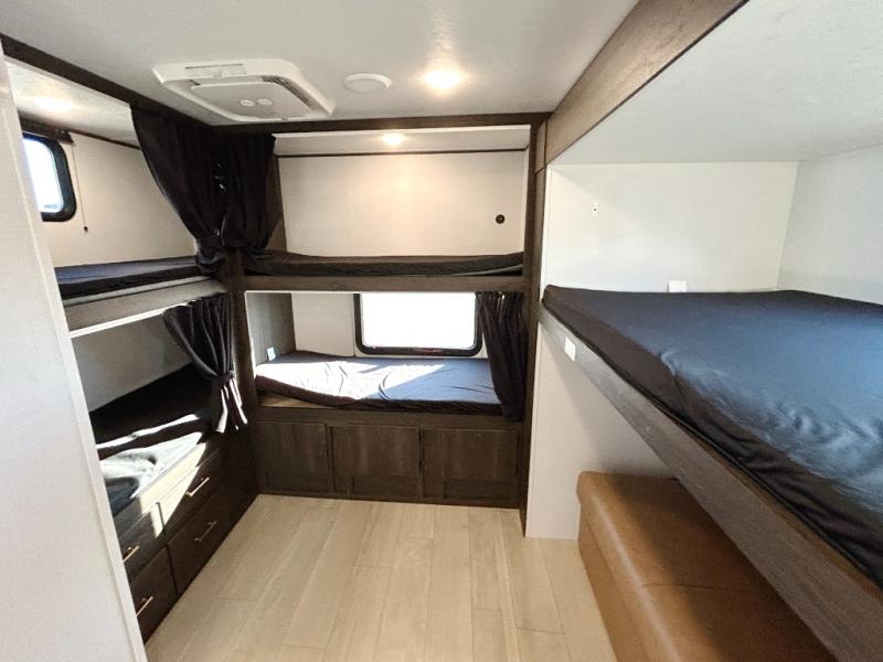 With dual entry doors, you will experience a smooth flow of traffic in and out of this travel trailer! The rear private bunkhouse includes two sets of bunk beds plus a fifth bunk over a jack knife sofa, so your kids can invite a few friends to come along. Across from the full bathroom is a linen closet to keep your towels close by and a U-shaped dinette to enjoy your meals at, play games, and even transform into an extra sleeping space. At night you can either relax on the 60" jackknife sofa by the fireplace or head to the front private bedroom and lie down on the 60" x 74" RV queen bed with closets on either side to keep your clothes looking their best!