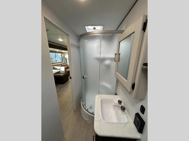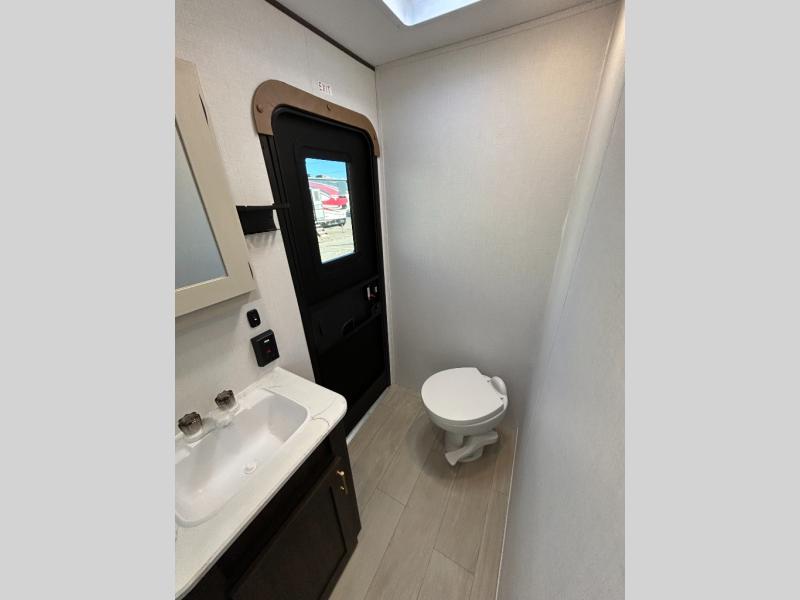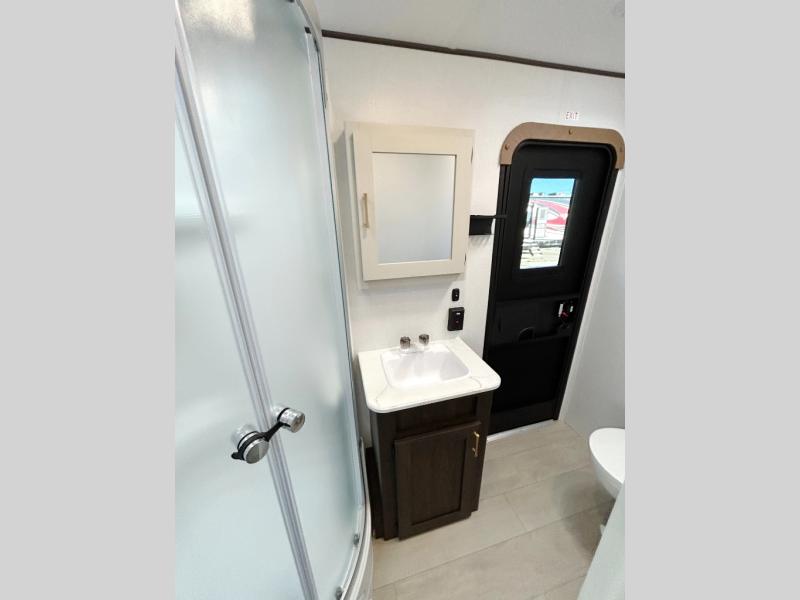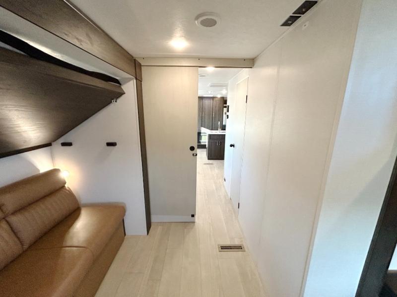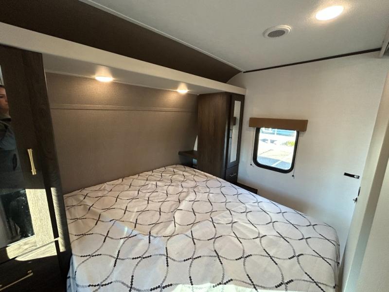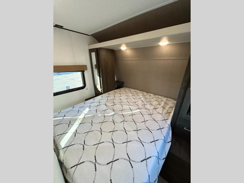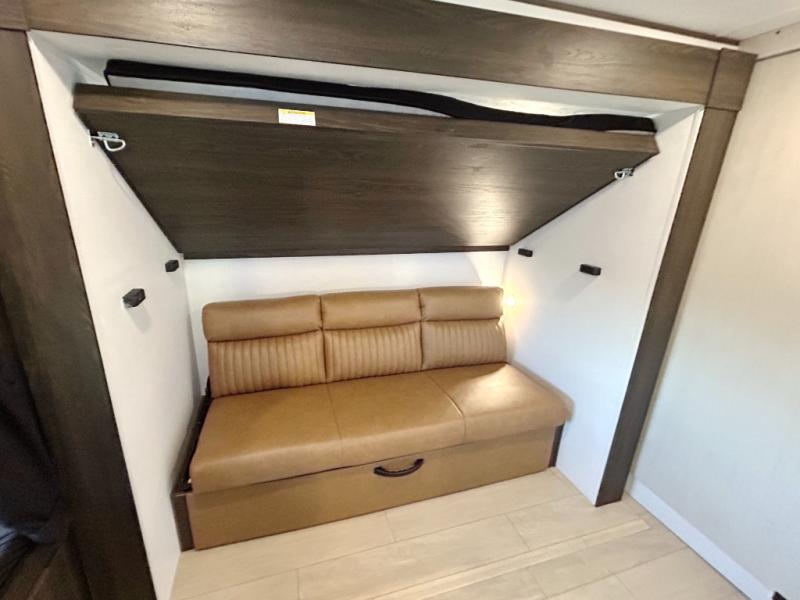 With dual entry doors, you will experience a smooth flow of traffic in and out of this travel trailer! The rear private bunkhouse includes two sets of bunk beds plus a fifth bunk over a jack knife sofa, so your kids can invite a few friends to come along. Across from the full bathroom is a linen closet to keep your towels close by and a U-shaped dinette to enjoy your meals at, play games, and even transform into an extra sleeping space. At night you can either relax on the 60" jackknife sofa by the fireplace or head to the front private bedroom and lie down on the 60" x 74" RV queen bed with closets on either side to keep your clothes looking their best!