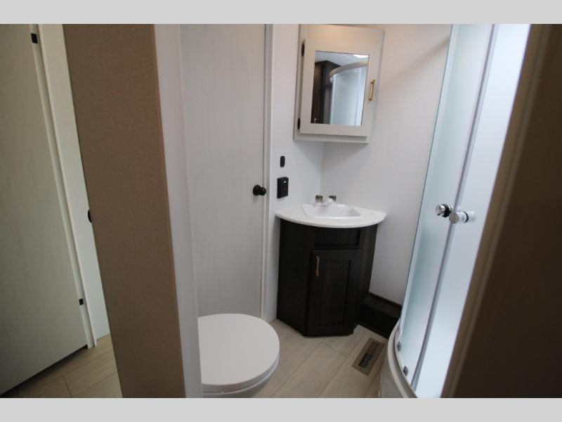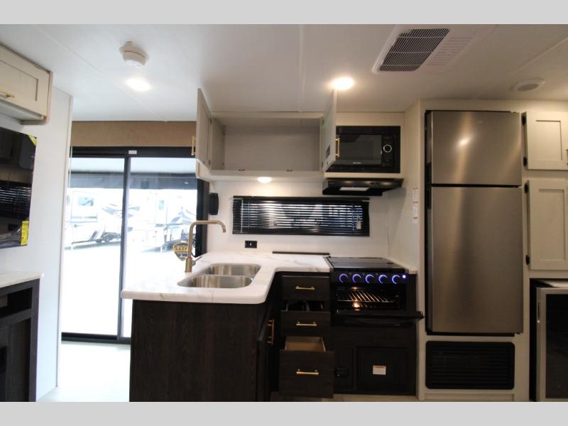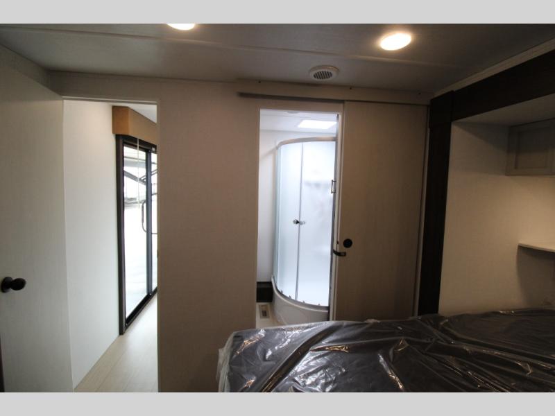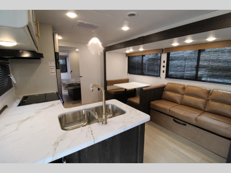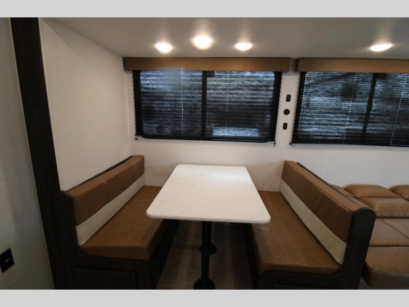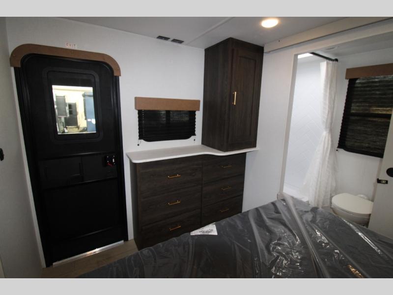 Pack your bags and invite your friends to tag along in this travel trailer! The master suite has an RV queen bed slide across from a dresser next to a wardrobe and its own rear full bathroom with a 30" x 36" shower. The front private bedroom has a king bed slide across from a dresser and a front wardrobe, washer and dryer prep, plus an entrance into the dual entry bathroom which has a 34" radius shower. Both bedrooms have an entrance/exit door to the unit, and the 60" x 72" patio door leads directly into the kitchen/living area. The chef can prepare delicious meals with the three-burner cooktop then you can enjoy them at the 38" booth dinette next to a 60" jackknife sofa for a relaxing evening by the 50" TV at the entertainment center.