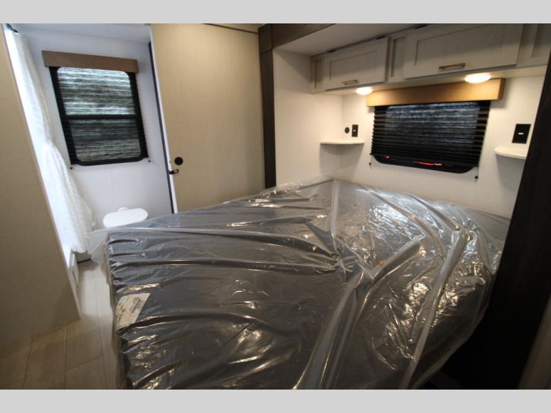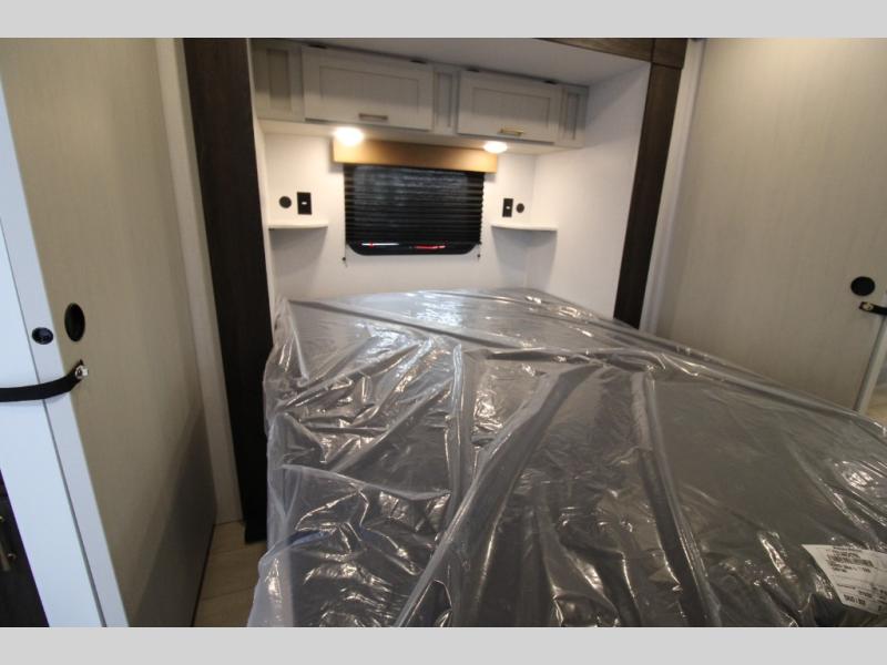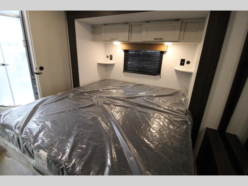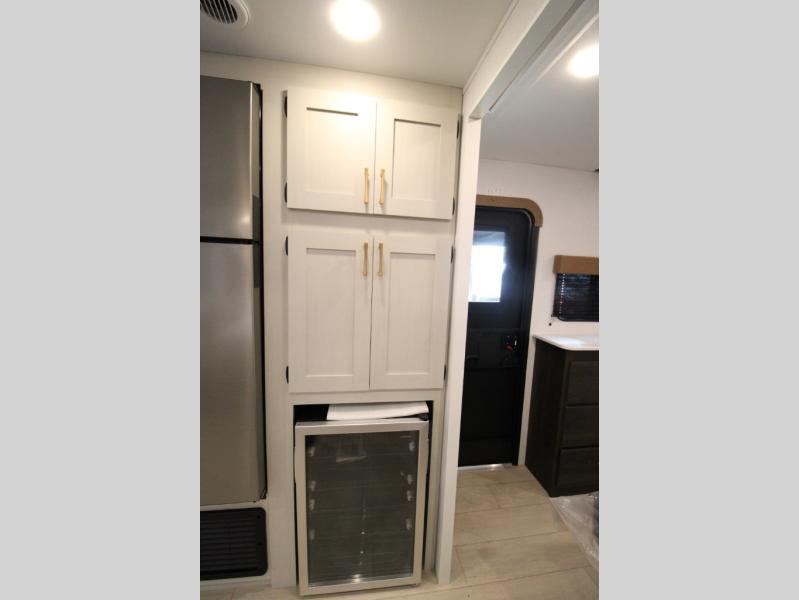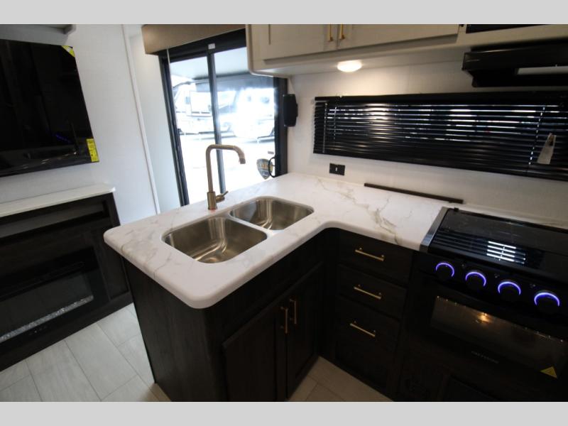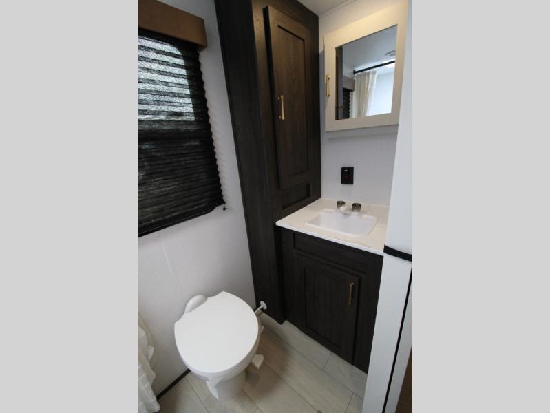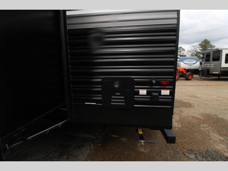 Pack your bags and invite your friends to tag along in this travel trailer! The master suite has an RV queen bed slide across from a dresser next to a wardrobe and its own rear full bathroom with a 30" x 36" shower. The front private bedroom has a king bed slide across from a dresser and a front wardrobe, washer and dryer prep, plus an entrance into the dual entry bathroom which has a 34" radius shower. Both bedrooms have an entrance/exit door to the unit, and the 60" x 72" patio door leads directly into the kitchen/living area. The chef can prepare delicious meals with the three-burner cooktop then you can enjoy them at the 38" booth dinette next to a 60" jackknife sofa for a relaxing evening by the 50" TV at the entertainment center.